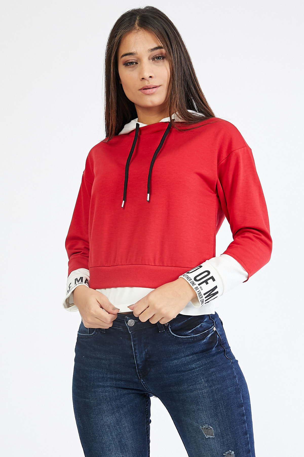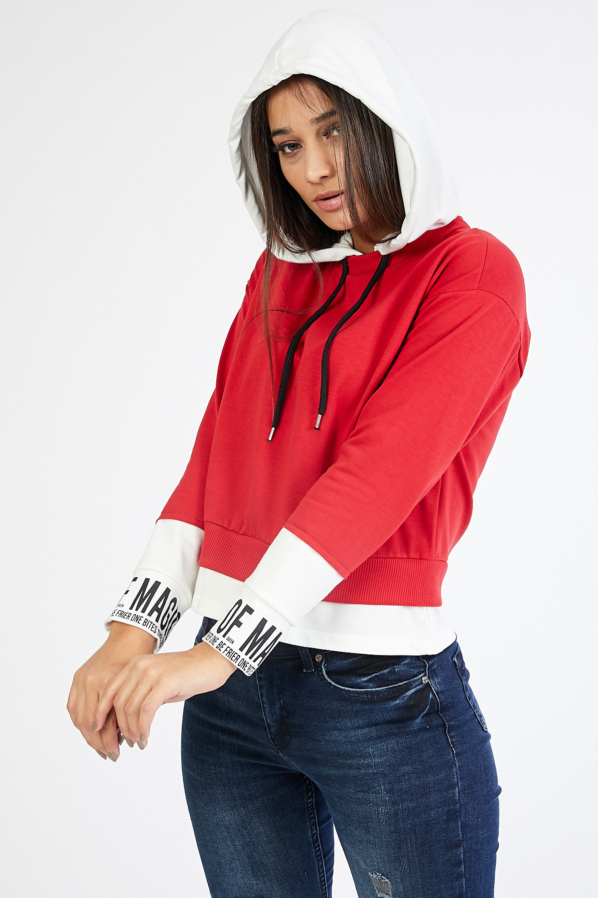 Ürün Özellikleri: Kapüşonlu, bol kalıp, kolları yazı detaylı, iki renk, düz uzun kollu sweatshirt.