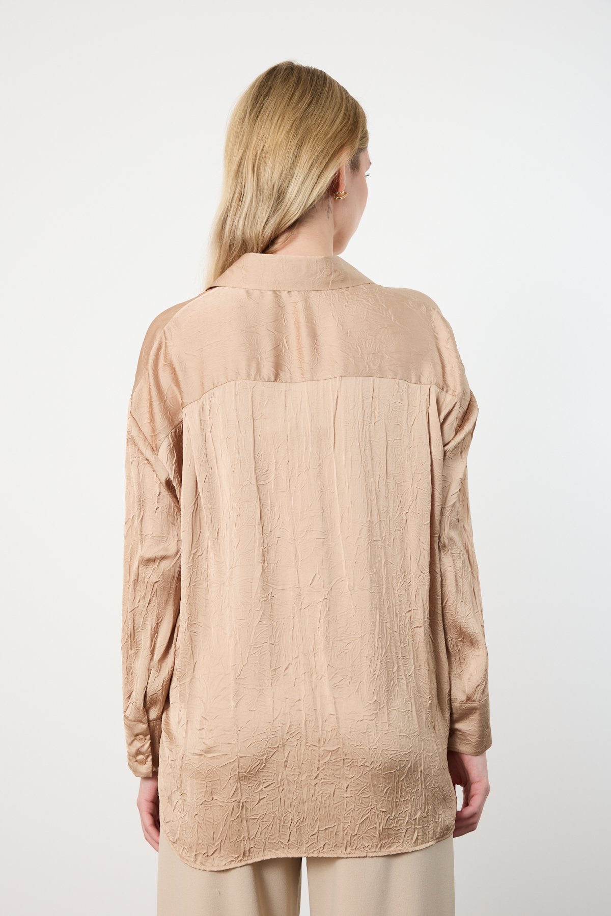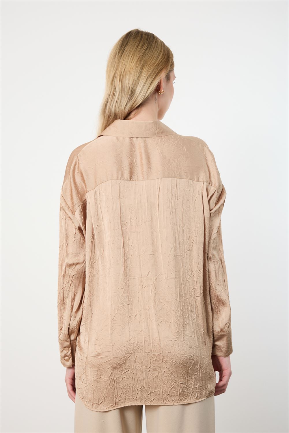 Kraş satenin zarif dokusu ve oversize kesimi ile hem şıklığı hem de rahatlığı bir arada yaşayın! Günlük kombinlerinizin vazgeçilmezi olmaya aday bu gömlek, size mükemmel bir stil sunuyor.