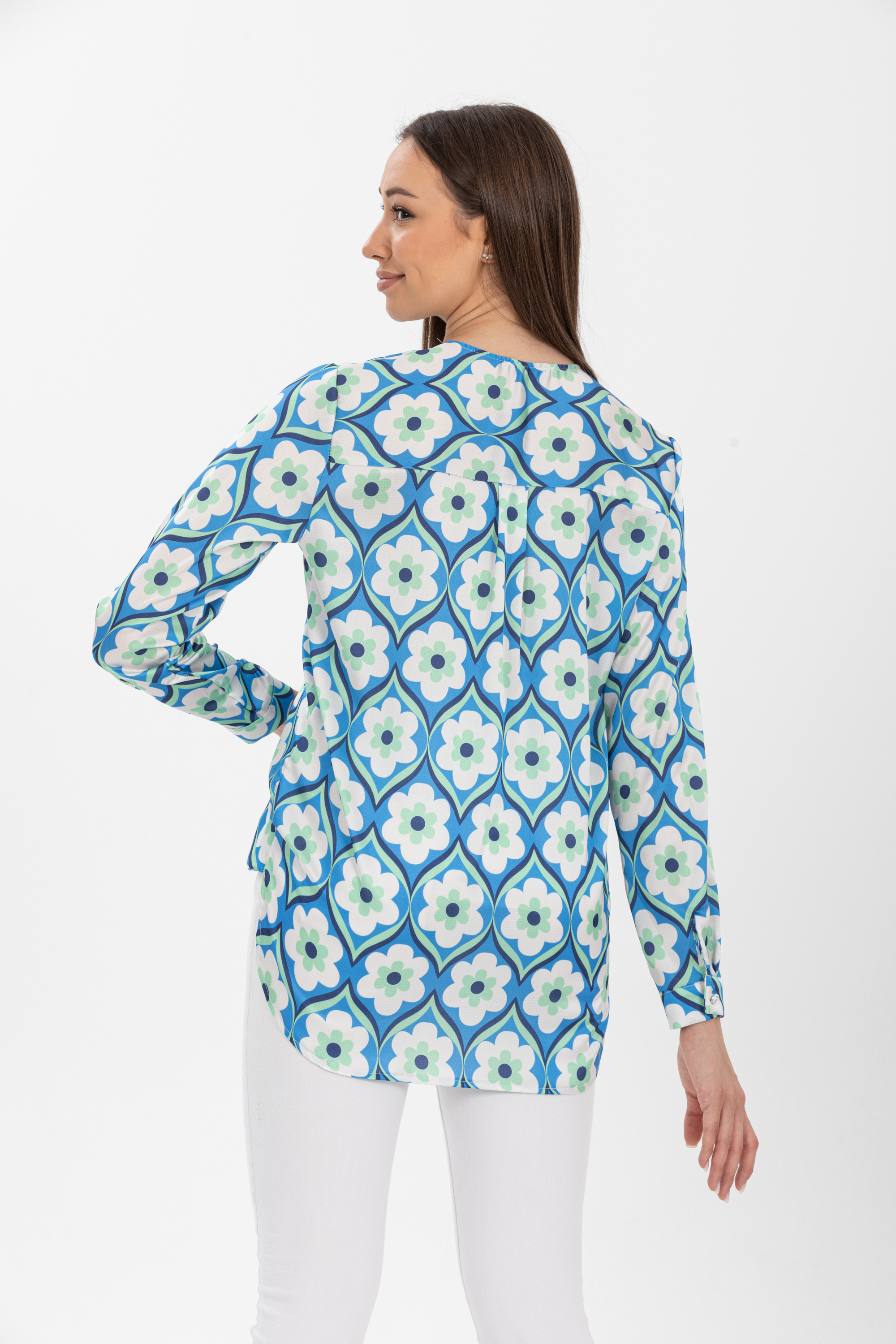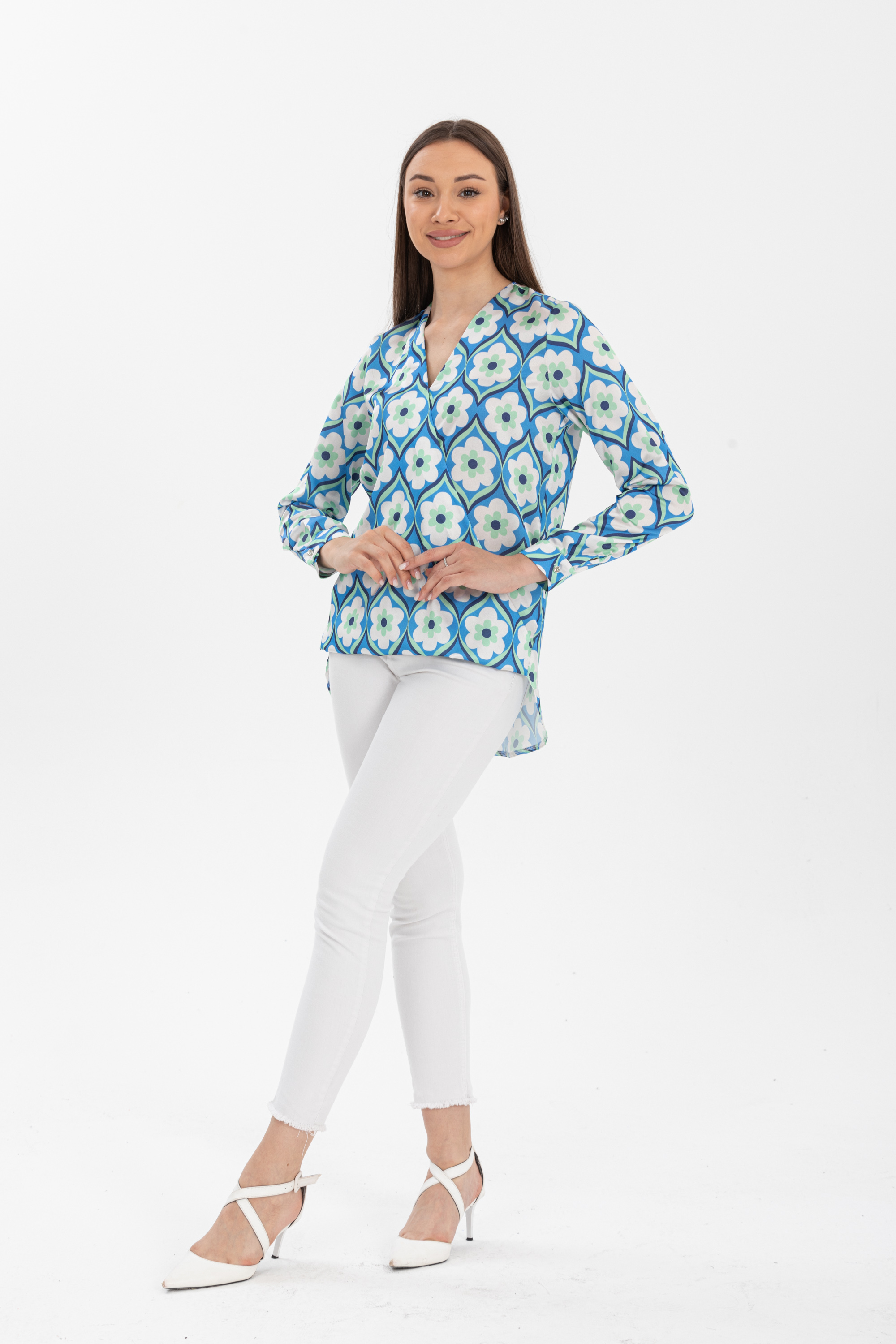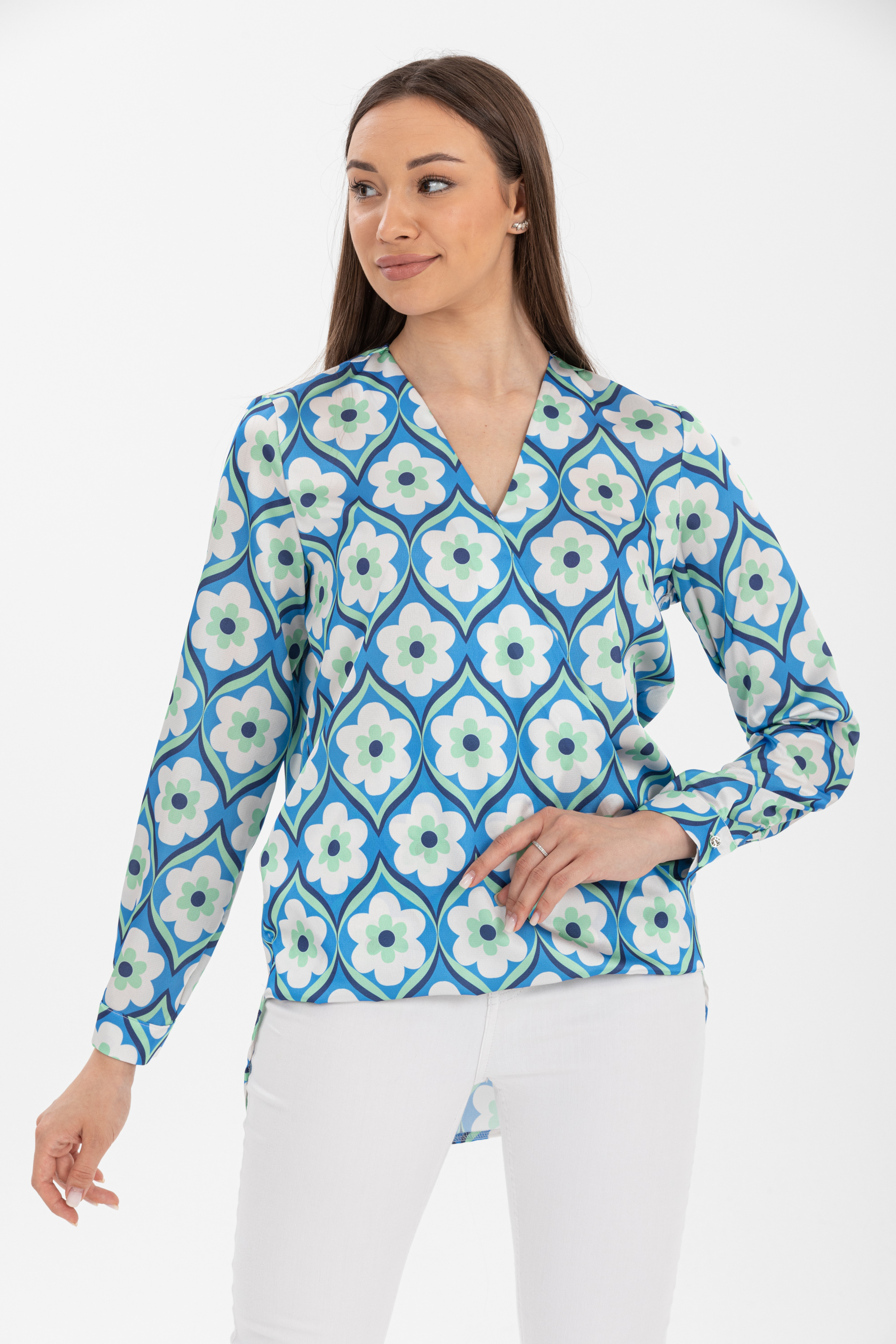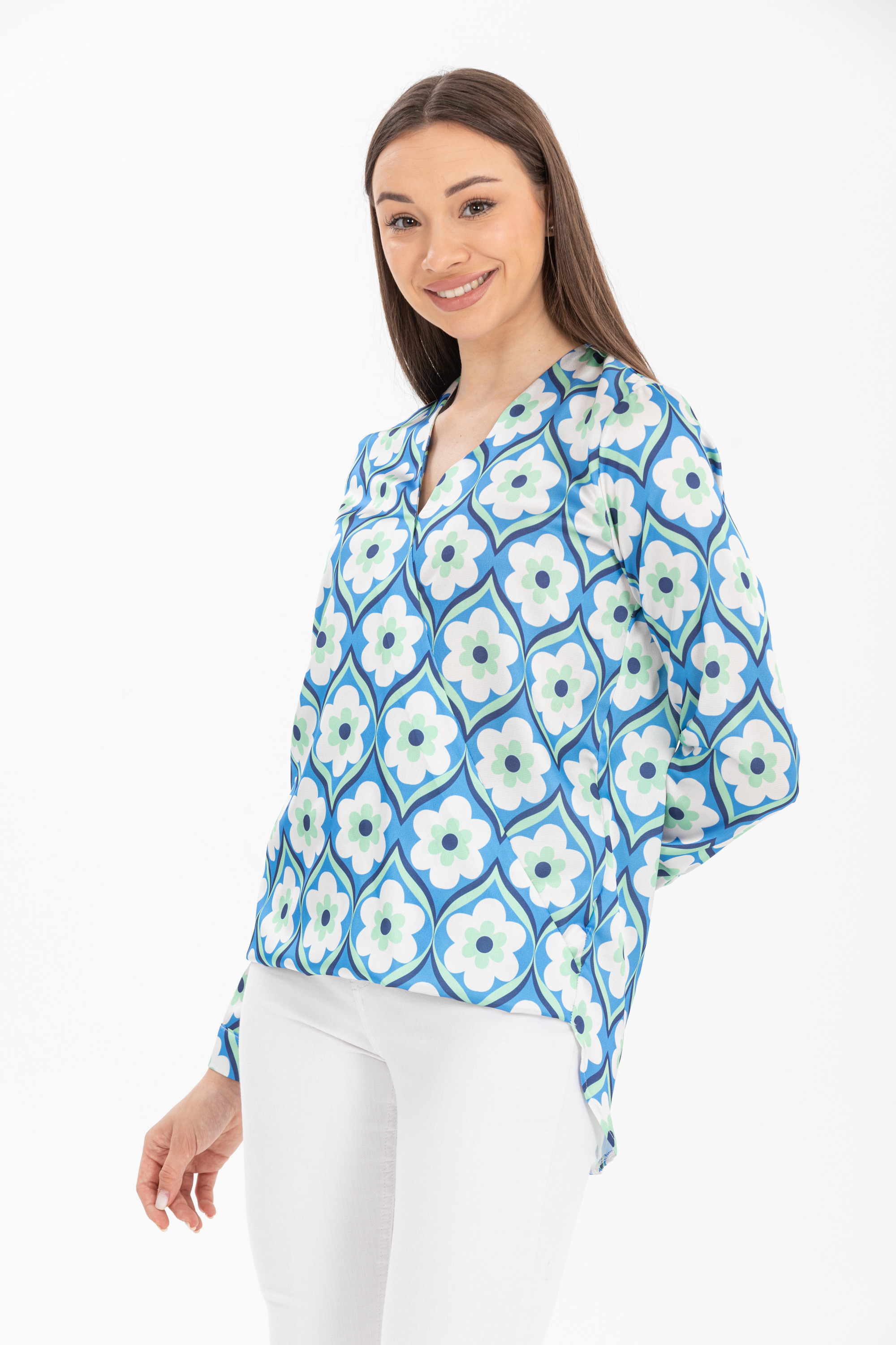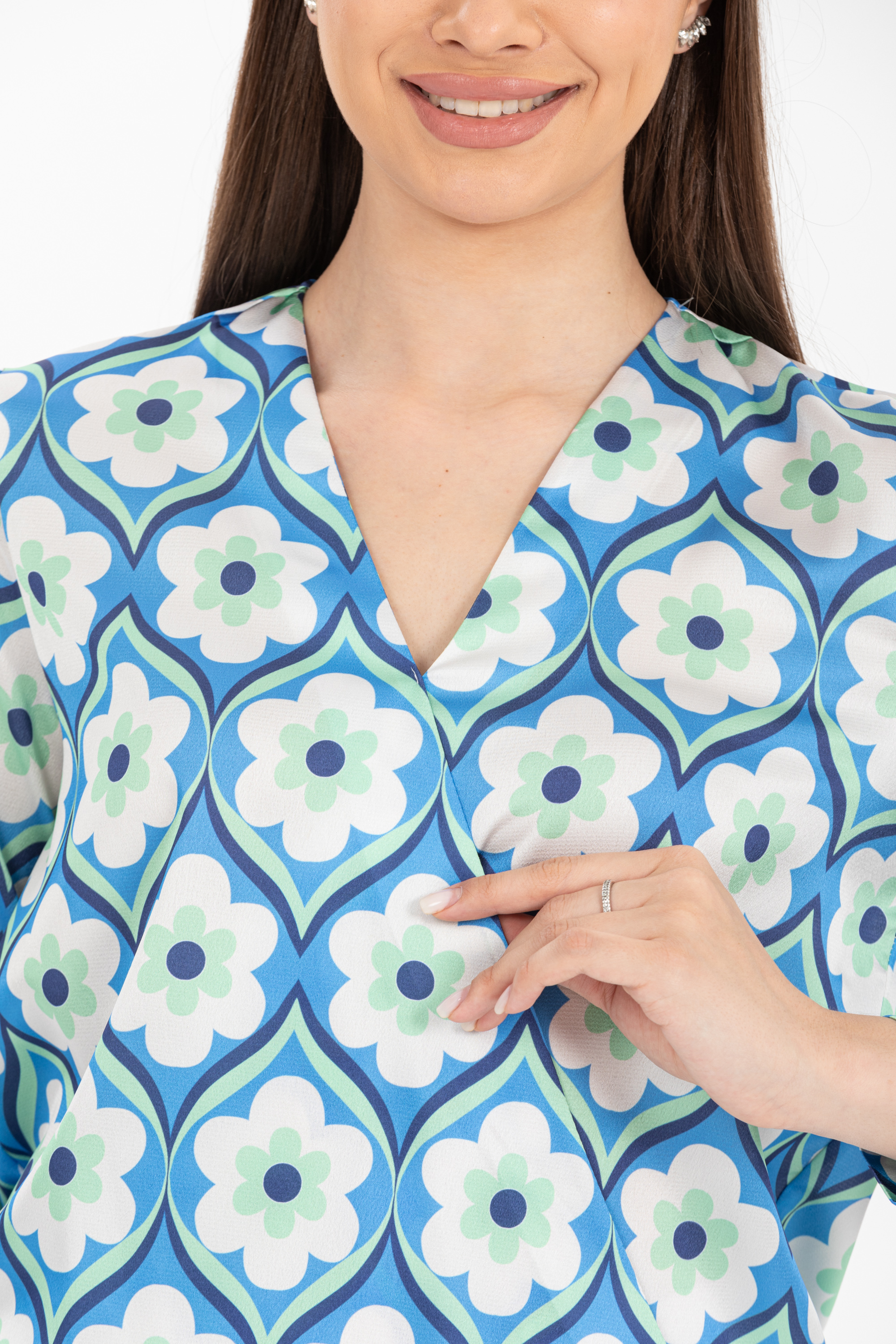 Kruvaze Yaka Desenli Saten Bluz