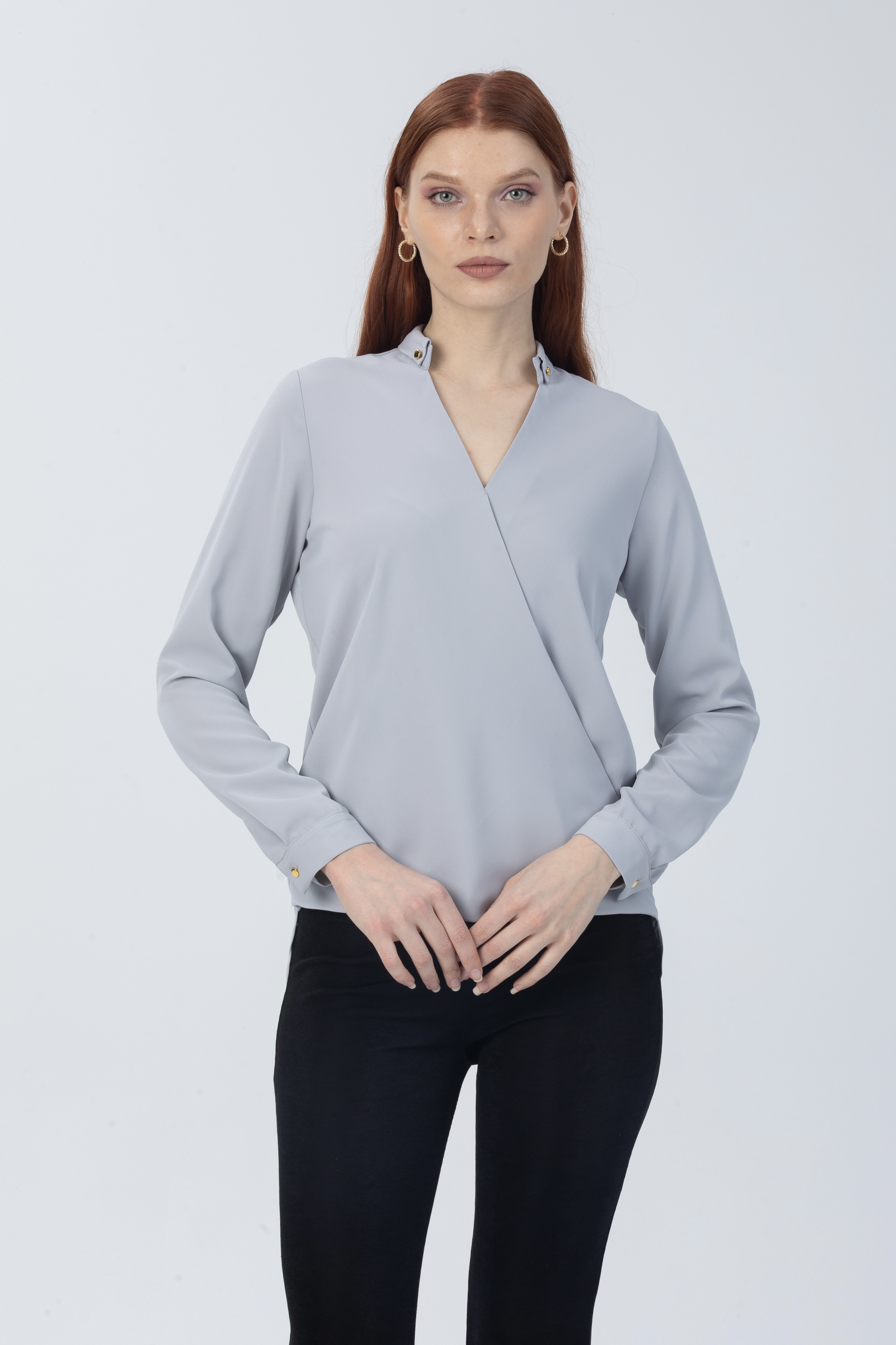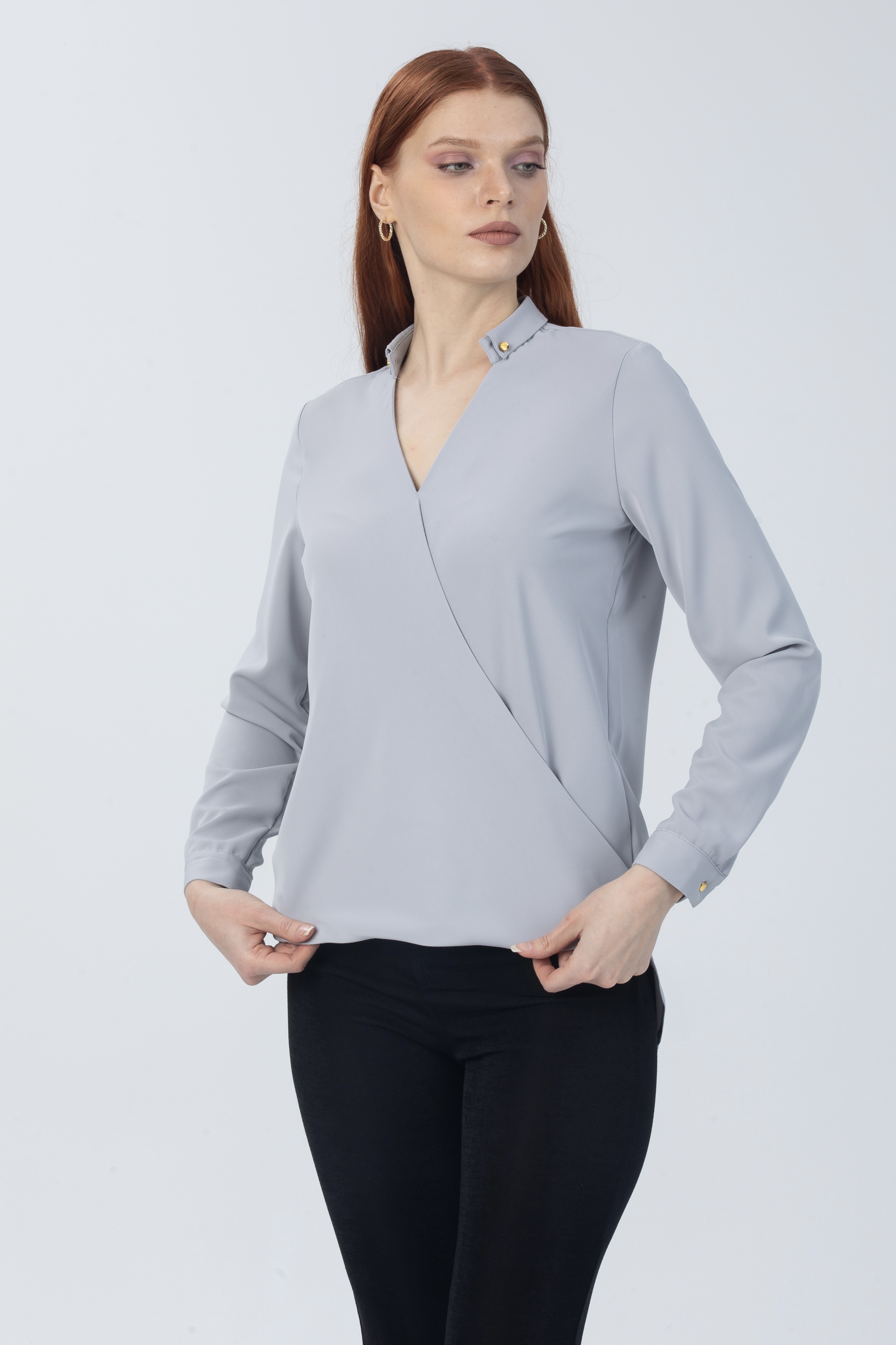 Dökümlü Degaje Yaka İç Göstermeyen Kısa Sıfır Kollu Bluz Gömlek