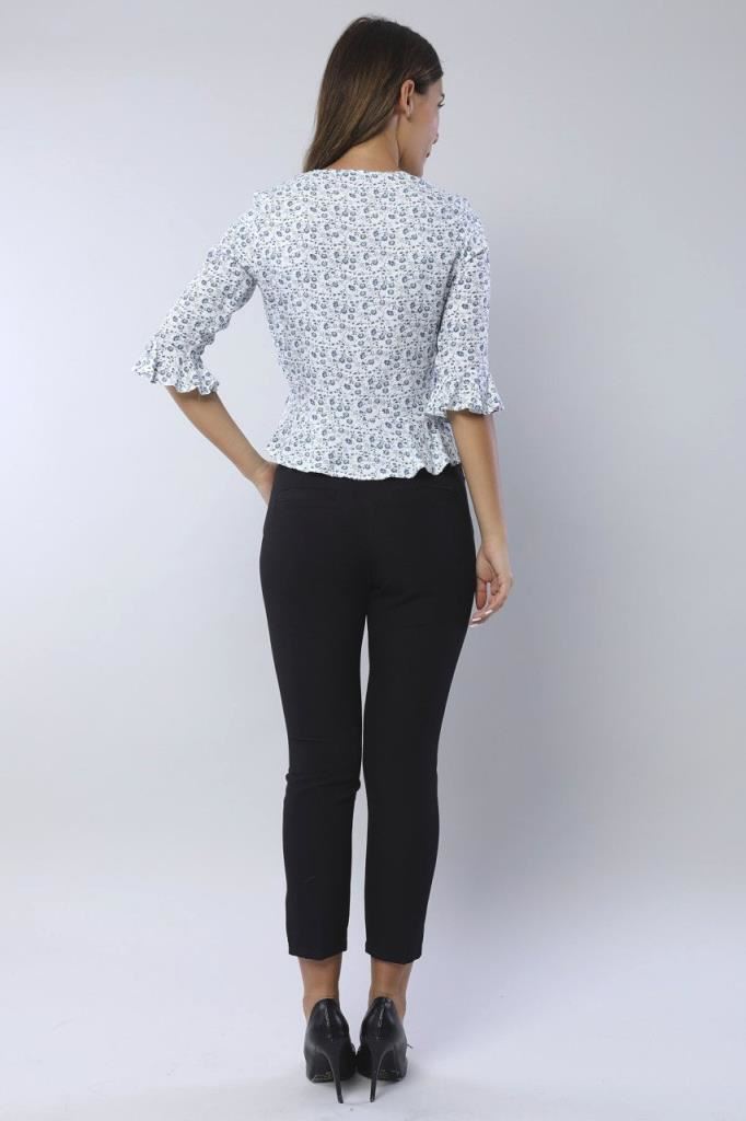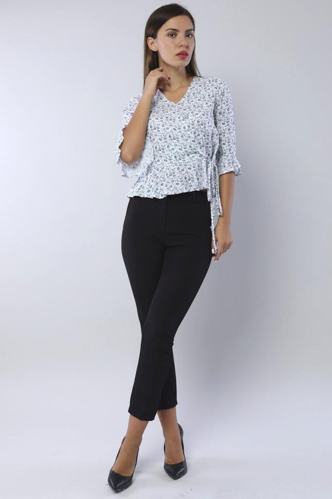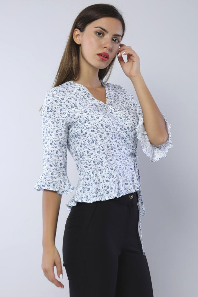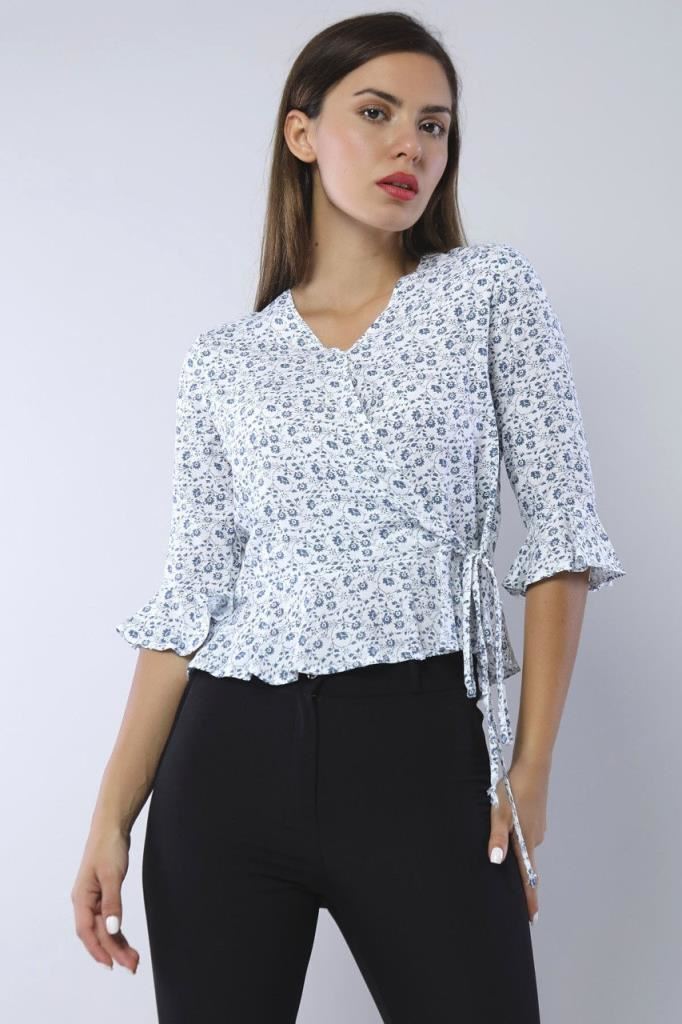 Ürün Özellikleri: Kruvaze yaka özellikli, belinden bağcık detaylı, tam kalıp, yarım kol bluz.
