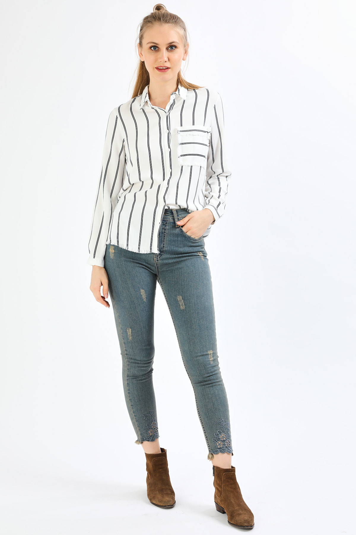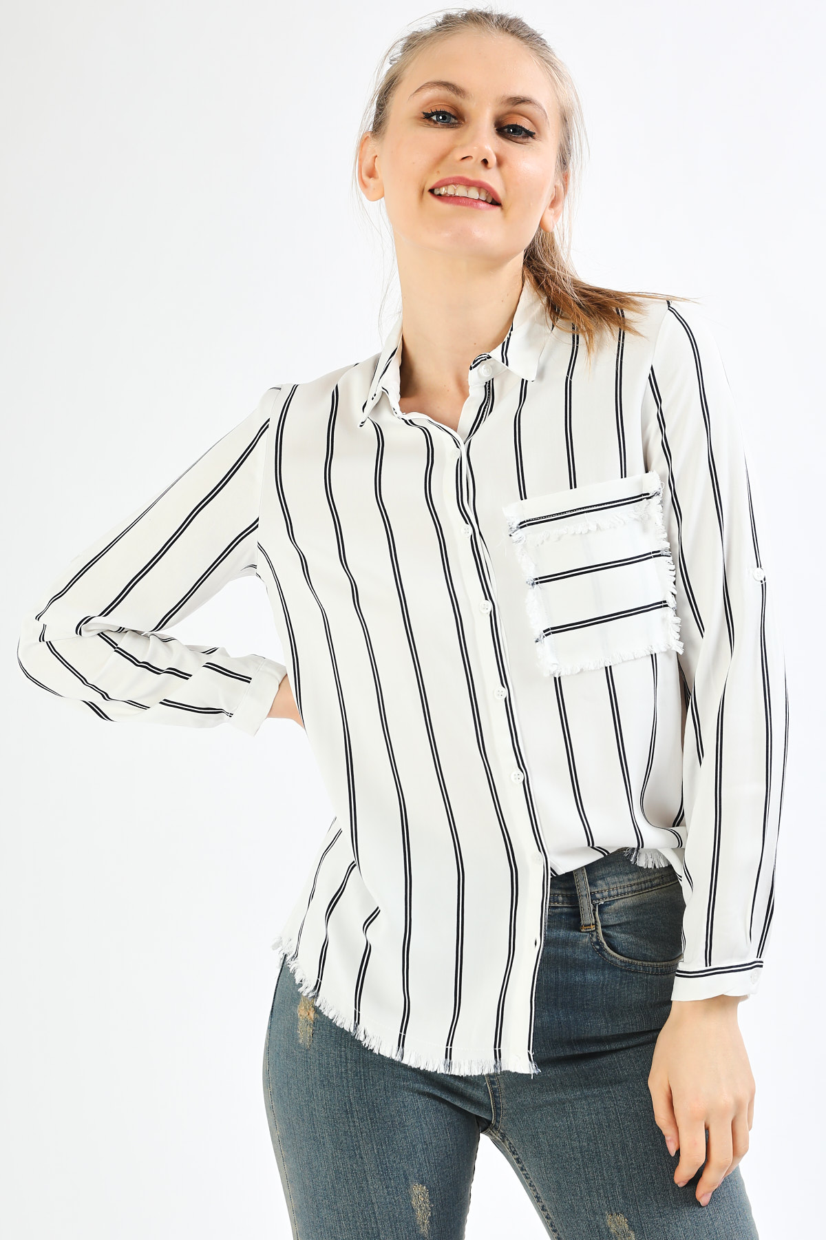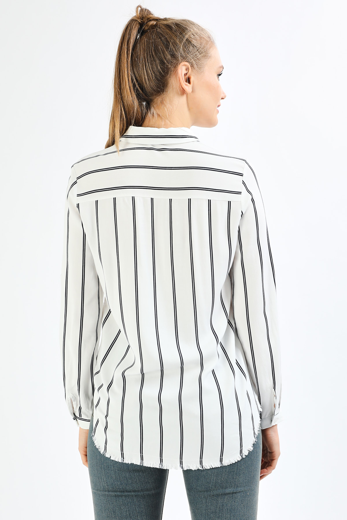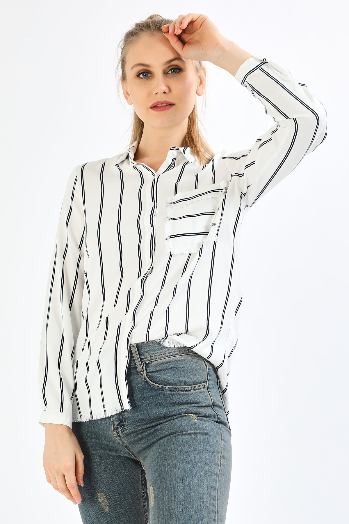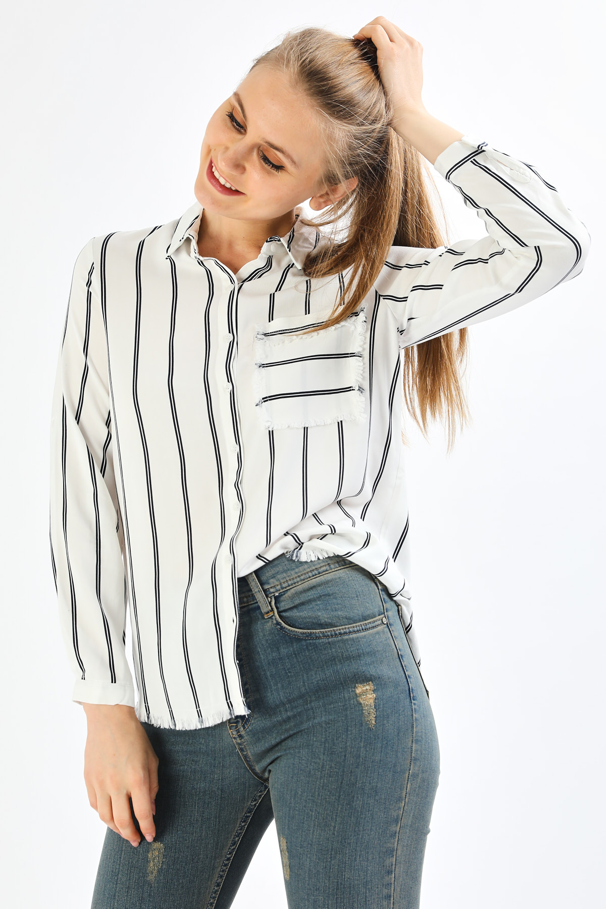 Ürün Özellikleri: Klasik yaka, çizgili, beyaz düğmeli, tam kalıp, cep ve etek kısımları püskül detaylı, uzun kollu gömlek.