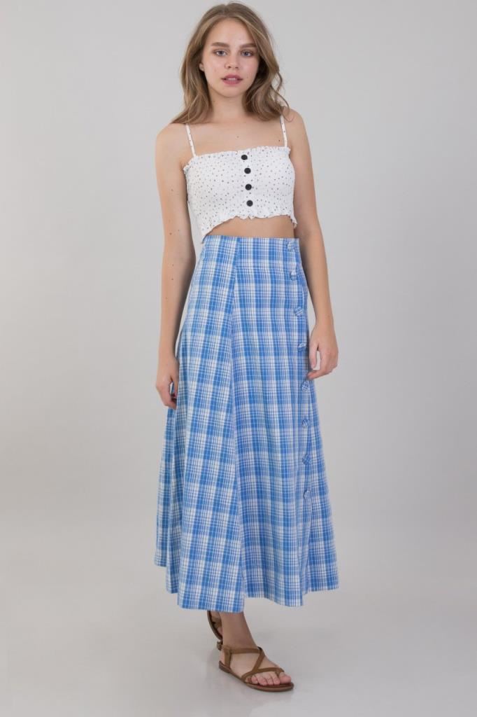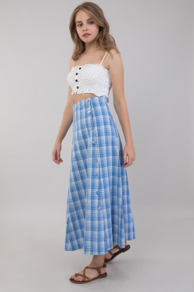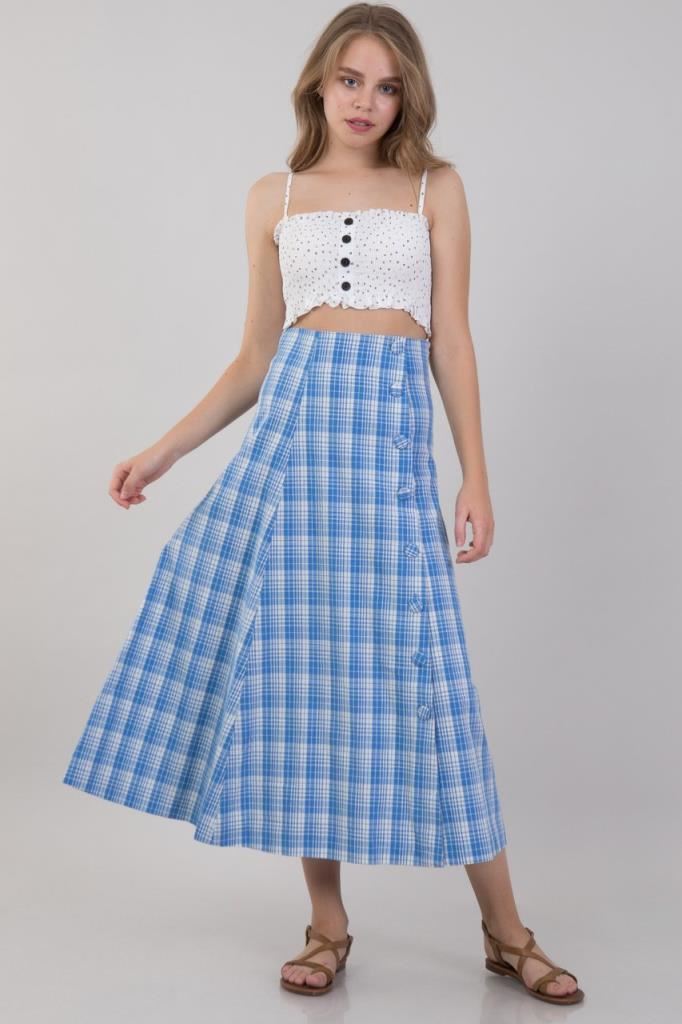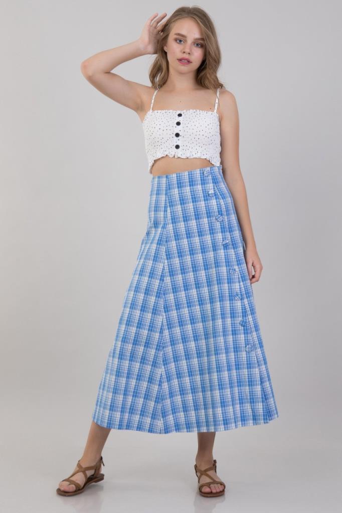 Ürün Özellikleri:Kareli, düğme detaylı, a kesim, uzun etek.