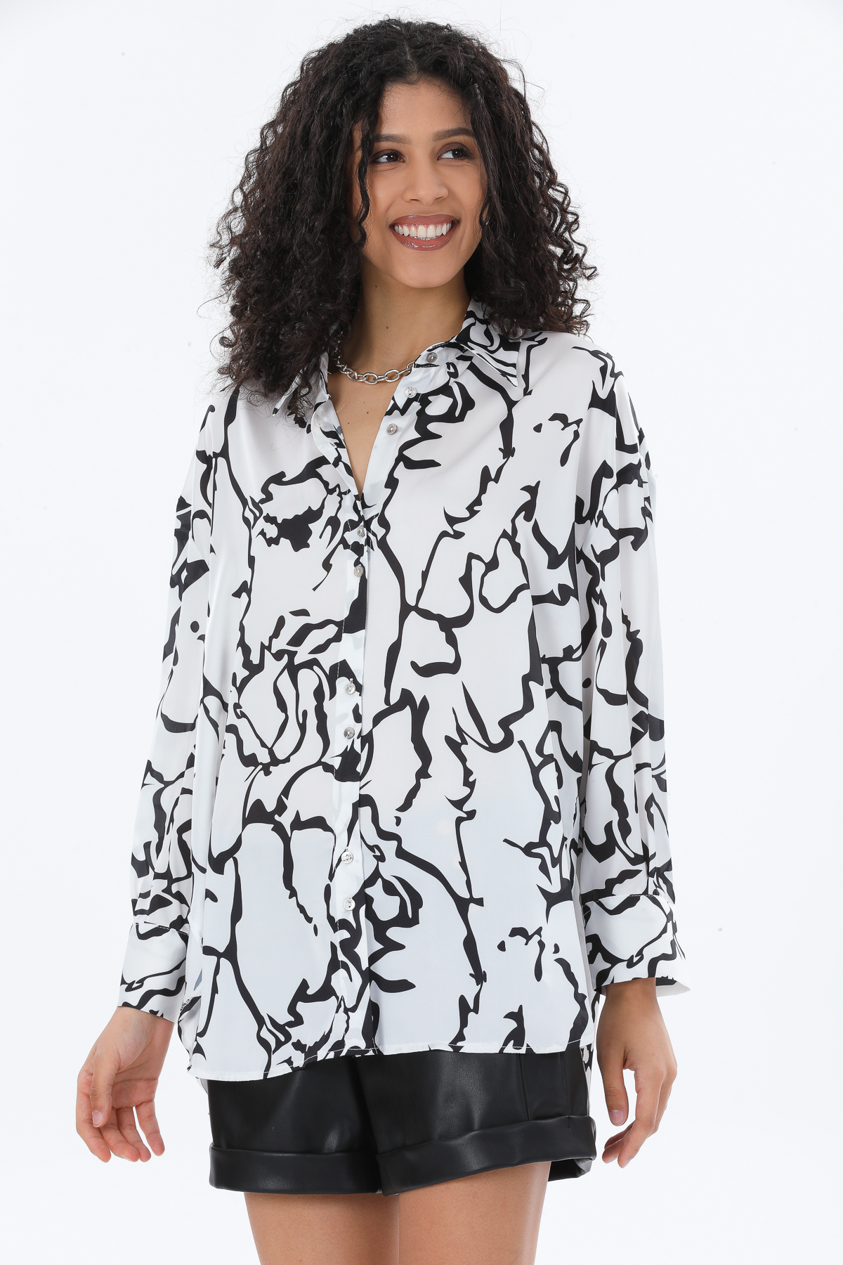 Mermer Desenli Saten Oversize Gömlek