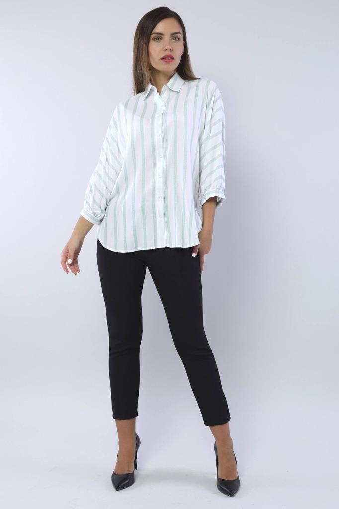 Ürün Özellikleri: Klasik yaka, beyaz düğmeli, bol kalıp, yanları yırtmaç detaylı, yarasa kol gömlek.