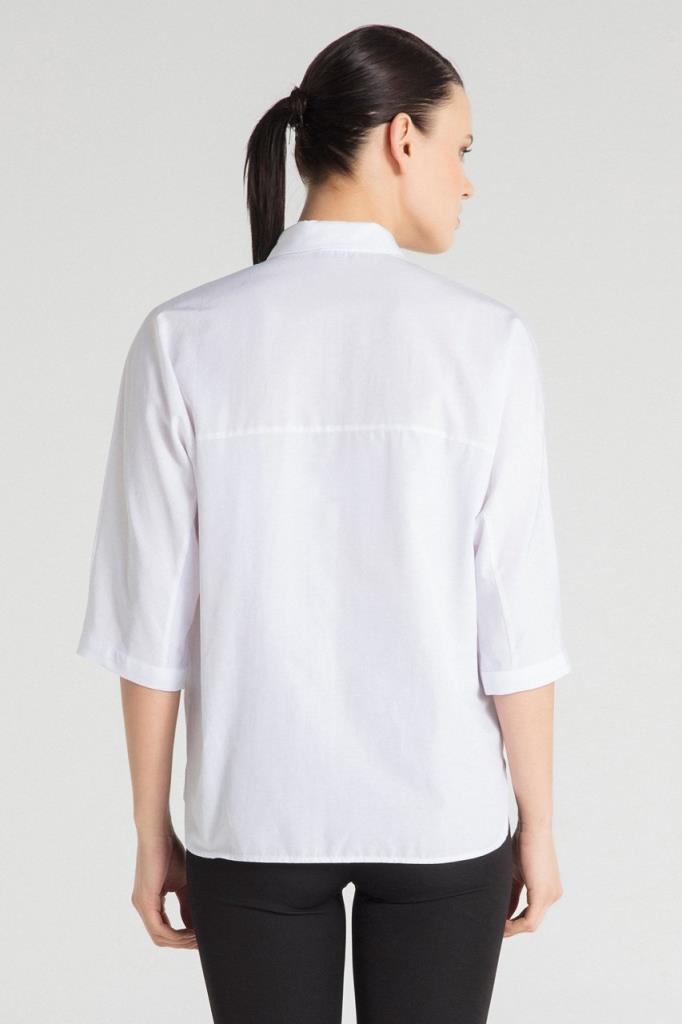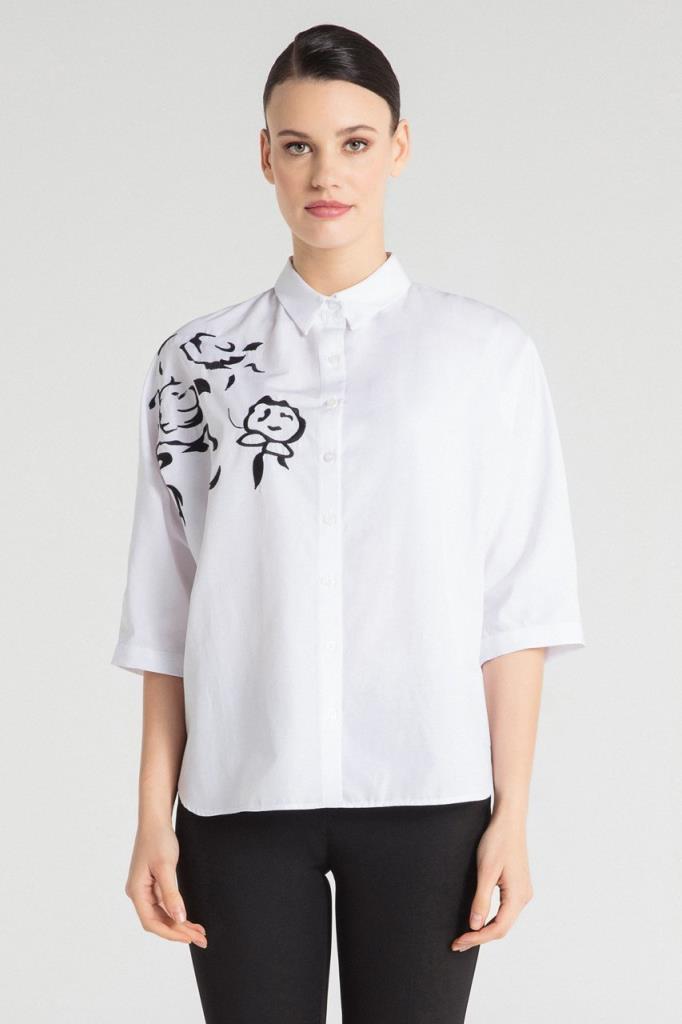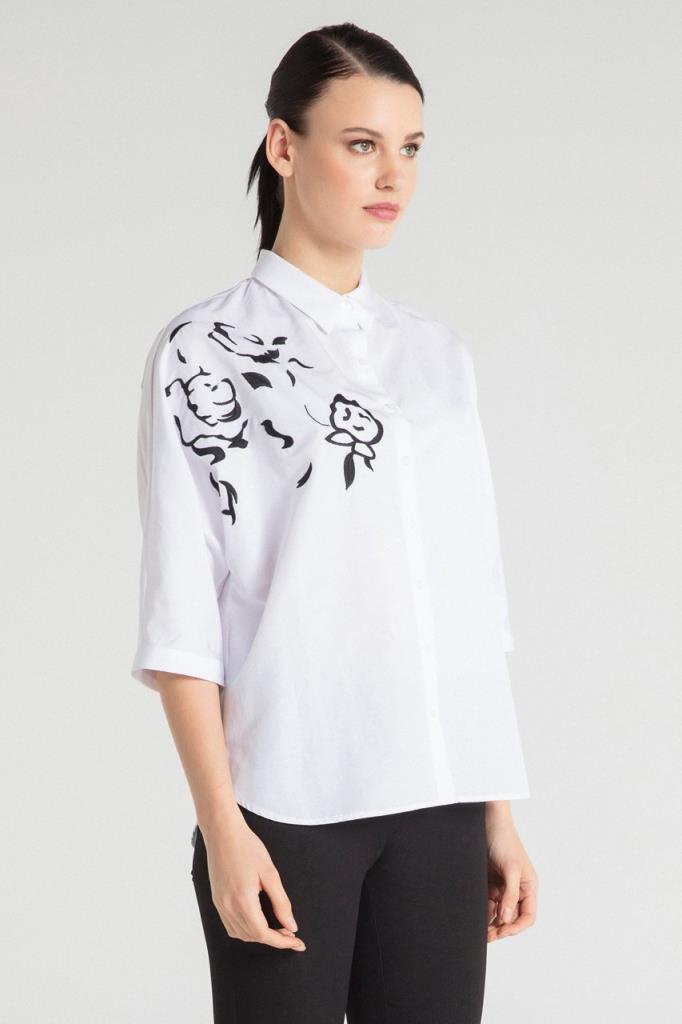 Ürün Özellikleri: Klasik yaka, nakış detaylı beyaz düğmeli, bol kalıp, yarım kollu gömlek.