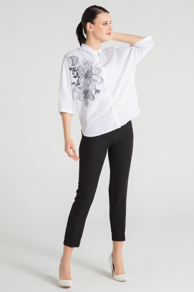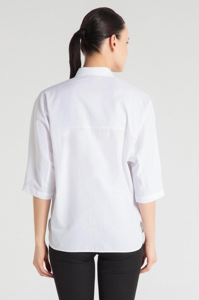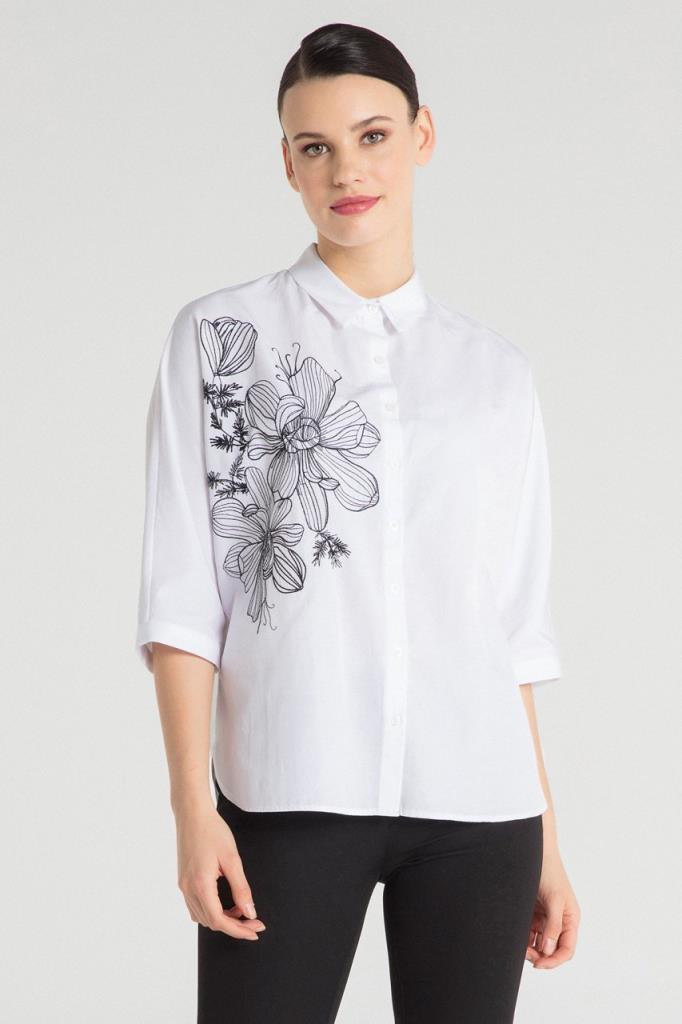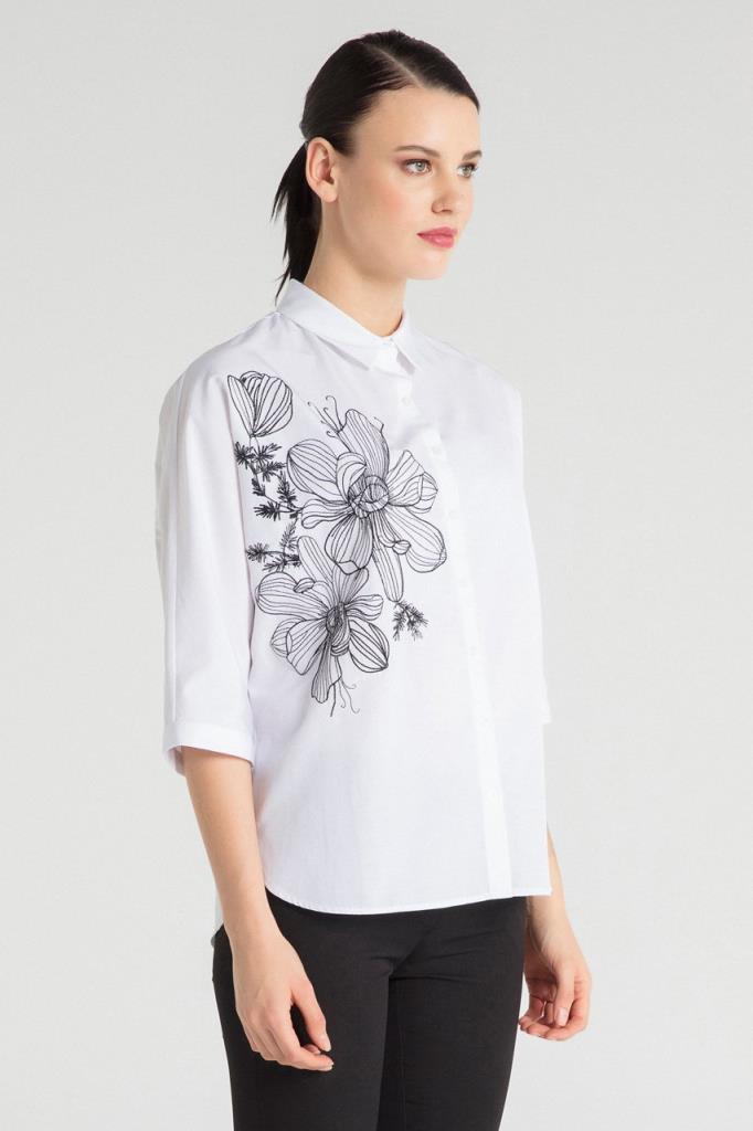 Ürün Özellikleri: Klasik yaka, nakış detaylı beyaz düğmeli, bol kalıp, yarım kollu gömlek.