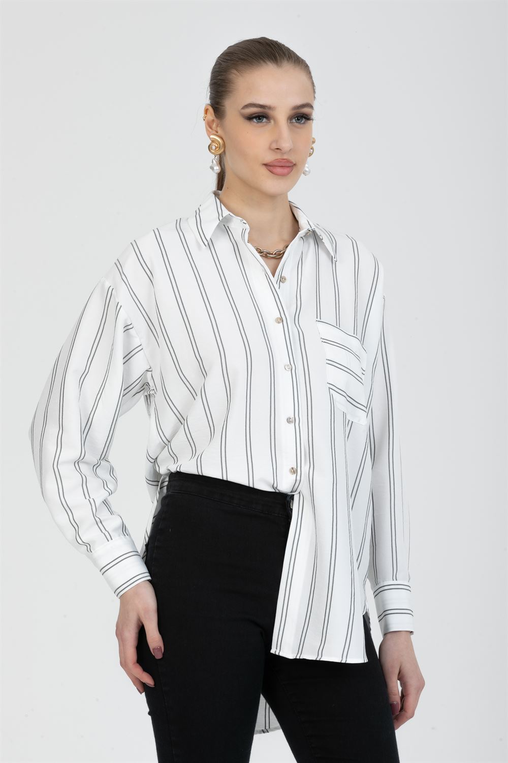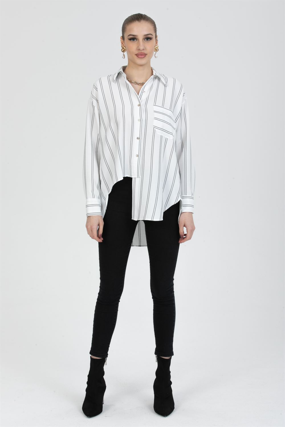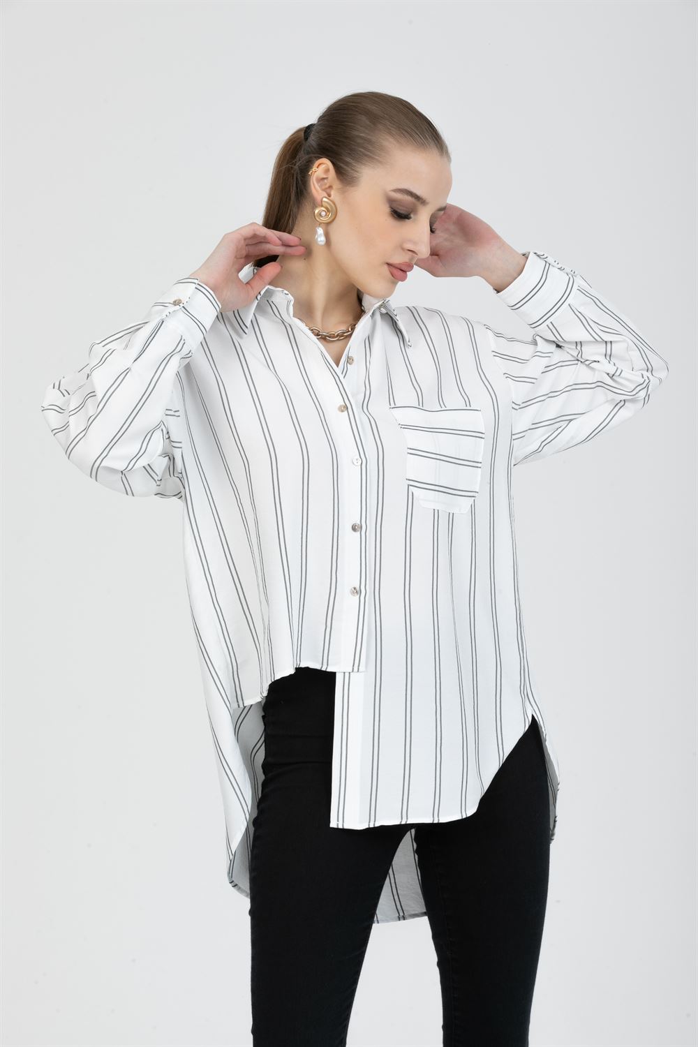Önü asimetrik kesim oversize gömlek. Bu gömlekler, gevşek ve rahat bir kesime sahip olduklarından, günlük giyim için rahat ve pratiktirler. Ön kısmı daha uzun olan bu gömlekler, farklılık yaratmak isteyen müşteriler için mükemmel bir seçimdir. Ayrıca, farklı materyallerden yapılmış ve desenli veya baskılı olabilen bu tarz gömlekler, kişinin kendi tarzını yansıtmasına olanak sağlar. Tüm bunlar birleştiğinde, önü asimetrik kesim oversize gömlek, şık ve rahat bir seçim olarak müşteriler için güzel bir tanıma sahip olur.