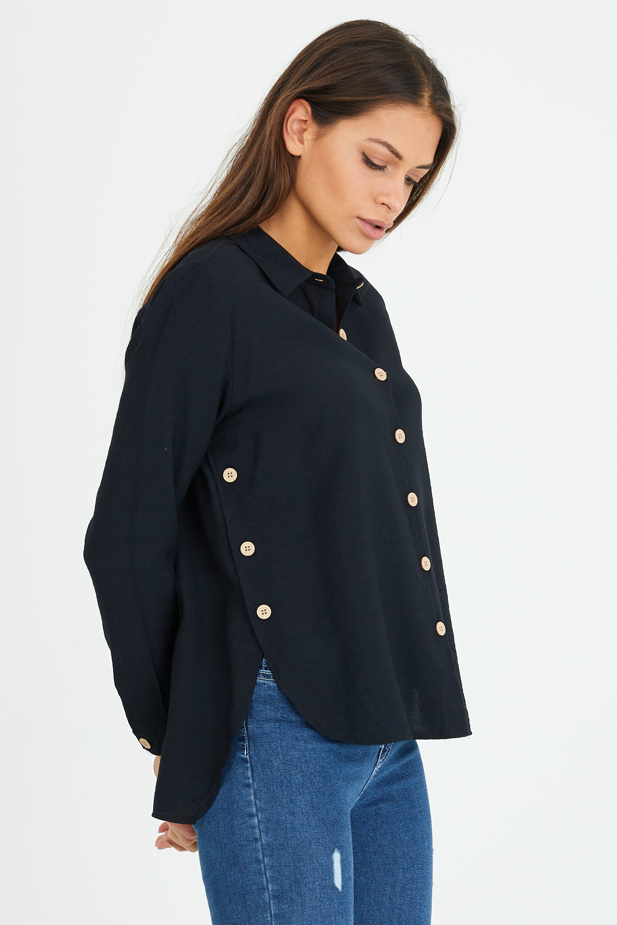 Önü Kısa Arkası Uzun Düğme Detaylı Gömlek