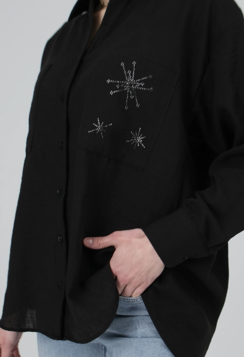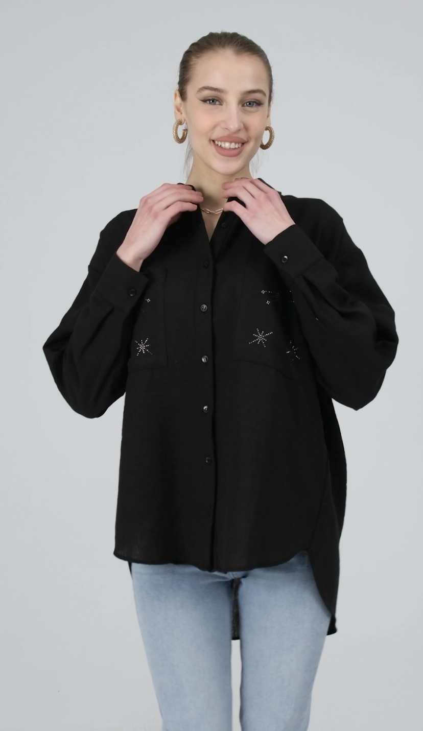Önü Taş Detaylı Oversize Keten Gömlek