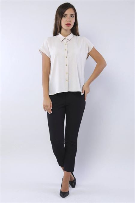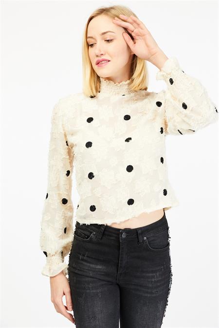 Yarım Boğazlı Dantel İşlemeli Puantiyeli Ekru Bluz