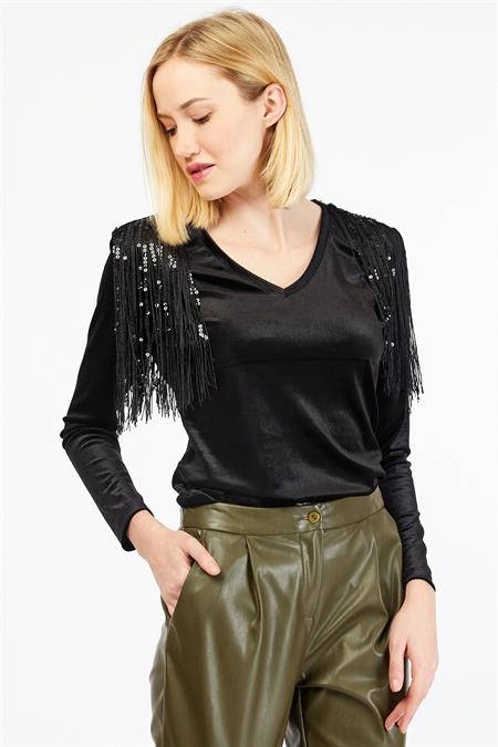 Püskül Detaylı Transparan Yarım Boğazlı Siyah Bluz