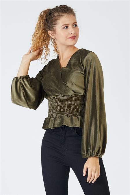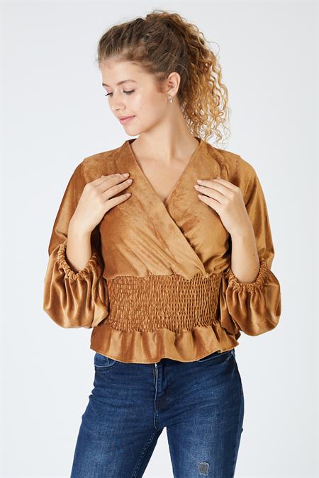 Dekolteli Balon Kol Kadife Kahve Bluz
