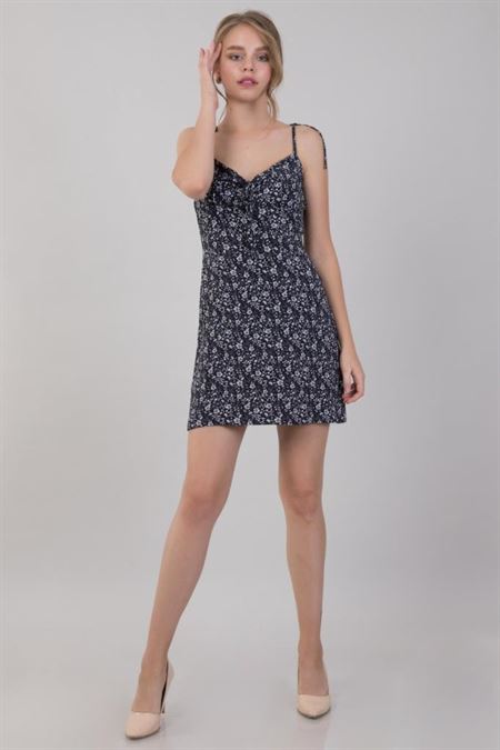 Astarlı Kaz Ayağı Desenli Fırfırlı Siyah Elbise