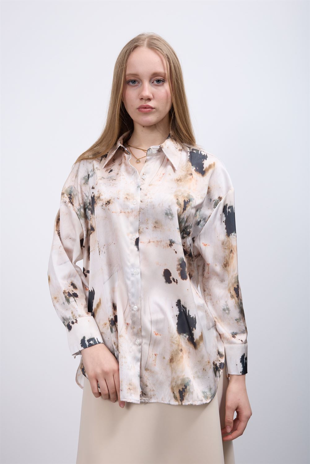 Oversize Kalıp Desenli Saten Kadın Gömleği