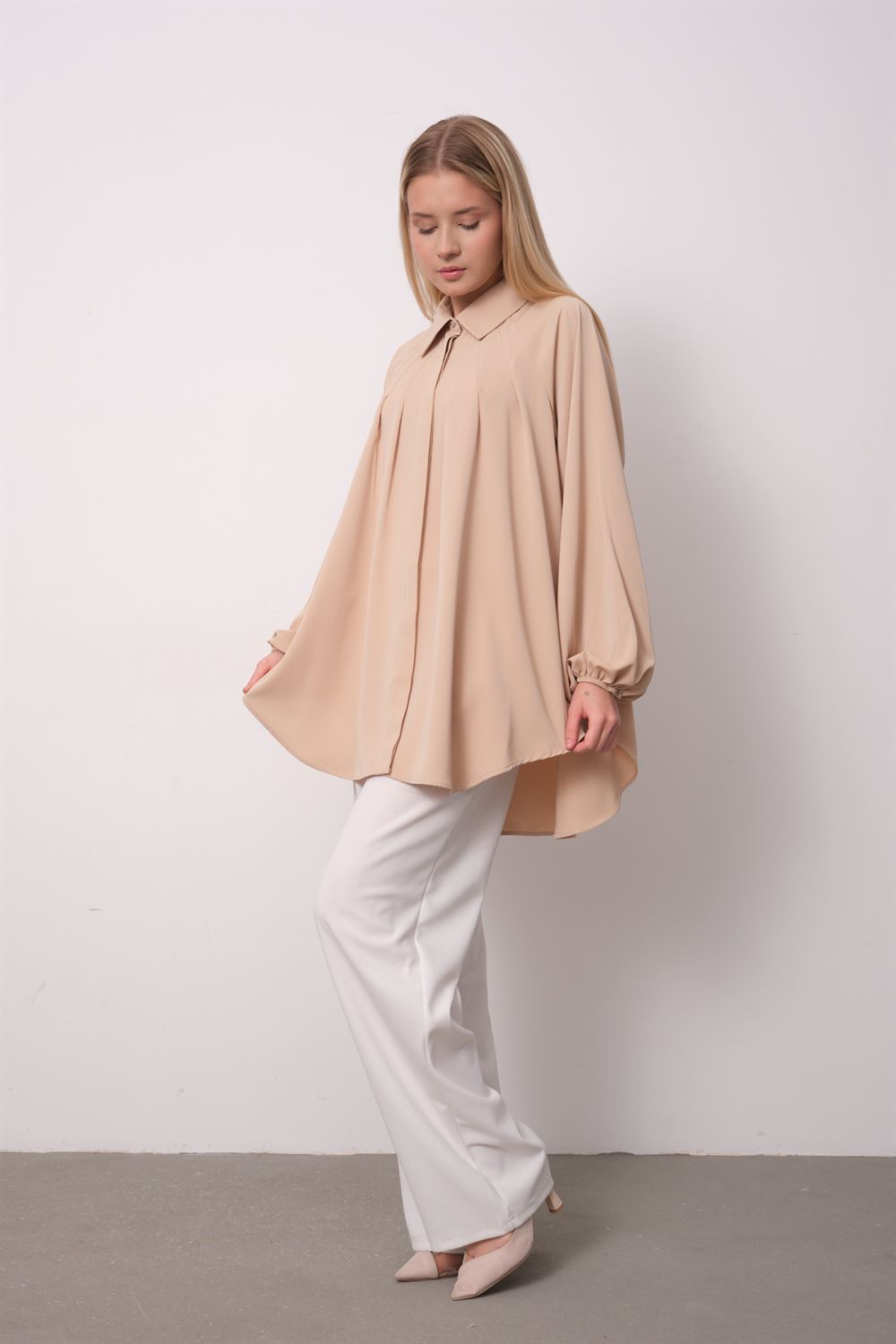 "Oversize Kesim Balon Kol Uzun Piliseli Şık Kadın Tunik Gömleği" tarzında bir ürün, şıklığı ve rahatlığı bir araya getiren bir giyim parçasıdır. Bu tür tunikler, genellikle geniş kesimiyle vücuda oturmaz, hareket özgürlüğü sağlar. Balon kol detayı ise tuniklere modern ve dinamik bir hava katar. Uzun piliseler, bu kıyafete zarif bir dokunuş ekler, genellikle kumaşın hareket etmesine yardımcı olarak şıklığı vurgular. Bu tür tunikler, günlük yaşamda rahatça giyilebileceği gibi şık bir davet için de tercih edilebilir.