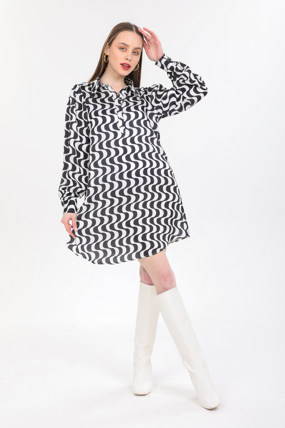 Polo Yaka Desenli Saten Elbise