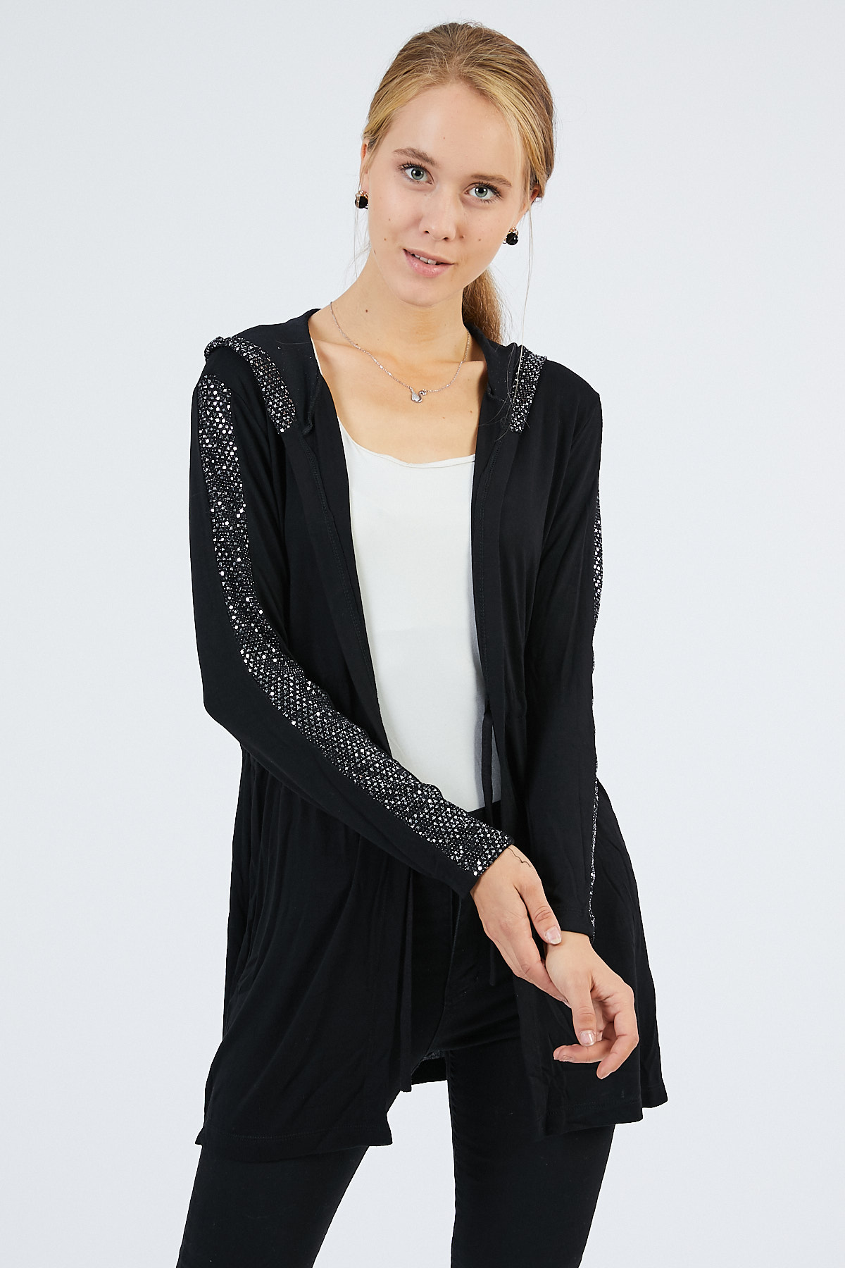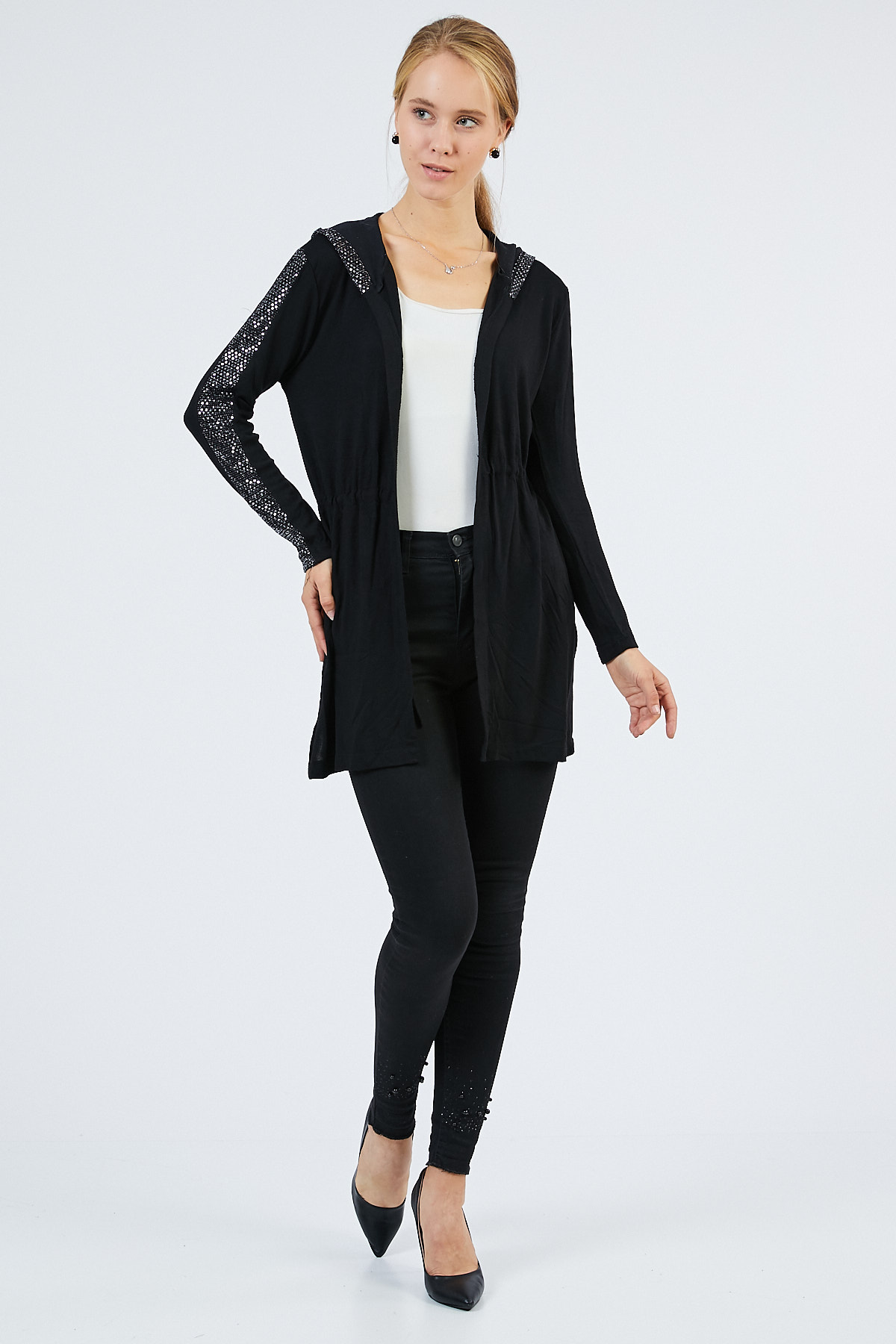 Pul Detaylı Kapüşonlu Siyah Hırka