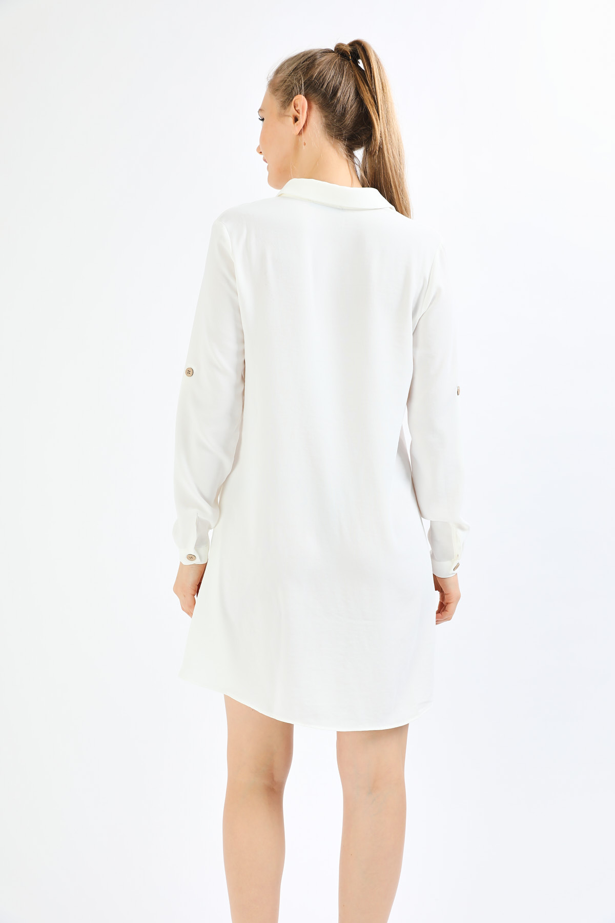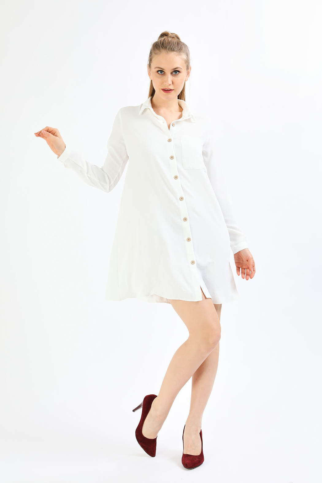 Ürün Özellikleri: Klasik yaka, tahta düğmeli, cep detaylı, çan model basic tunik elbise.