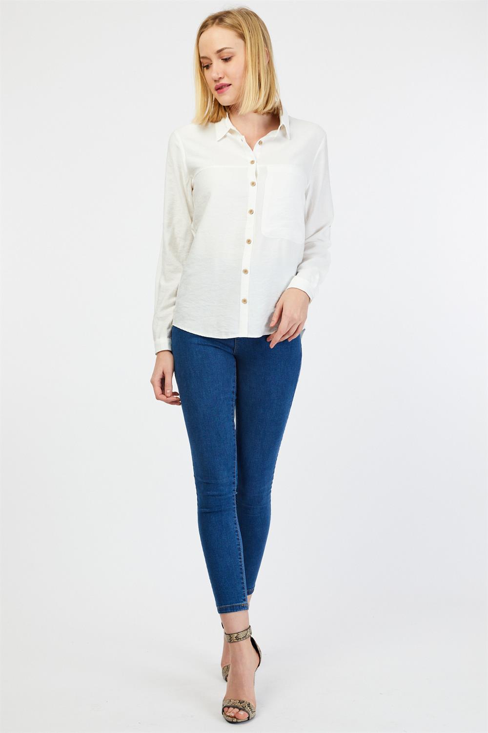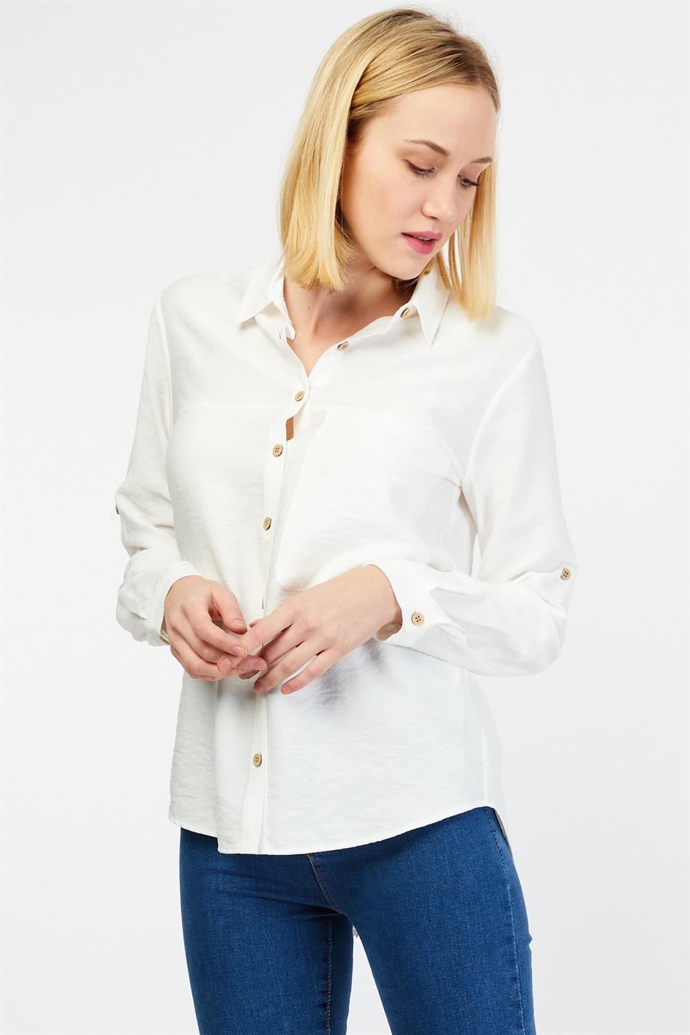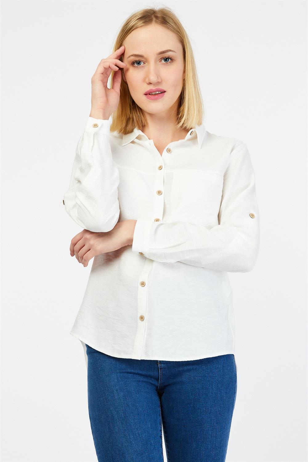 Ürün Özellikleri: Klasik yaka, tahta düğmeli, tam kalıp, uzun kollu gömlek.