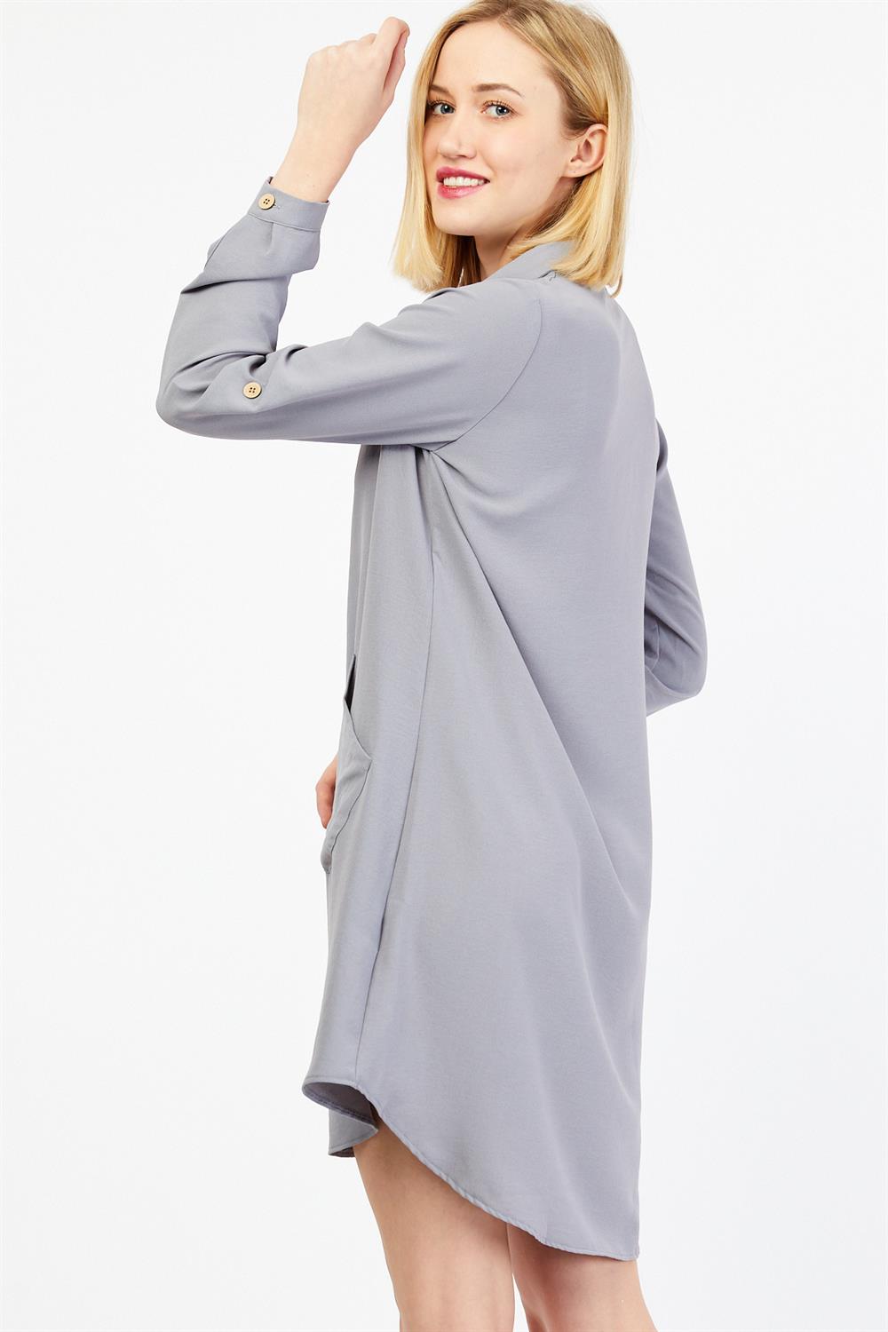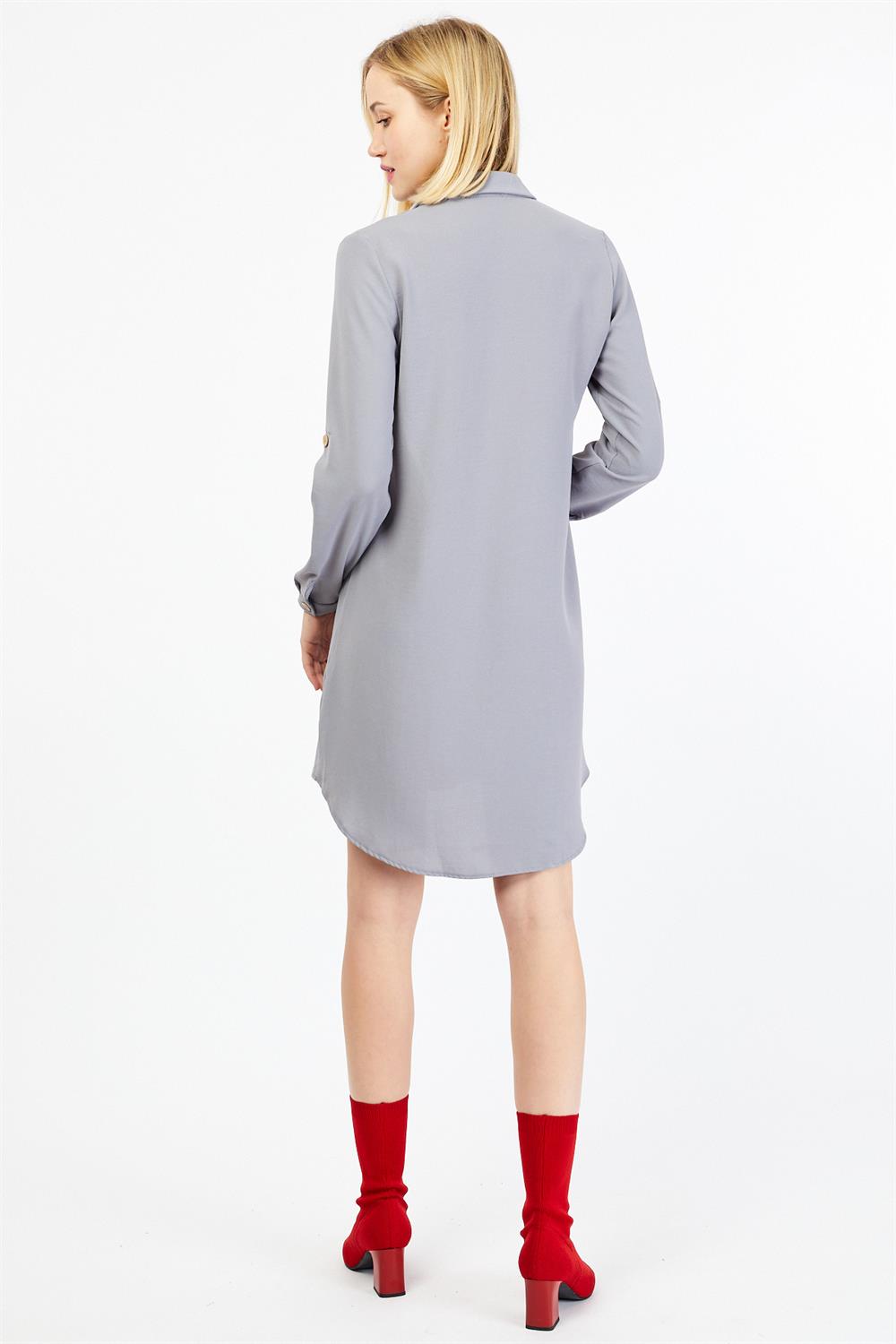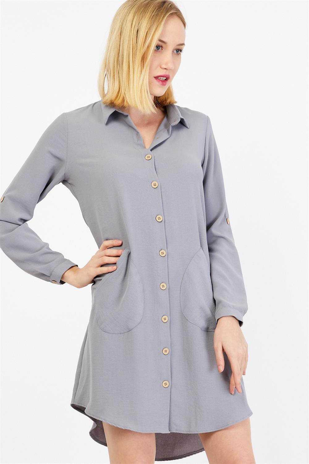 Tahta Düğmeli Cep Detaylı Gri Tunik Elbise
