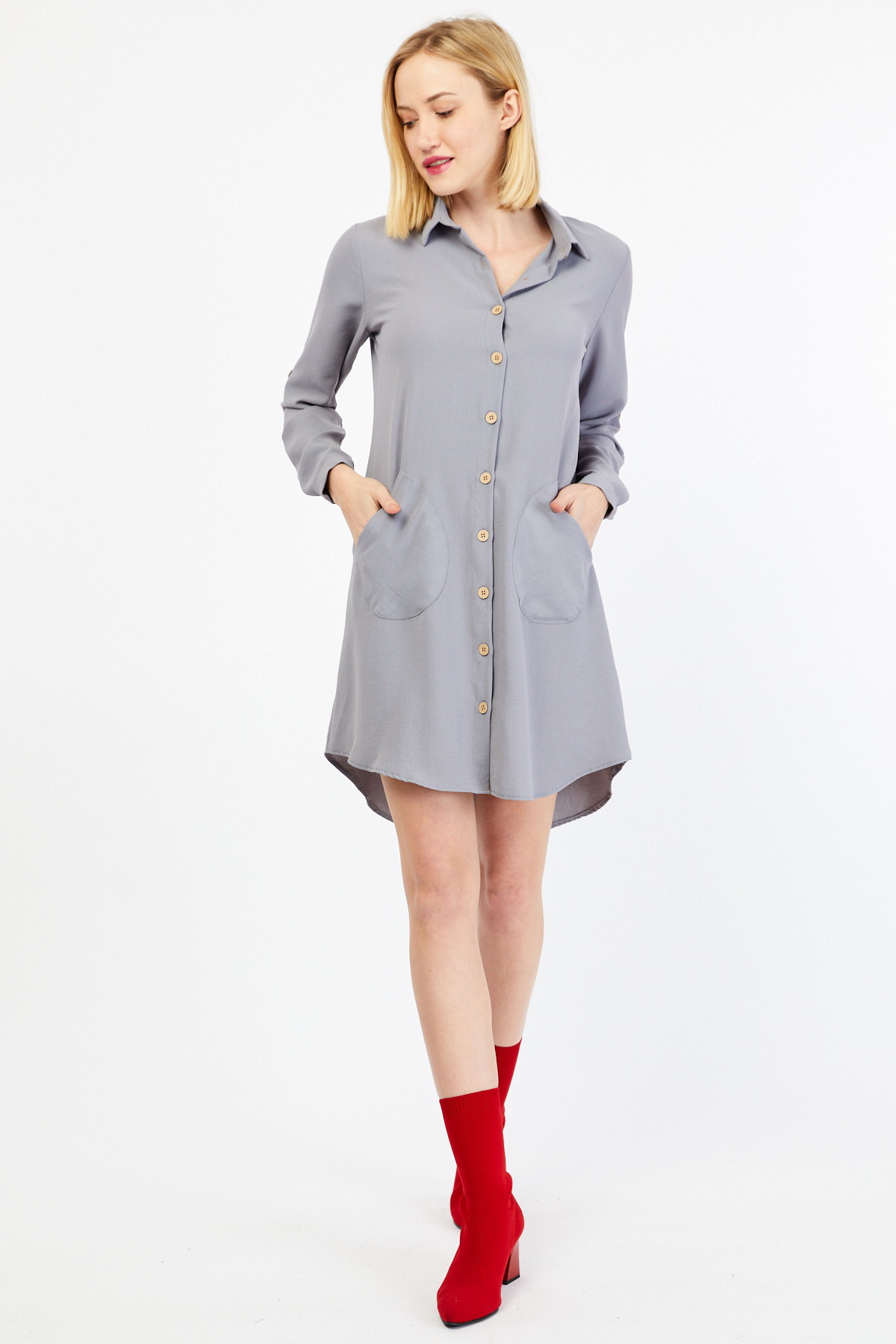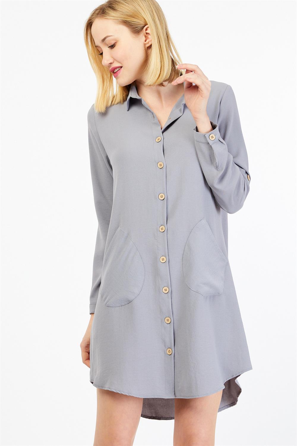 Ürün Özellikleri: Klasik yaka, tahta düğmeli, cep detaylı, önü kısa arkası uzun, çan model basic tunik elbise.