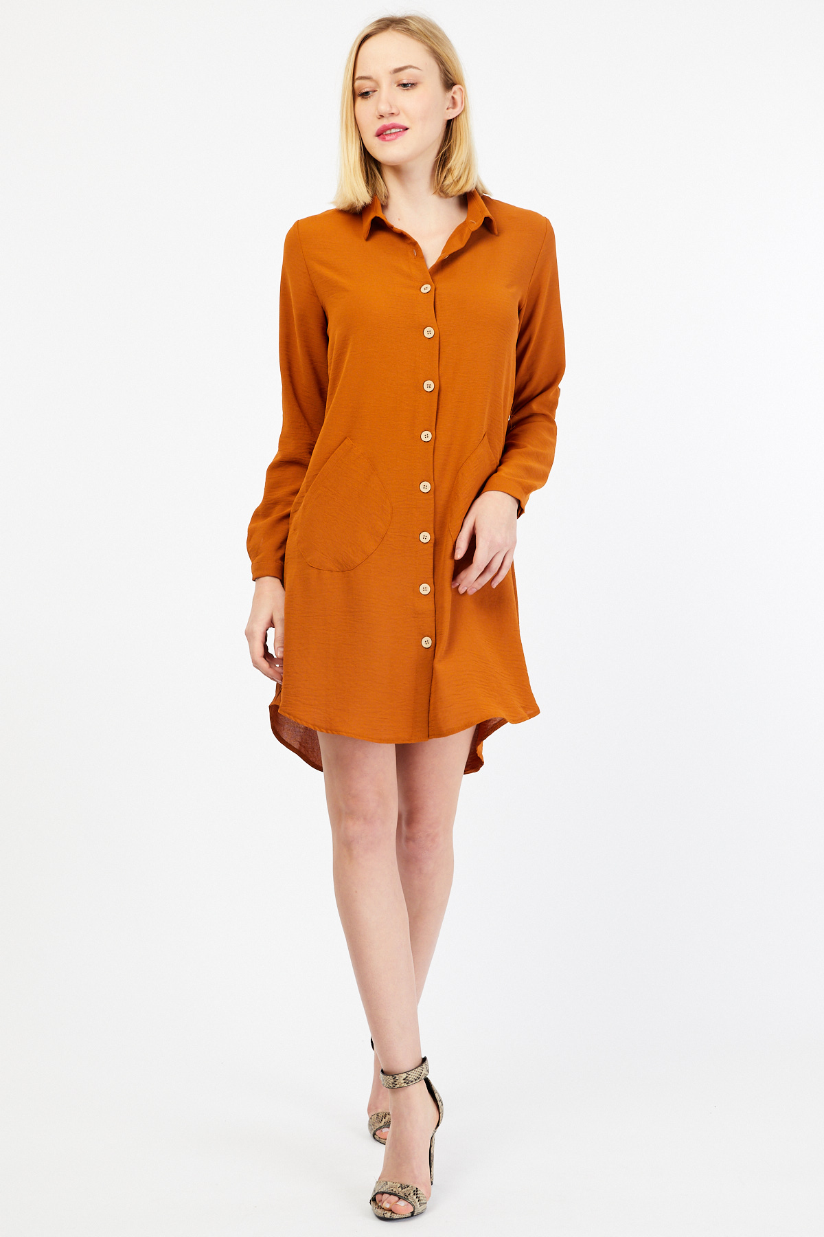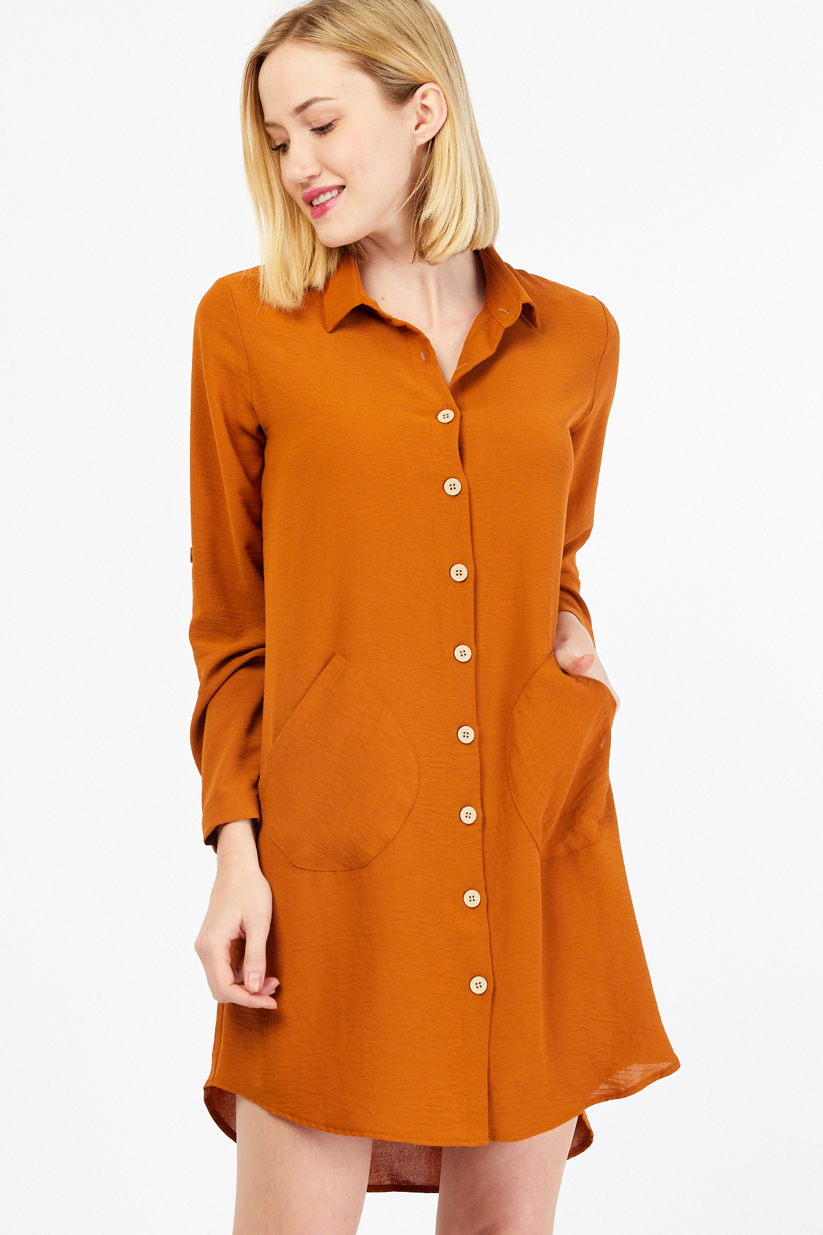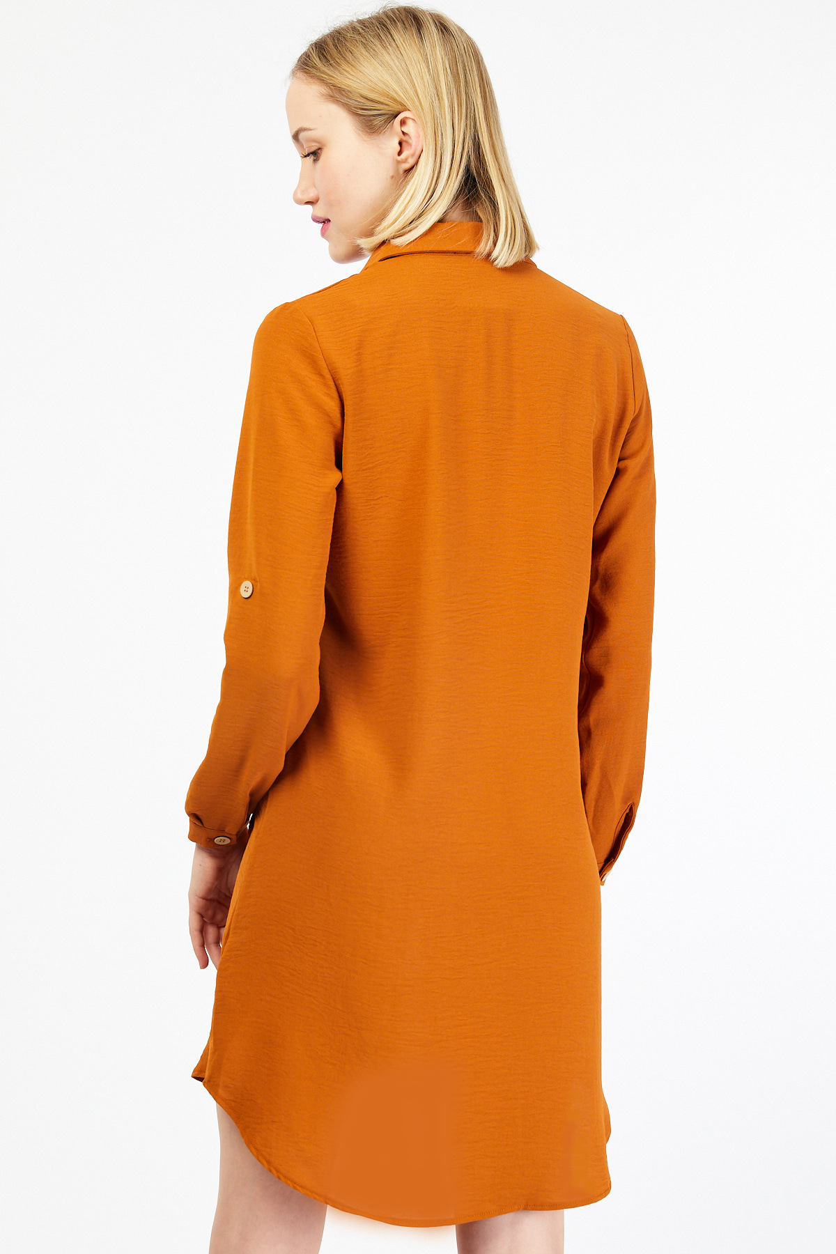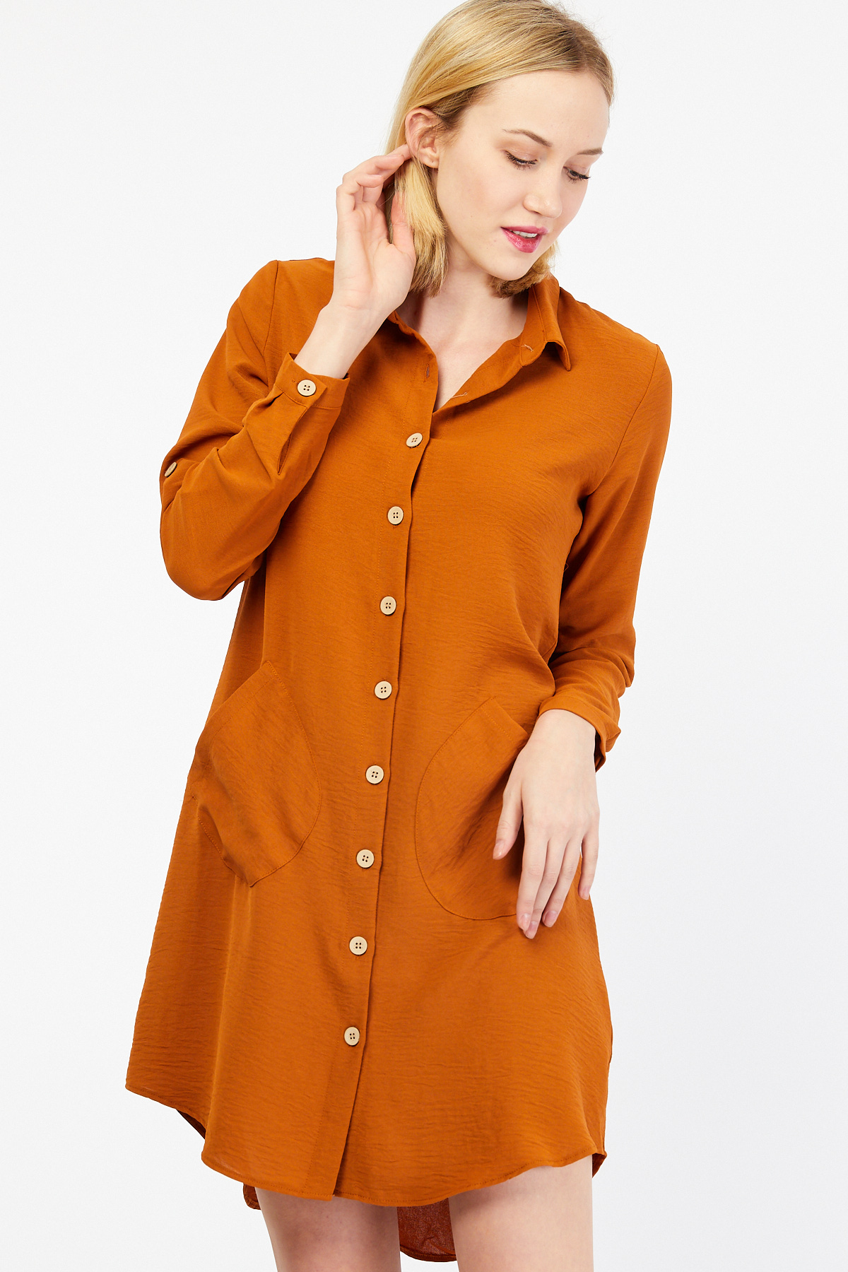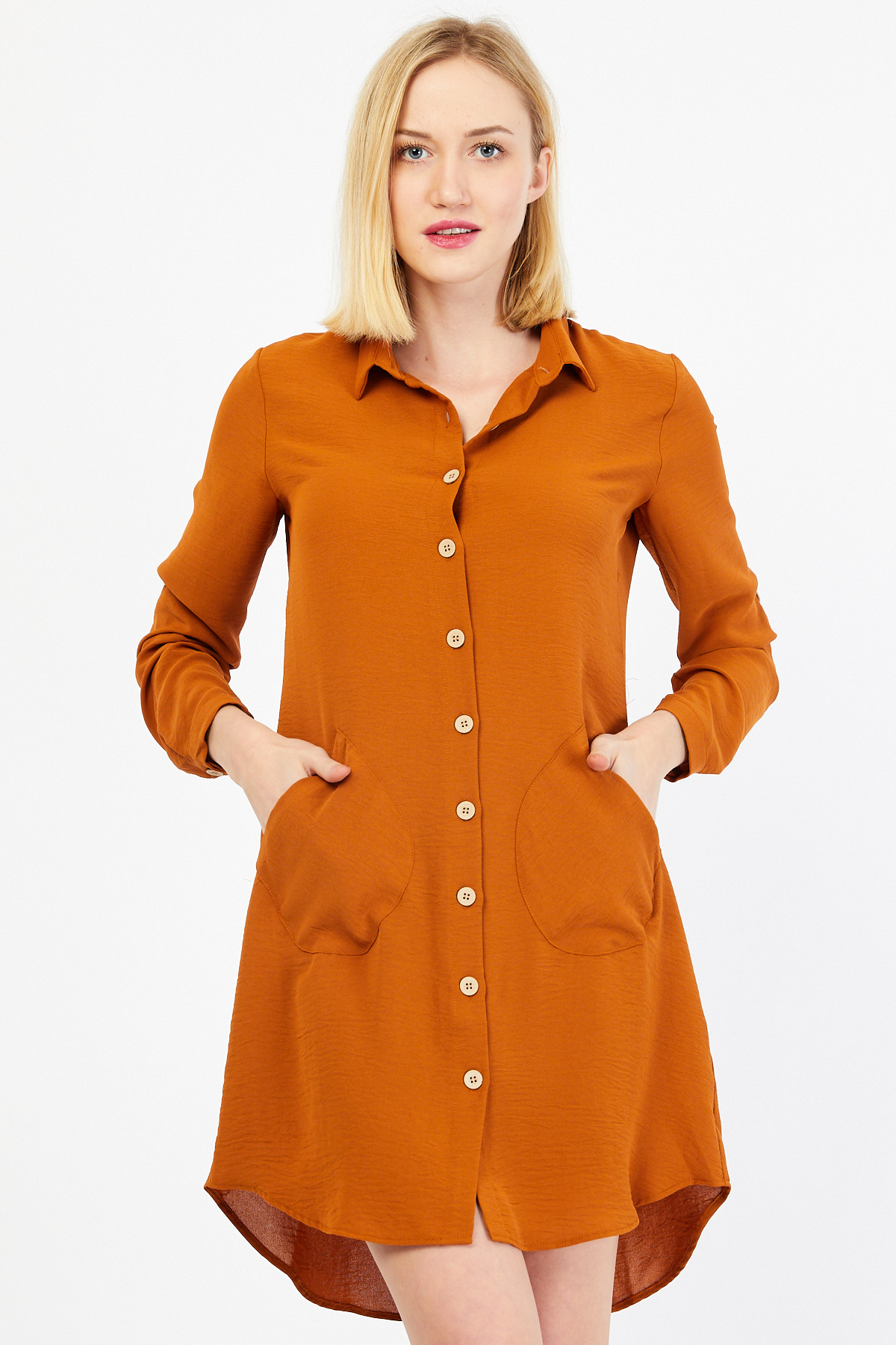 Tahta Düğmeli Cep Detaylı Kiremit Tunik Elbise