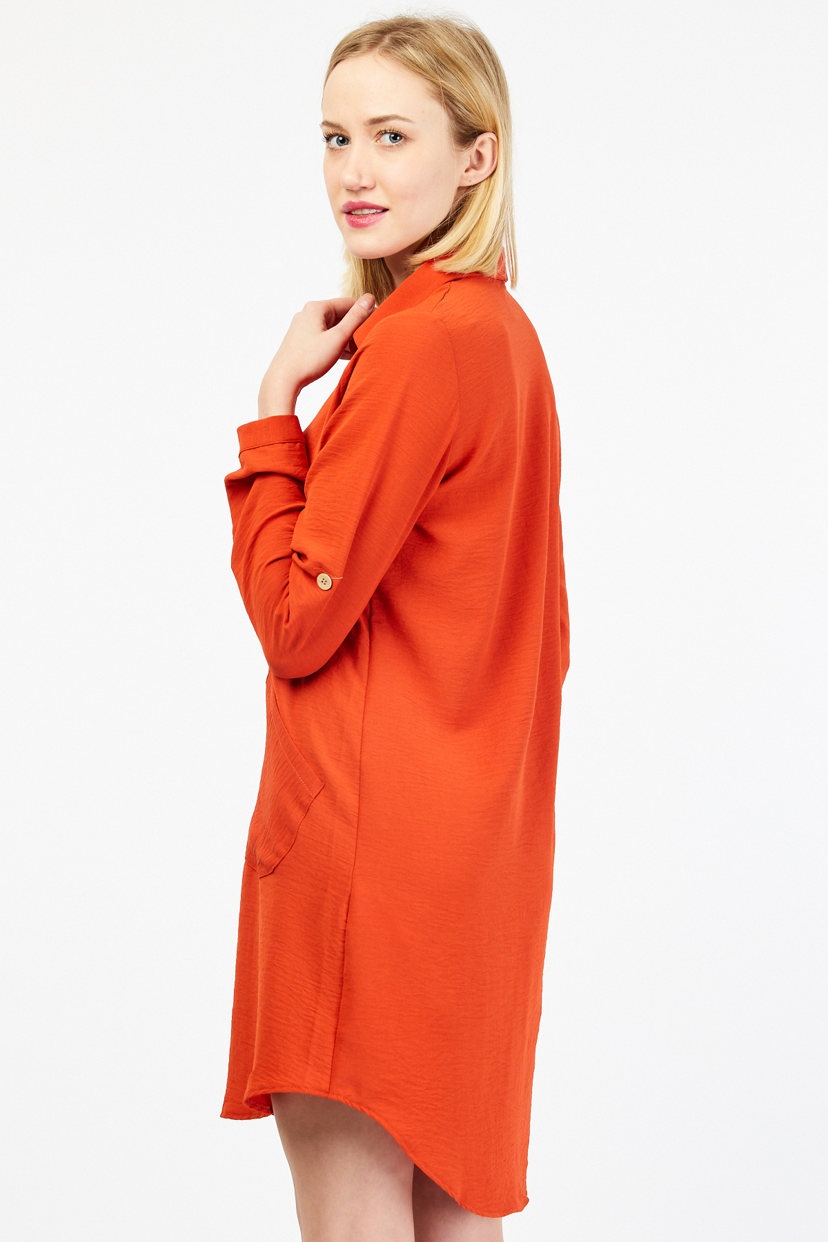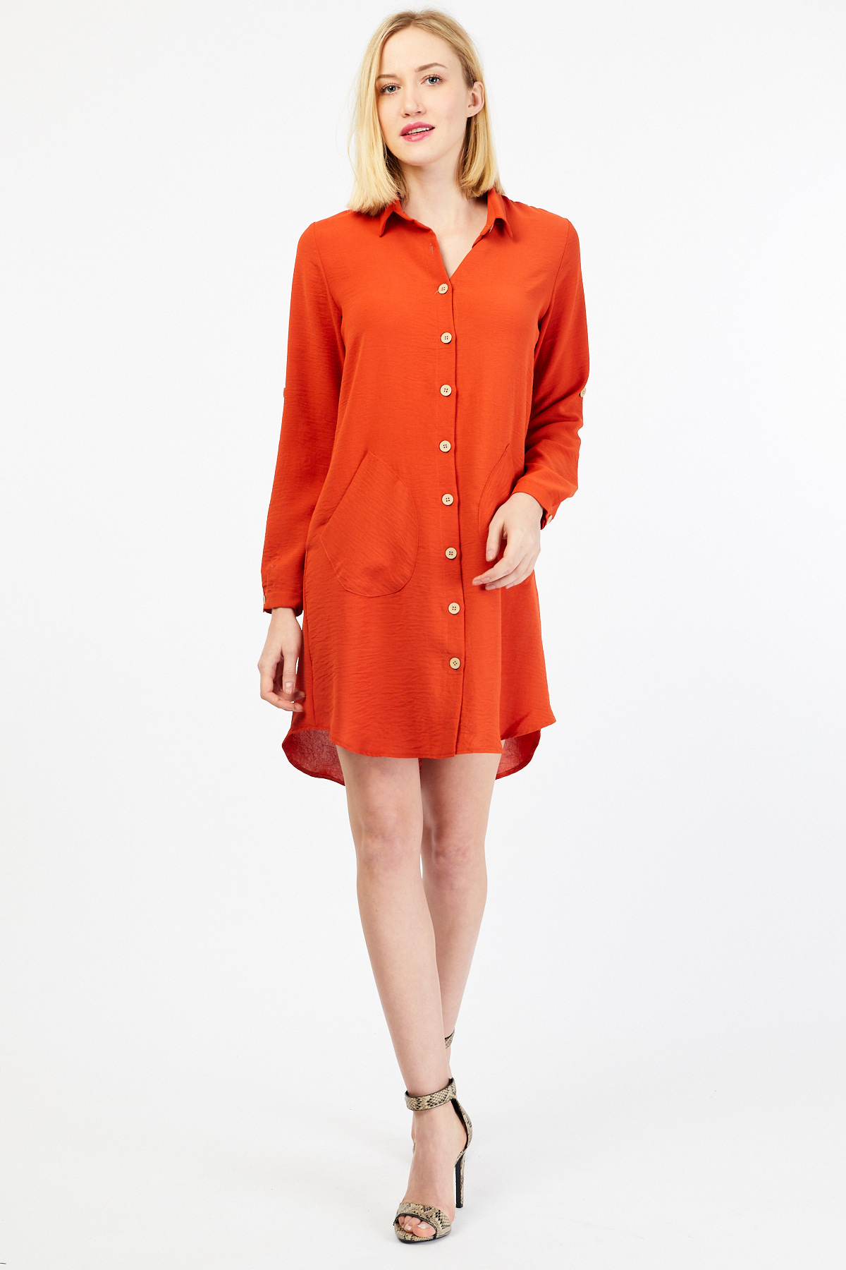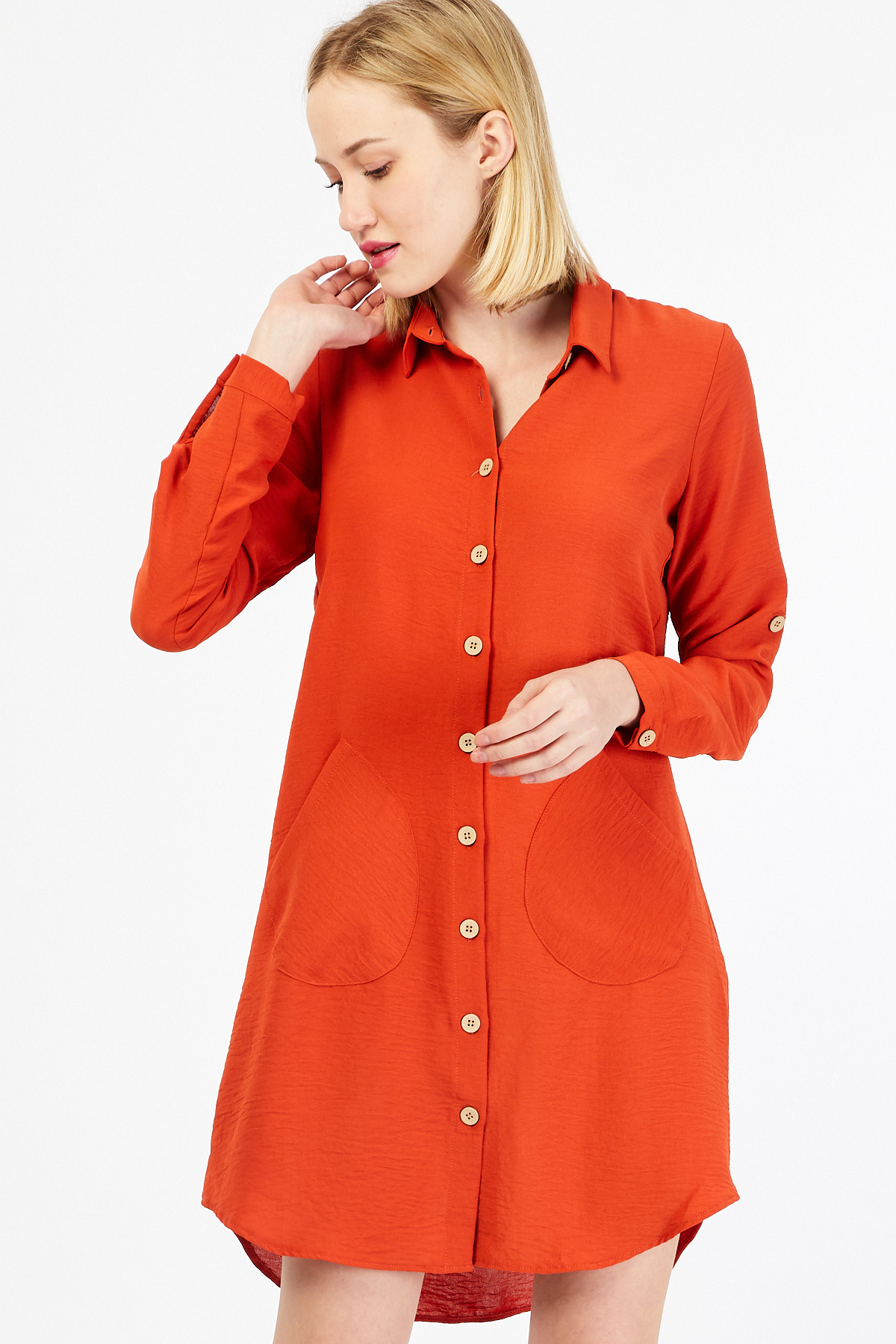 Tahta Düğmeli Cep Detaylı Kırmızı Tunik Elbise