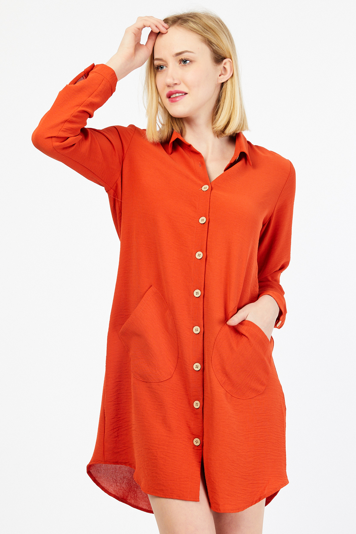 Ürün Özellikleri: Klasik yaka, tahta düğmeli, cep detaylı, önü kısa arkası uzun, çan model basic tunik elbise.