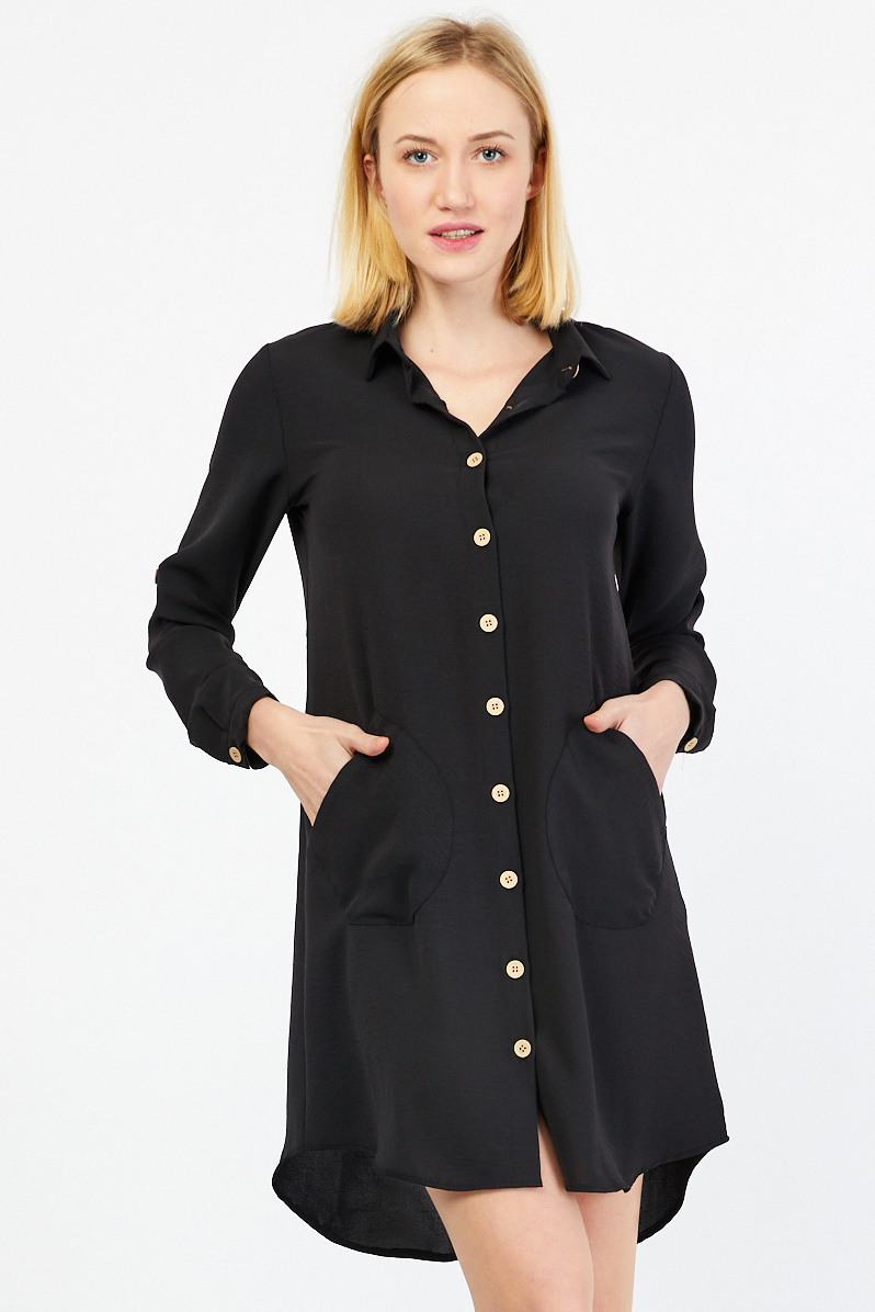Ürün Özellikleri: Klasik yaka, tahta düğmeli, cep detaylı, önü kısa arkası uzun, çan model basic tunik elbise.