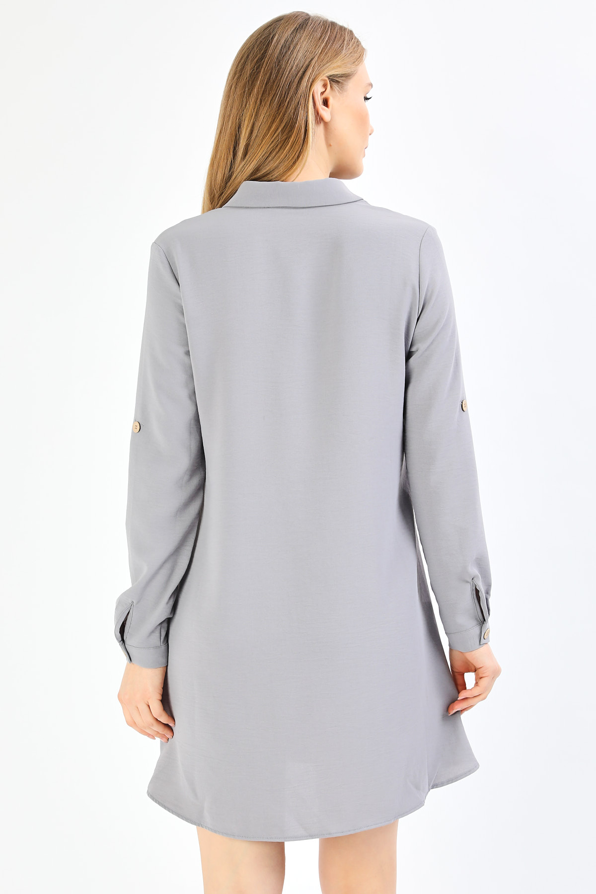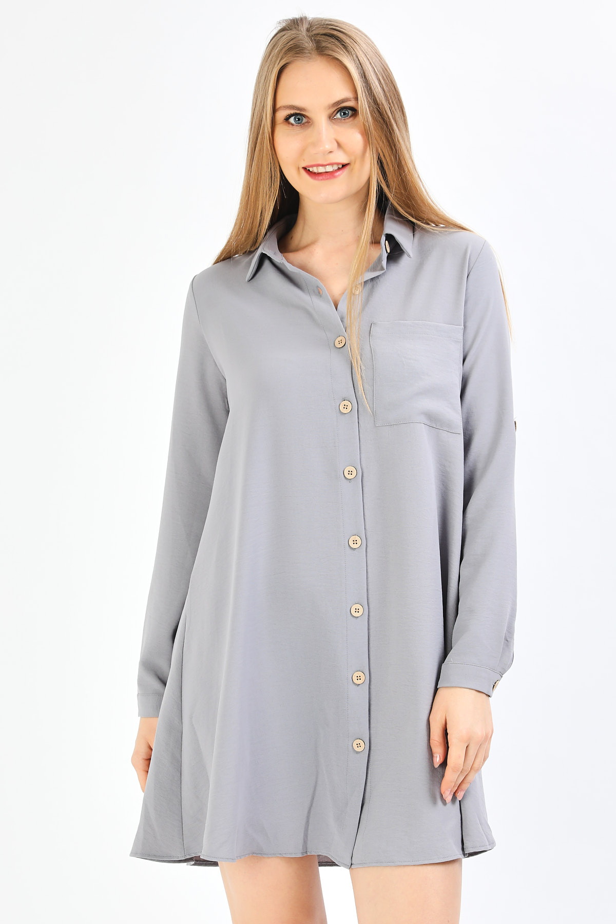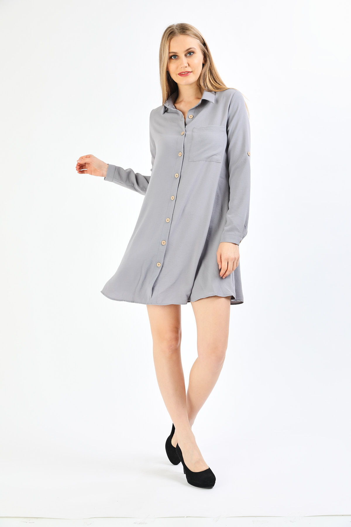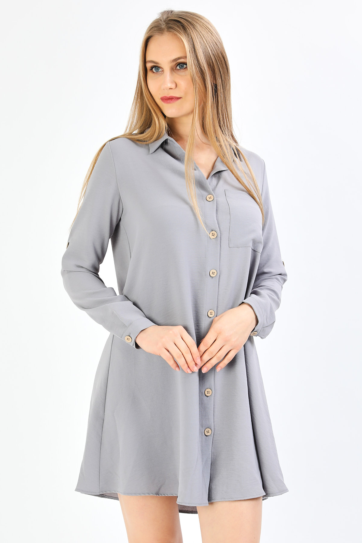 Ürün Özellikleri: Klasik yaka, tahta düğmeli, cep detaylı, çan model basic tunik elbise.
