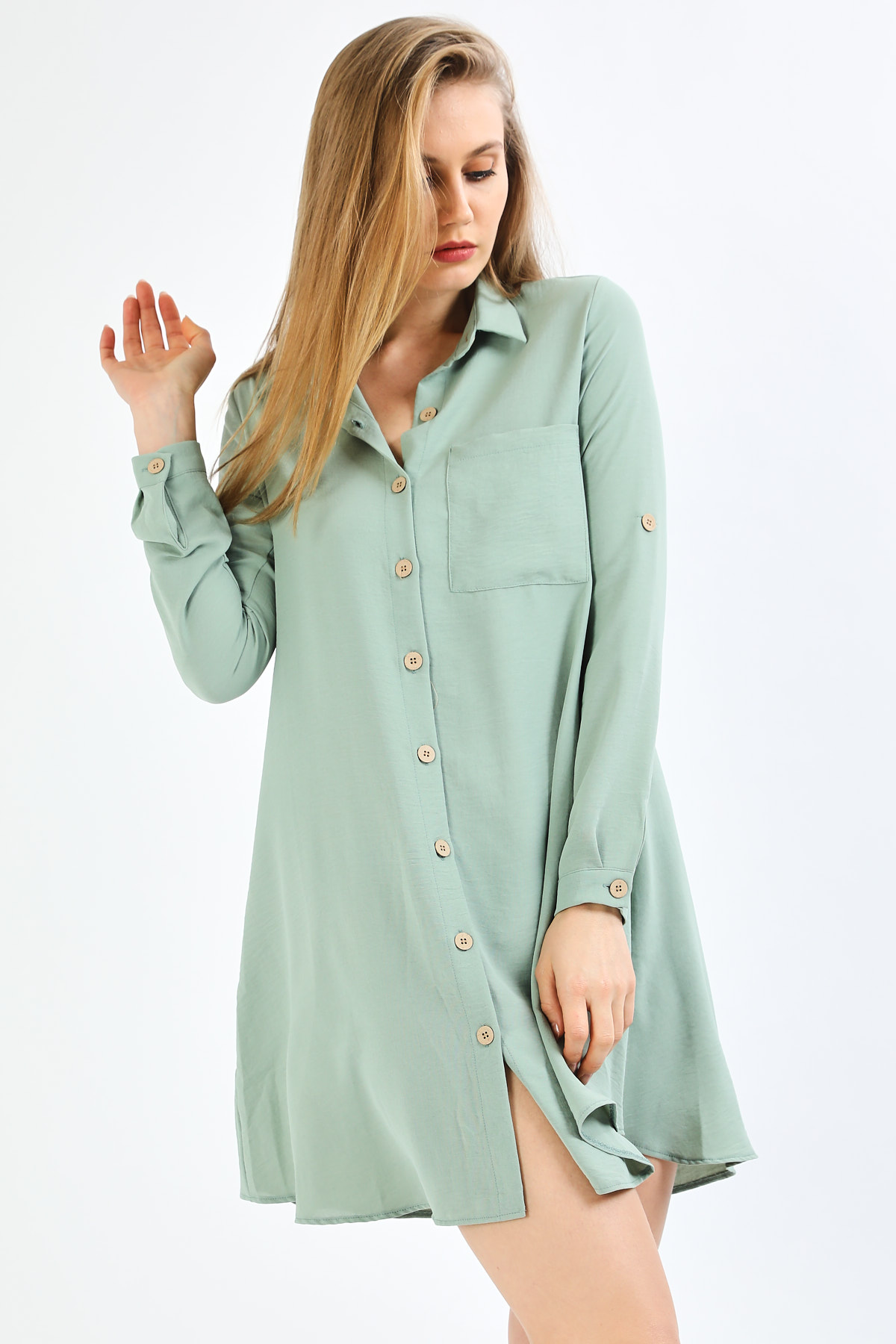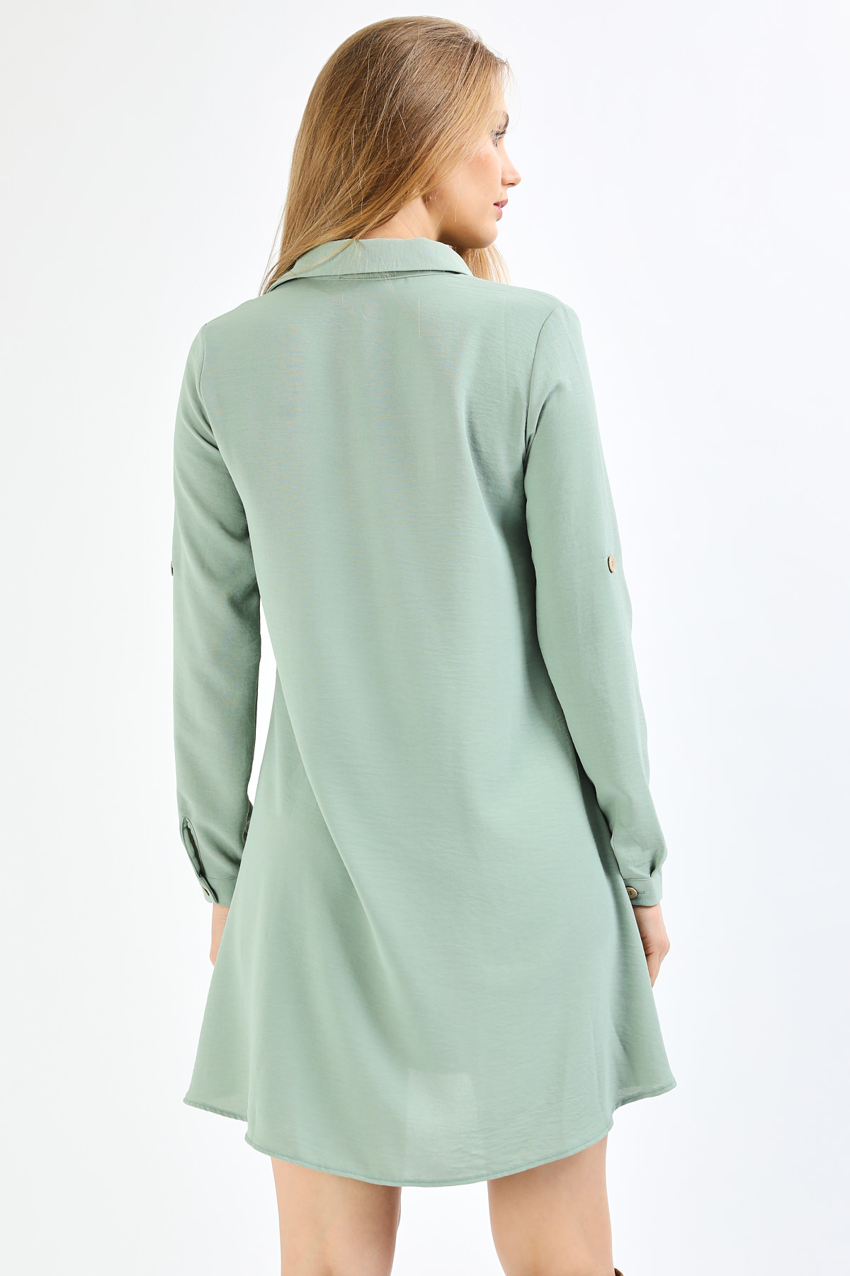 Tahta Düğmeli Su Yeşili Tunik Elbise