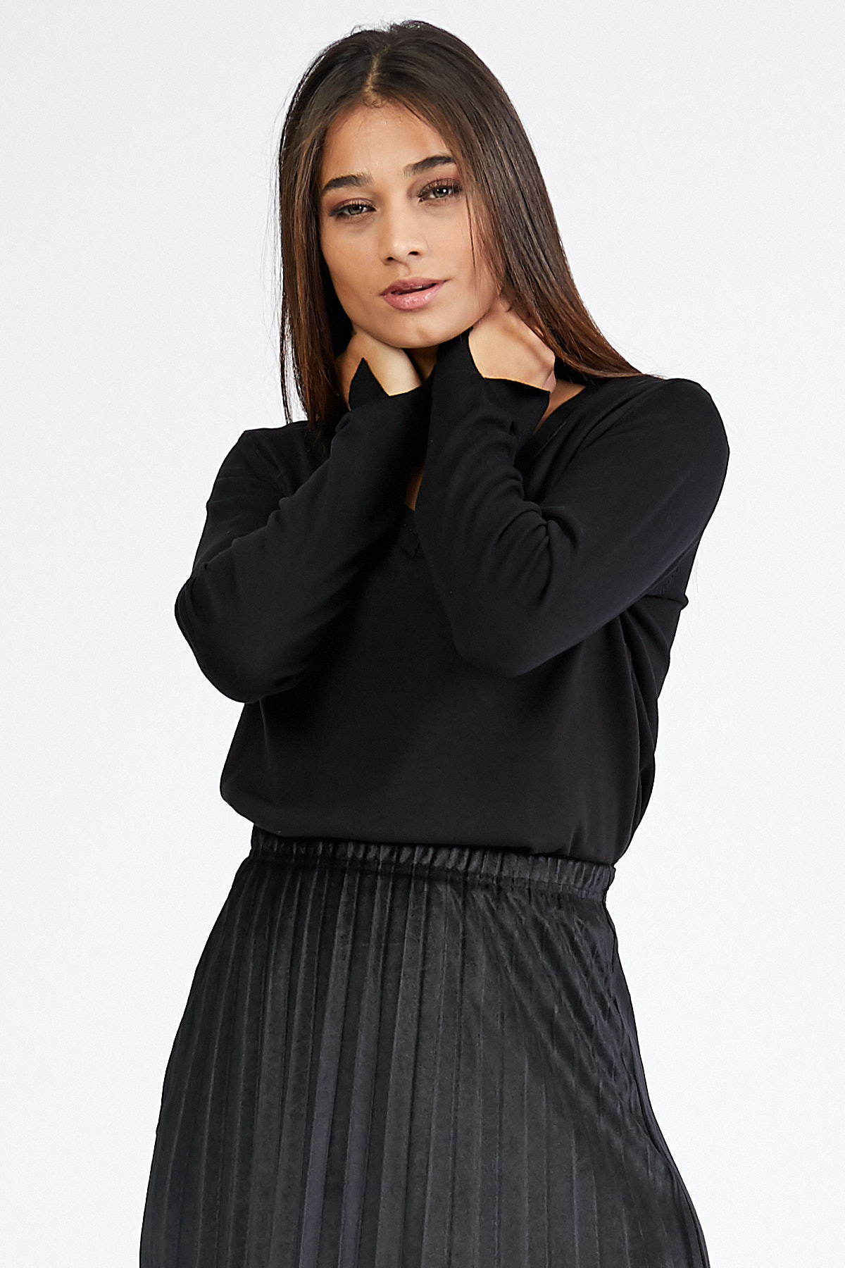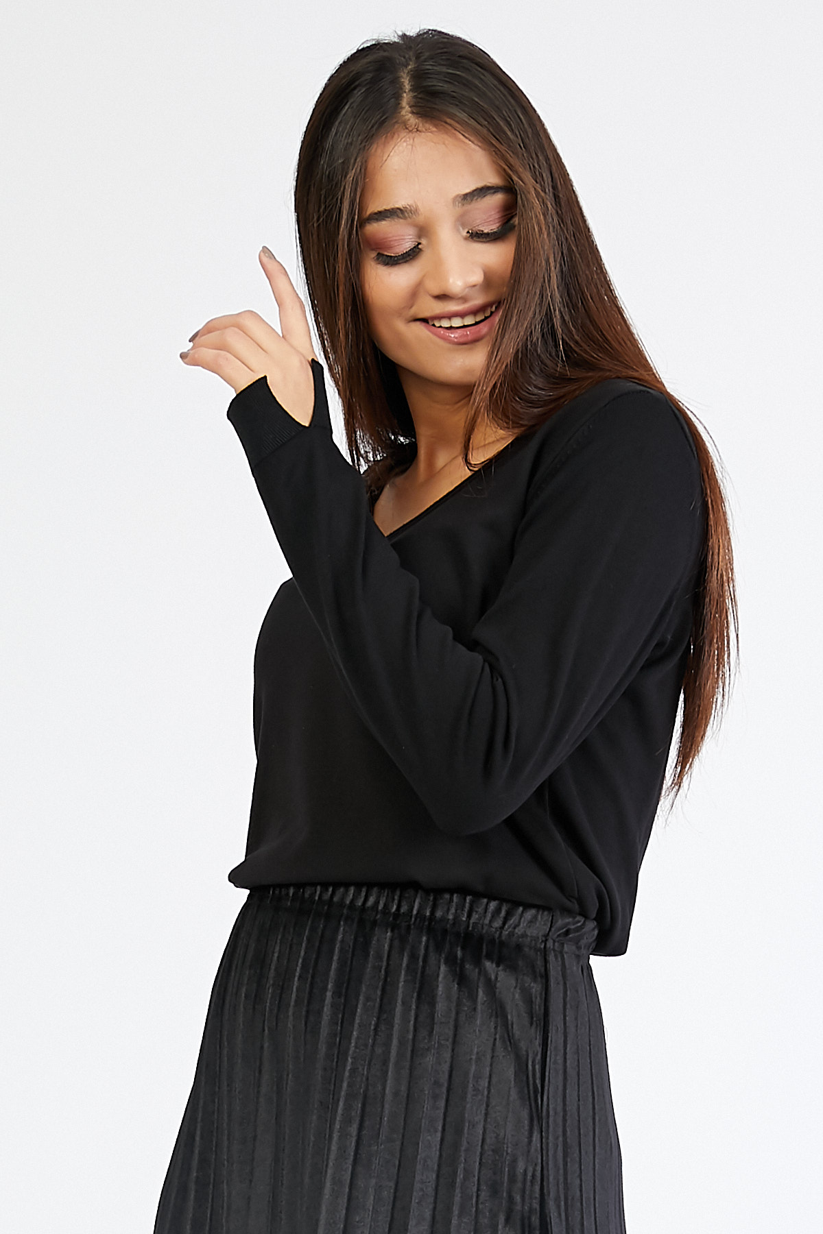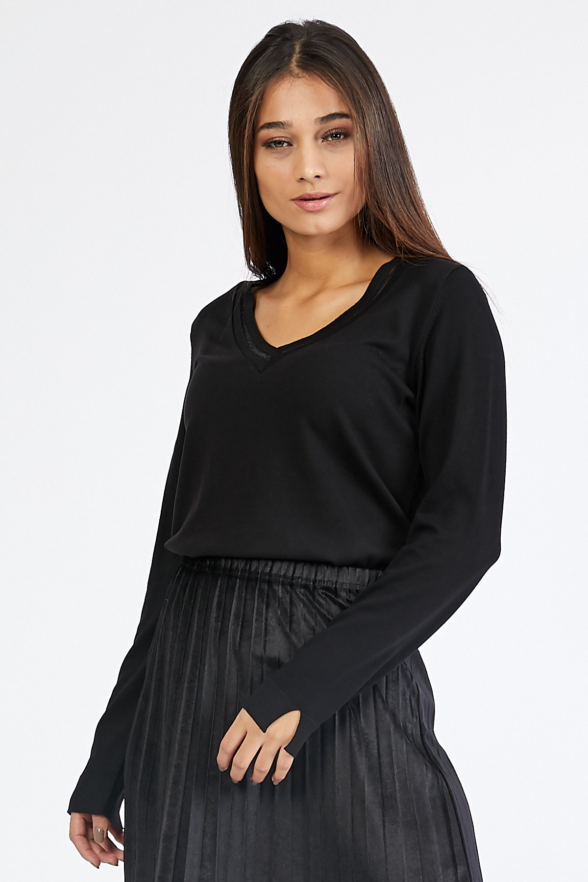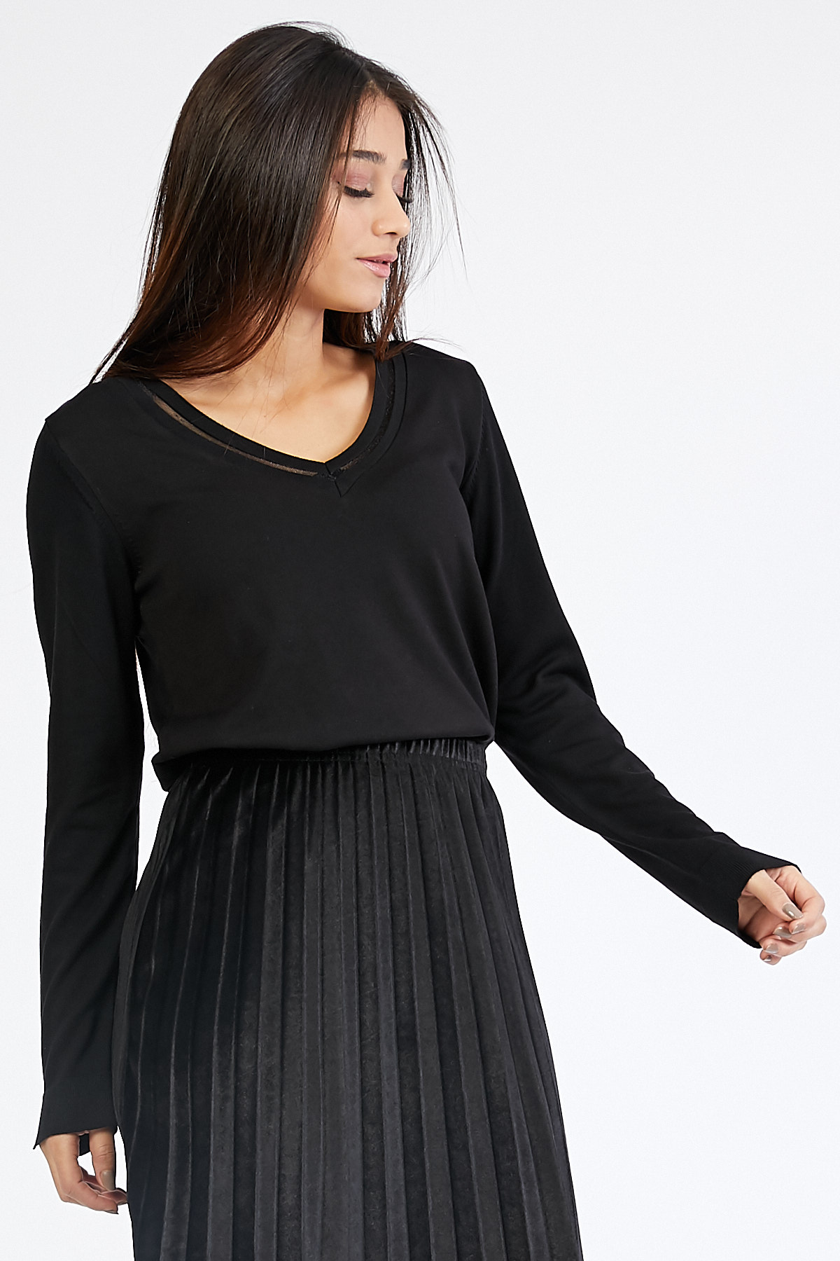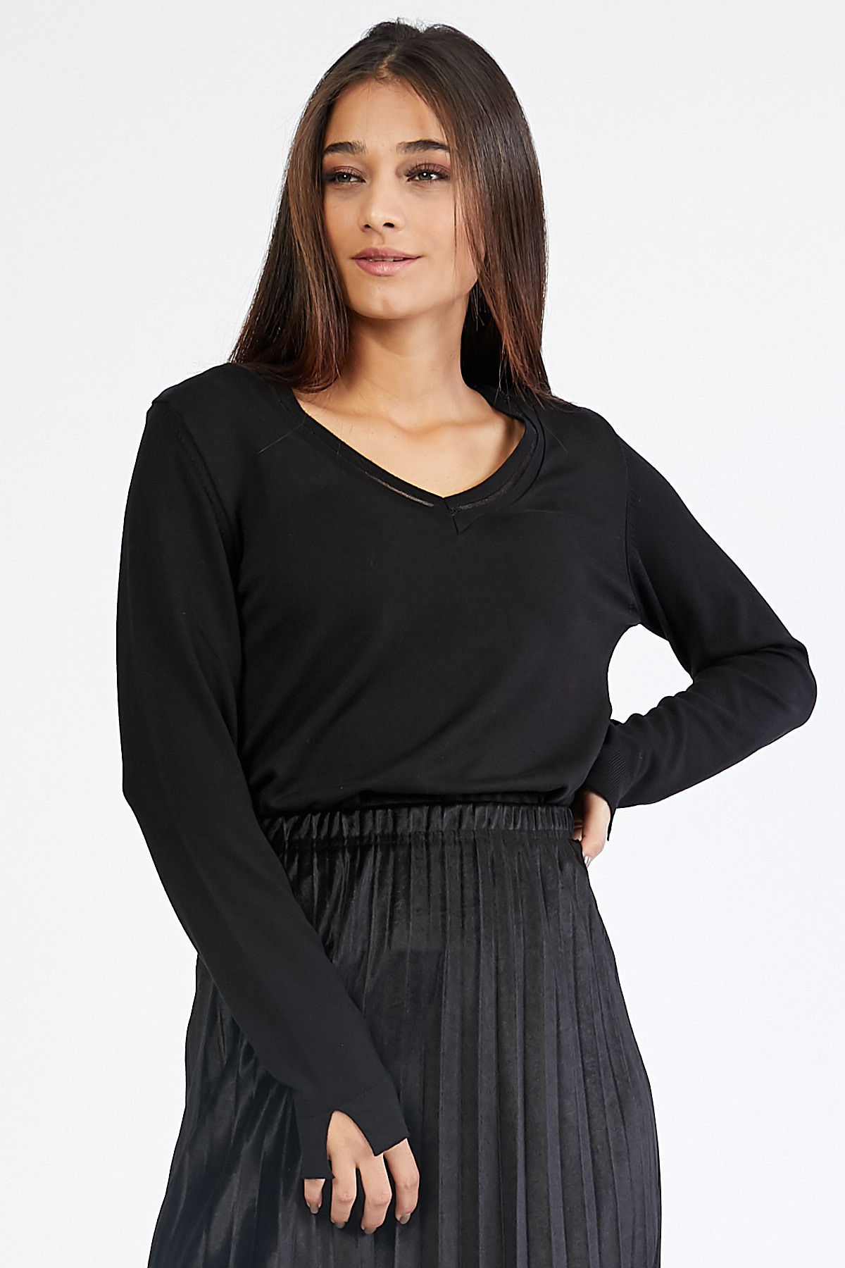 Ürün Özellikleri: V yaka, tül detaylı, tam kalıp kazak.