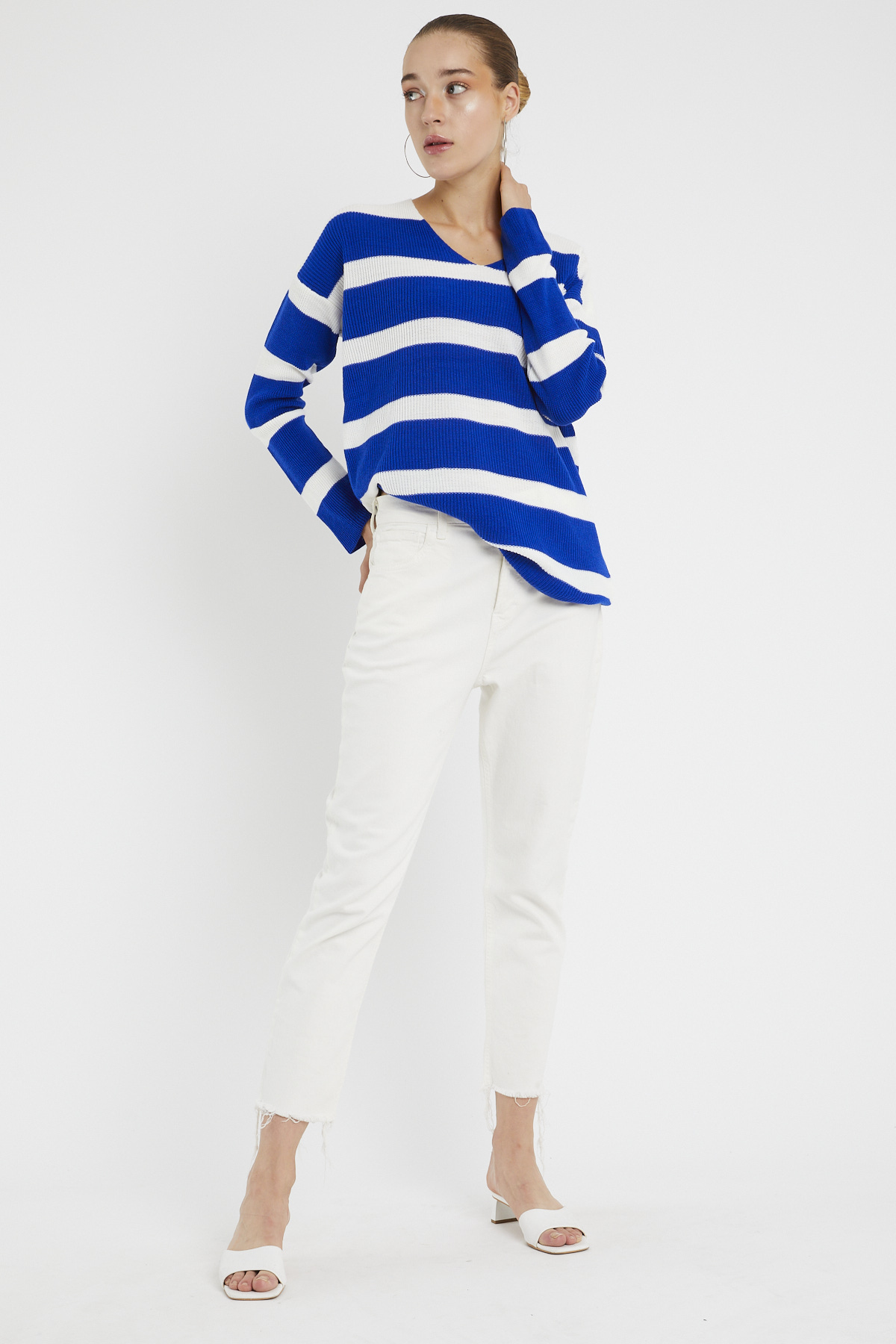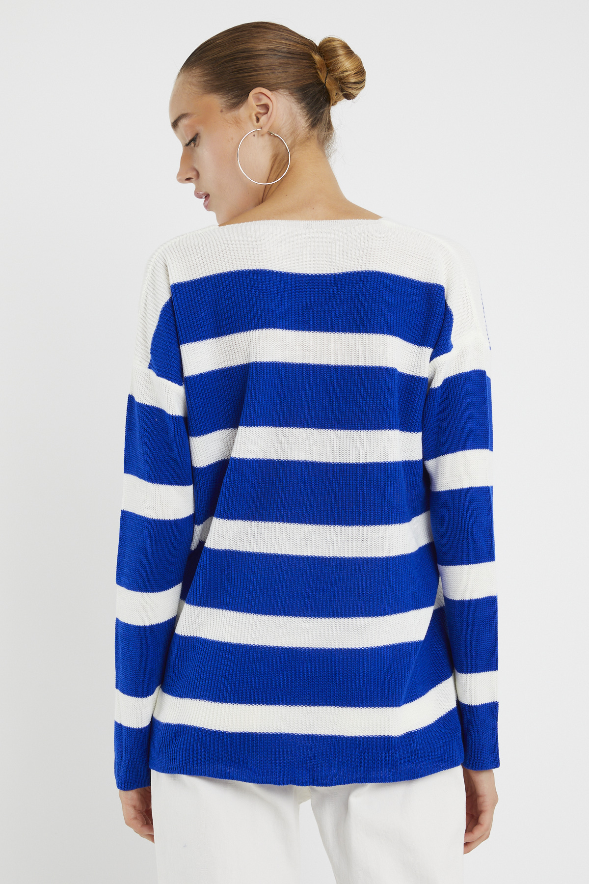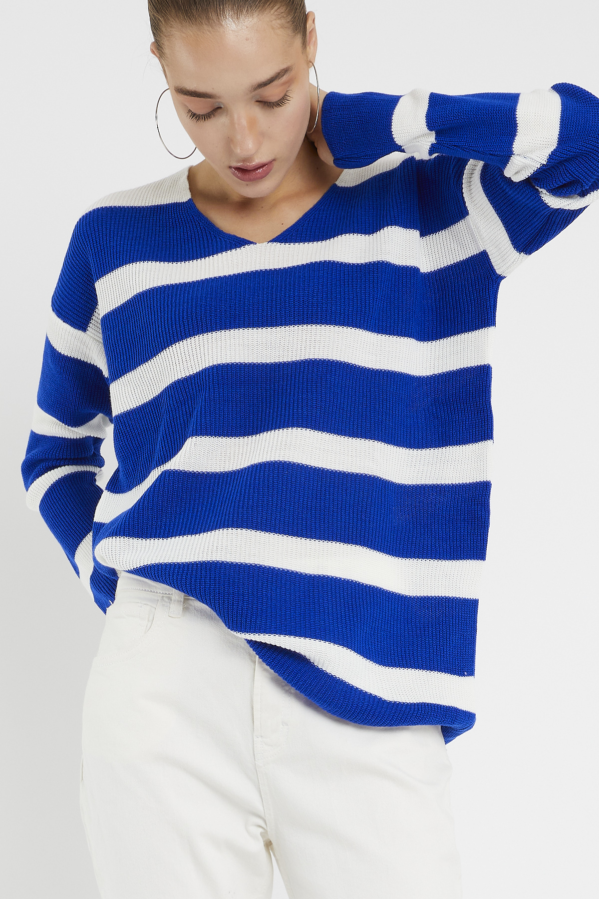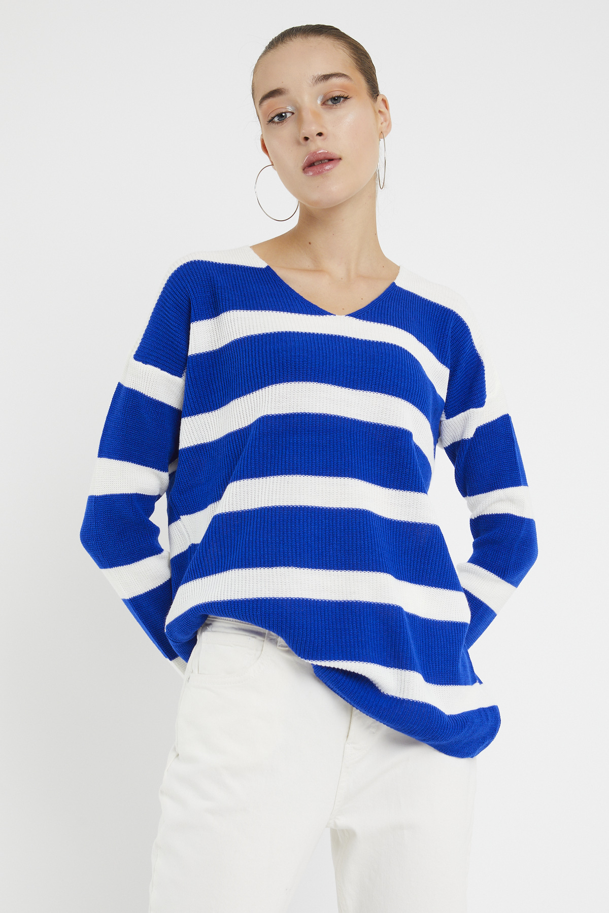 Ürün Özellikleri: V yaka, beyaz çizgili, mevsimlik ince, bol kalıp, uzun kollu kazak.