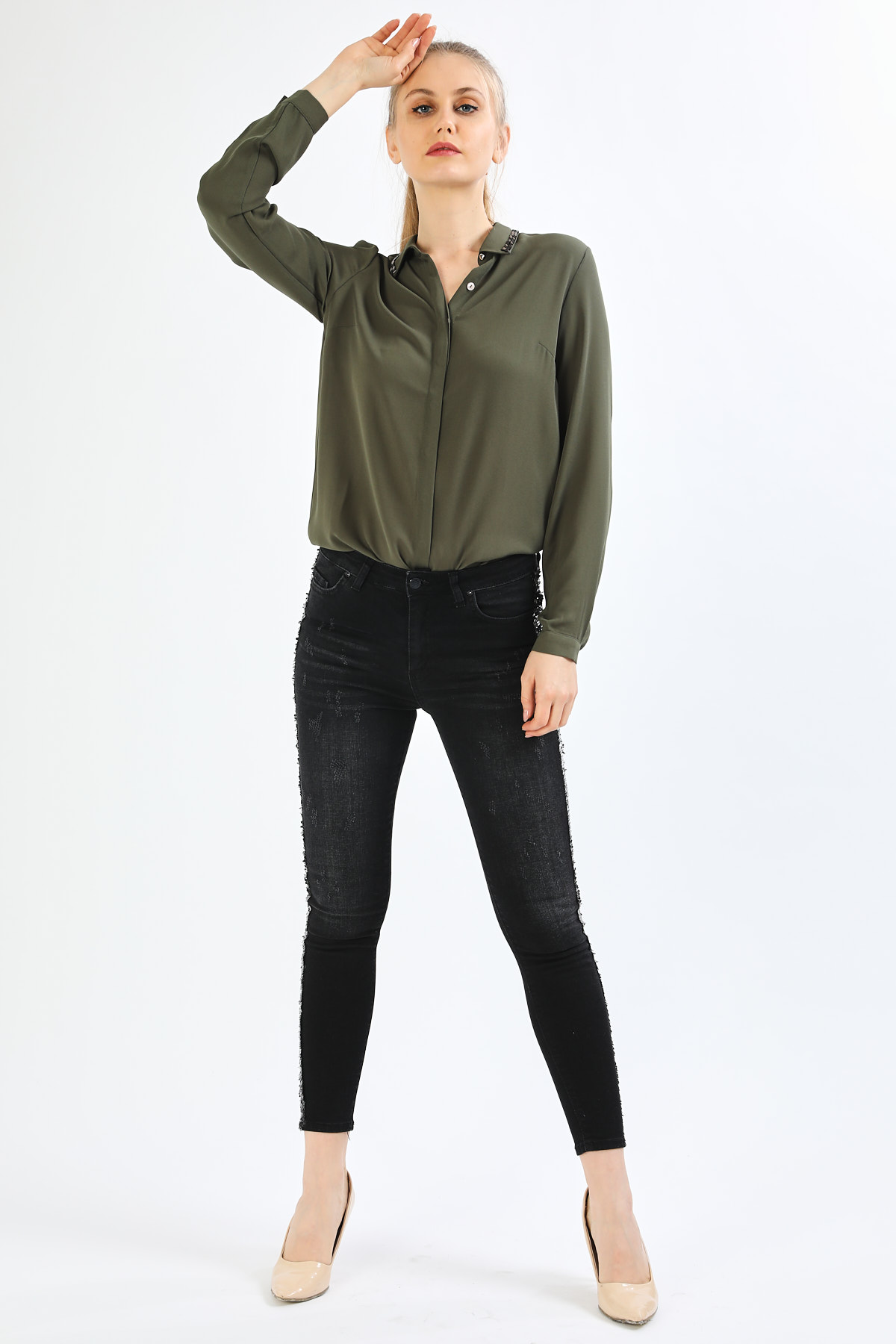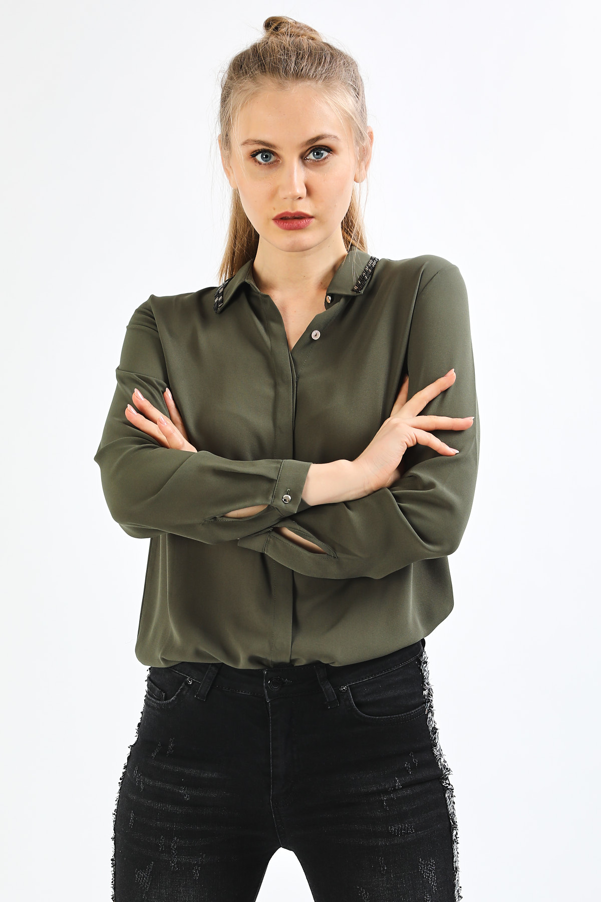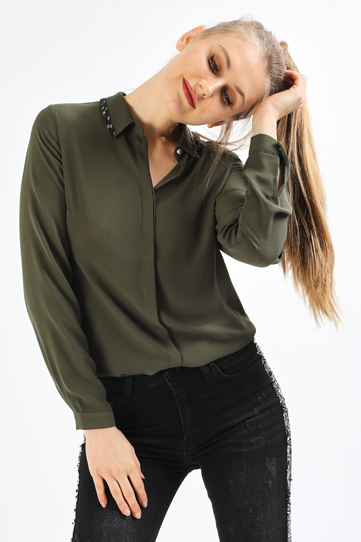 Ürün Özellikleri: Boncuk işlemeli klasik yaka, gizli düğme iliklemeli, tam kalıp, uzun kollu gömlek.