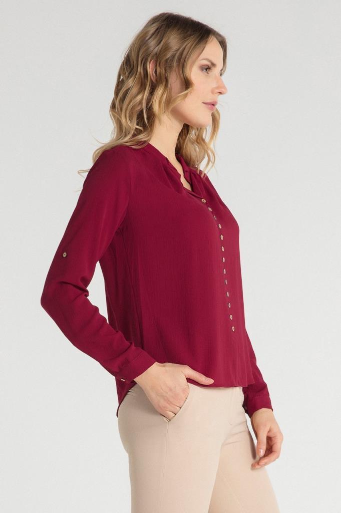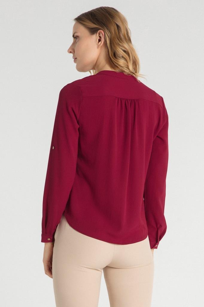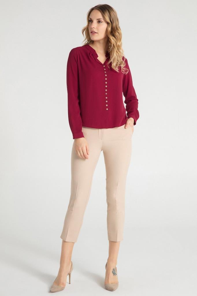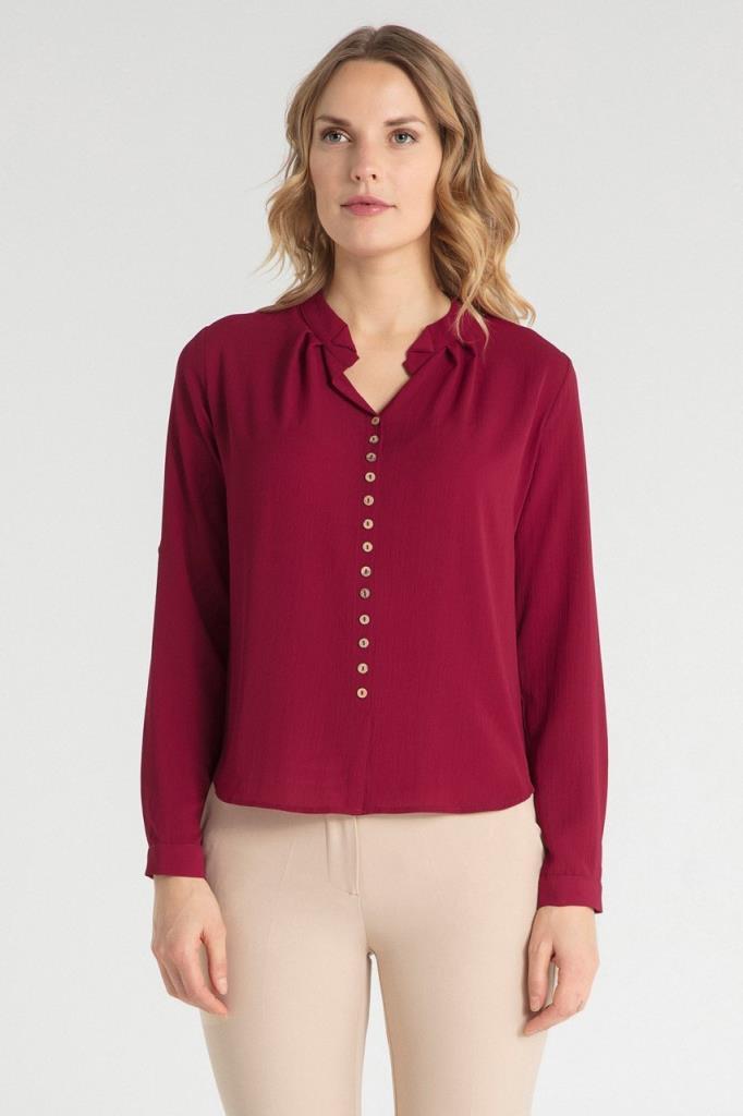Ürün Özellikleri: Ata yaka, tahta düğmeli, bol kalıp, pile özellikli, uzun kollu gömlek.