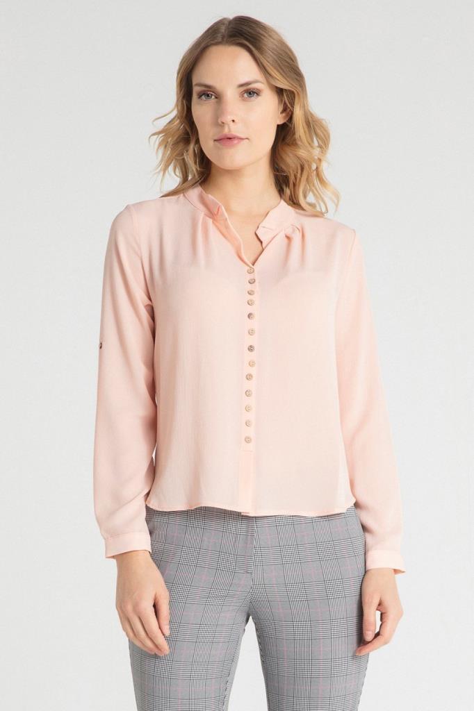 Ürün Özellikleri: Ata yaka, tahta düğmeli, bol kalıp, pile özellikli, uzun kollu gömlek.