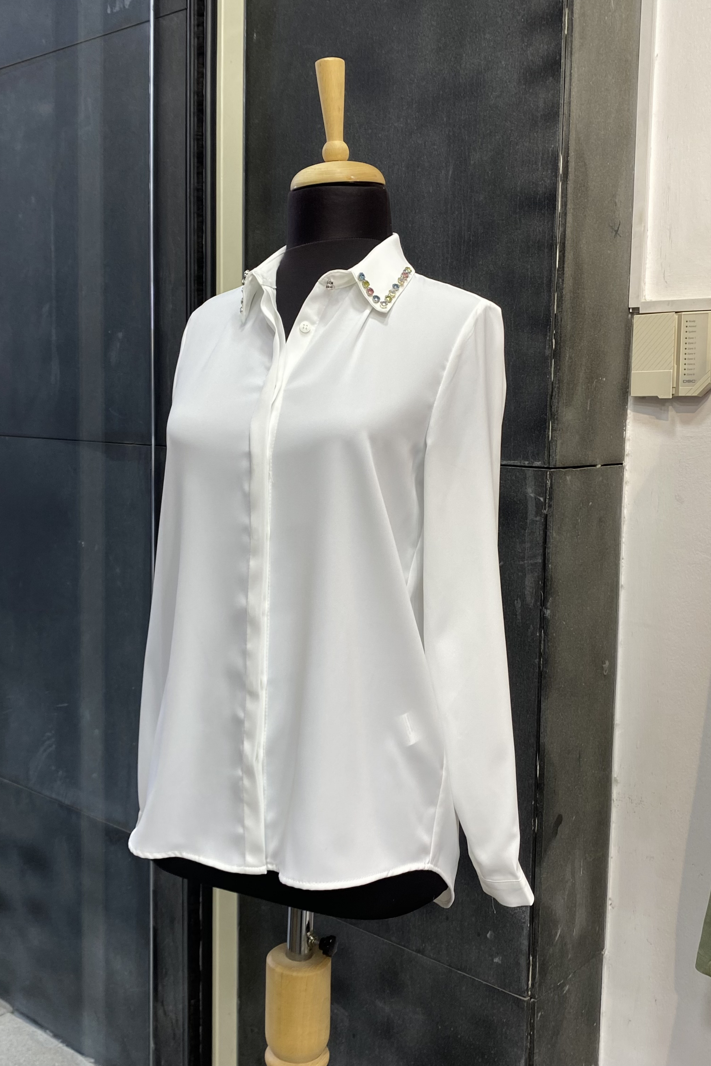 Yakası taş işlemeli bu şık gömlek, sade görünümüne ışıltılı bir dokunuş katarken hem günlük kombinlerinizde hem de özel davetlerde rahatlıkla tercih edebileceğiniz şıklık sunar.