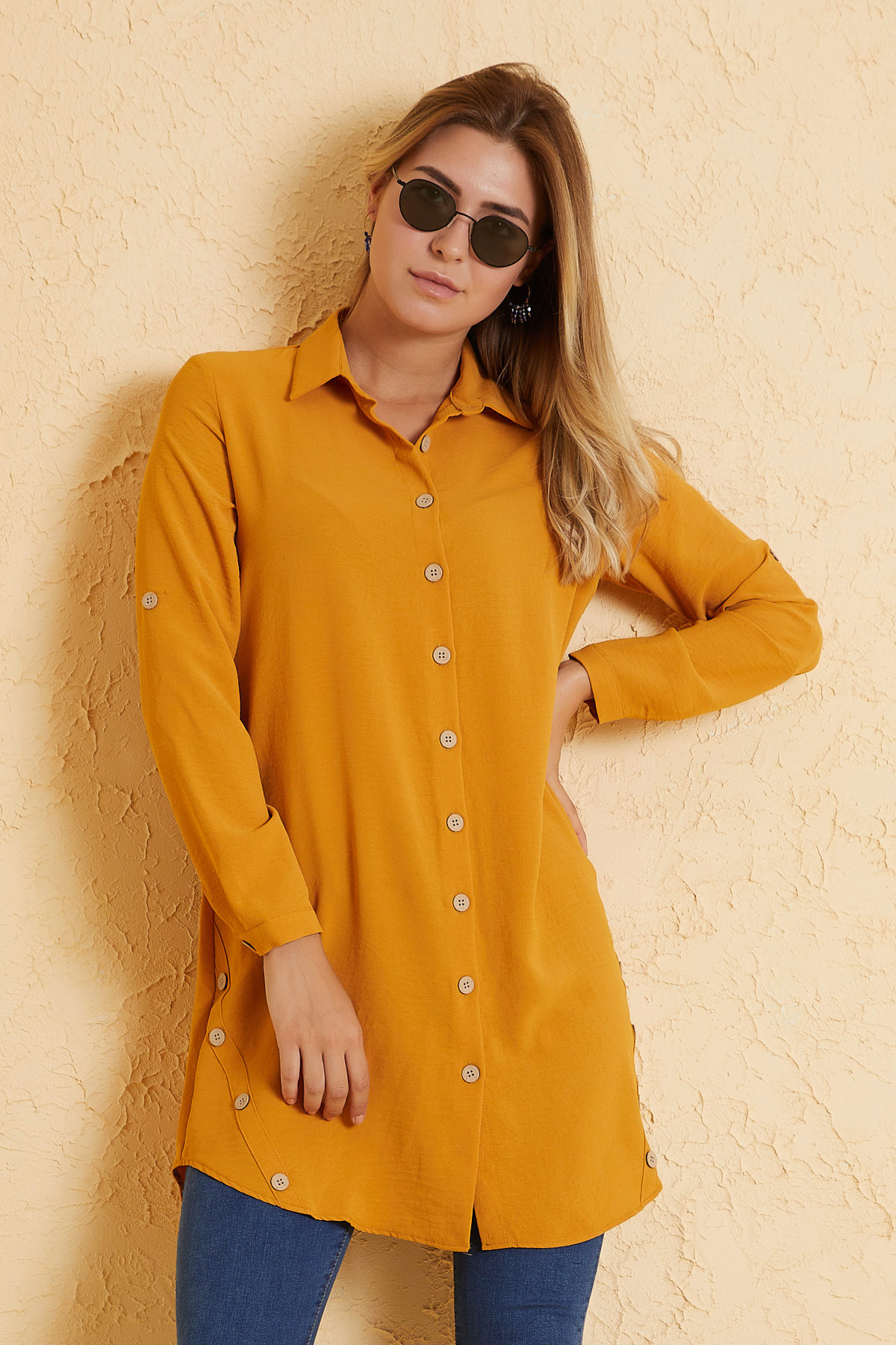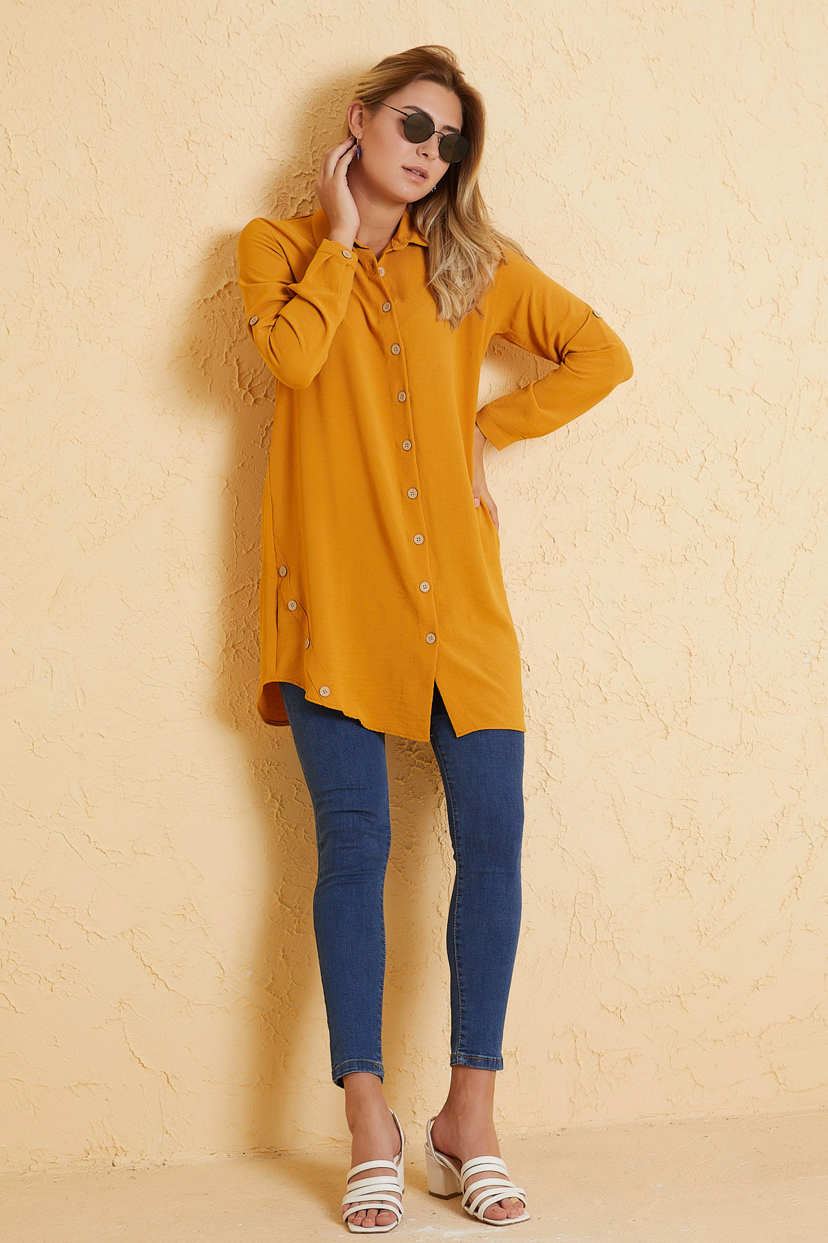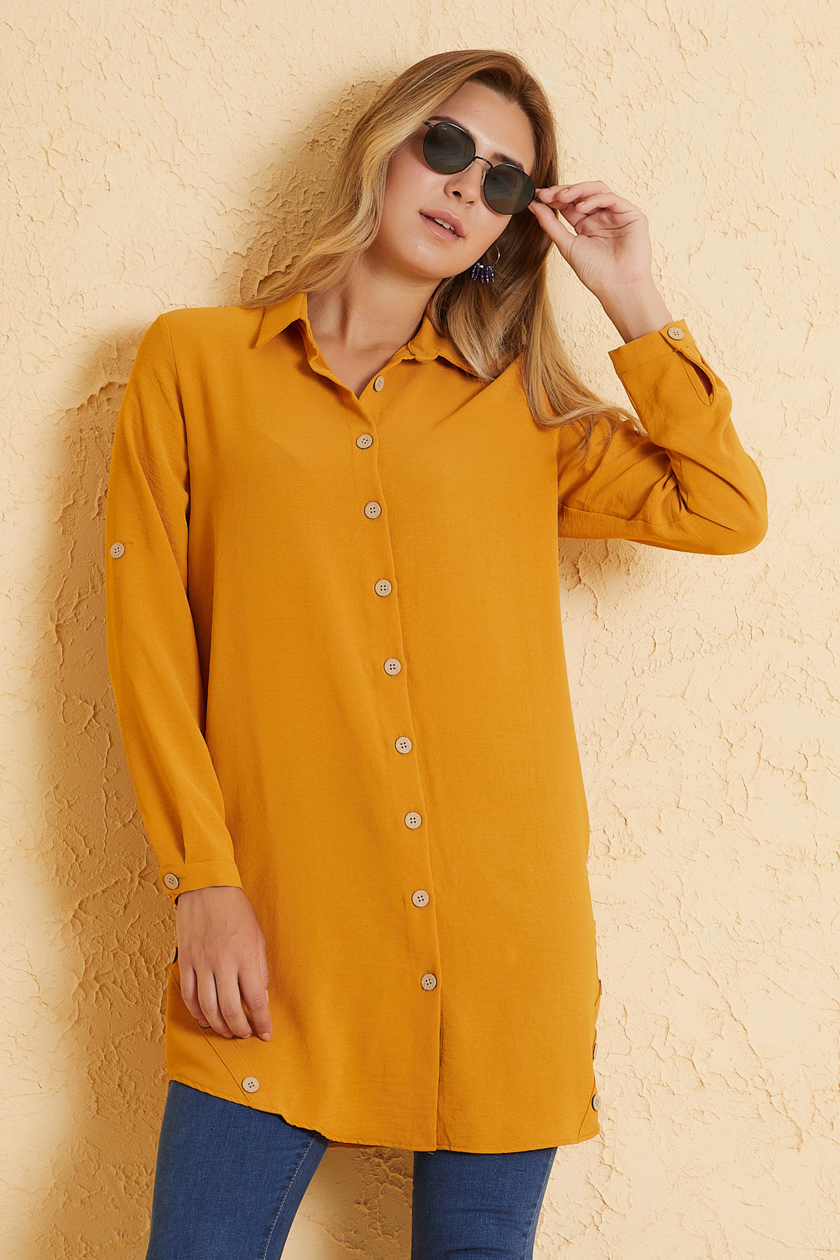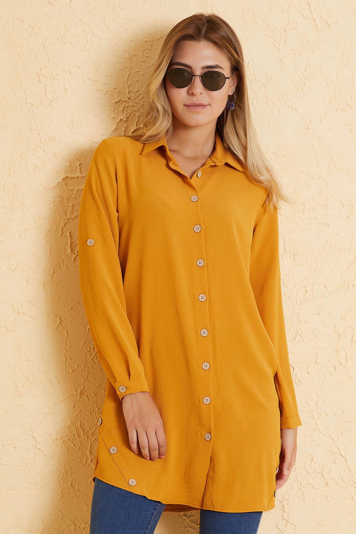 Ürün Özellikleri: Klasik yaka, tahta düğmeli, önü kısa arkası uzun, çan model basic tunik elbise.