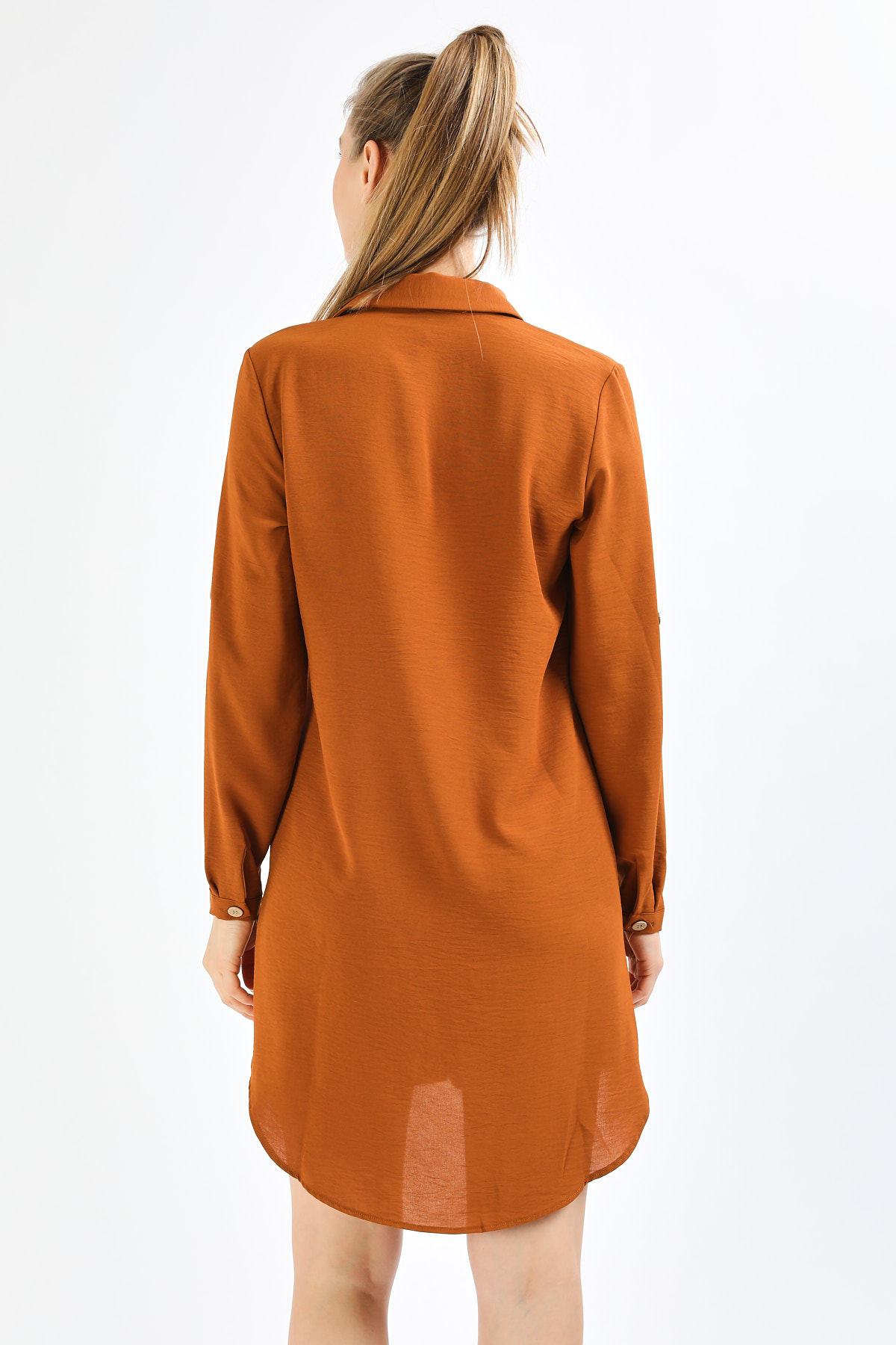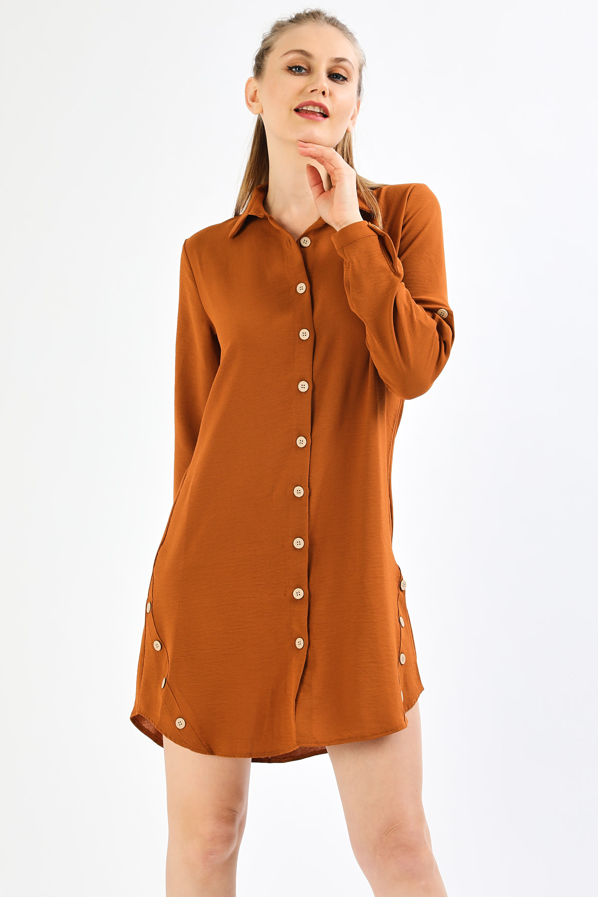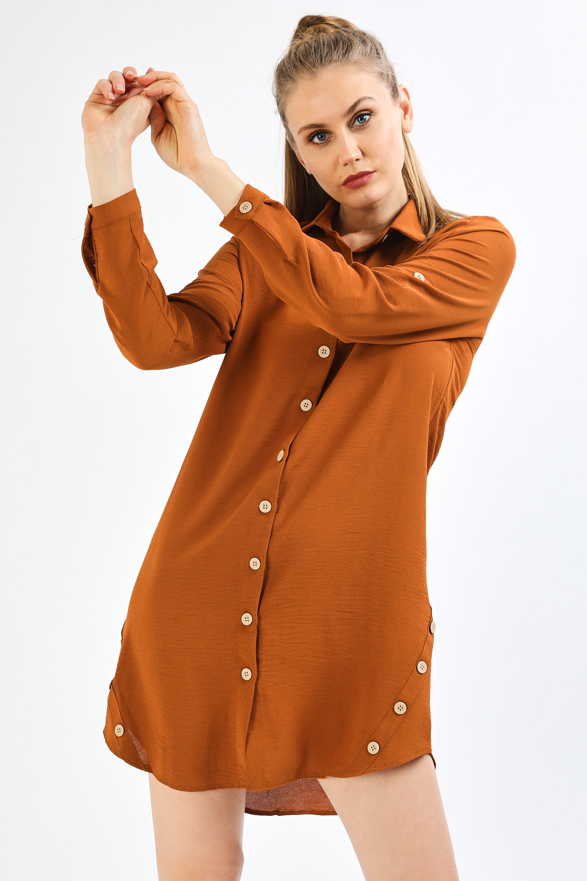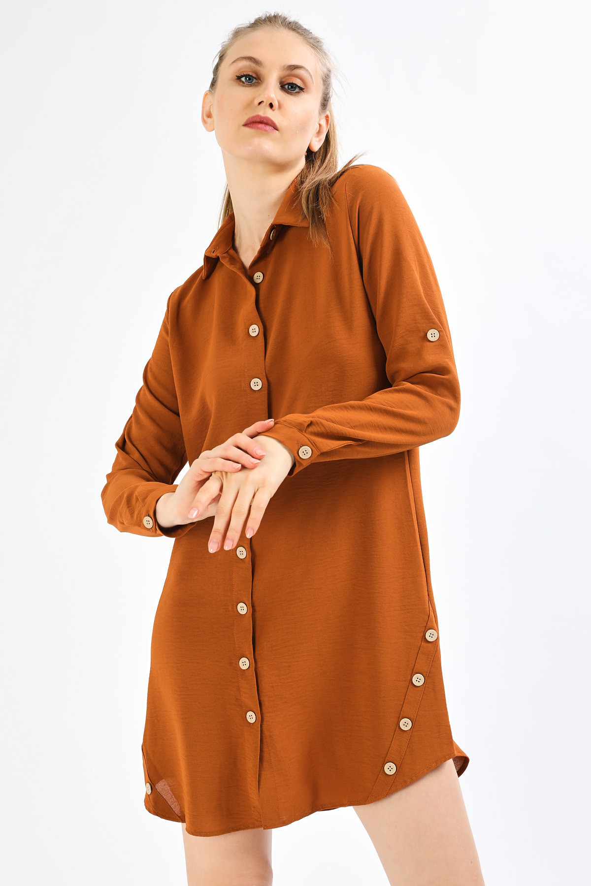 Yanı Tahta Düğmeli Kahverengi Tunik Elbise