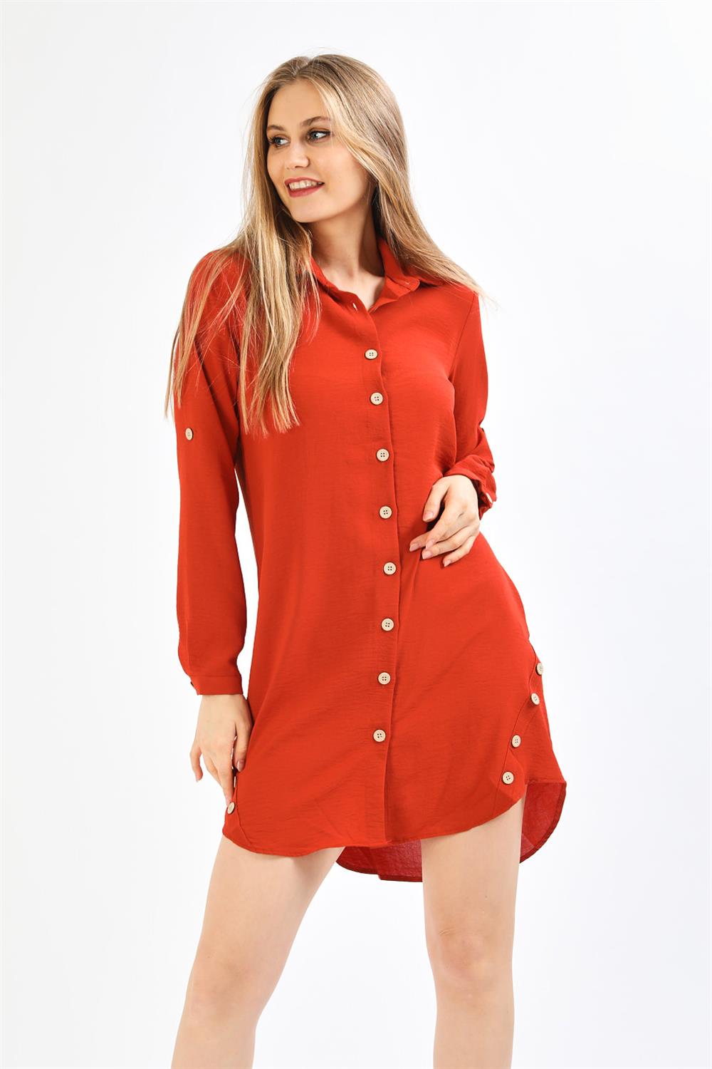 Yanı Tahta Düğmeli Kırmızı Tunik Elbise