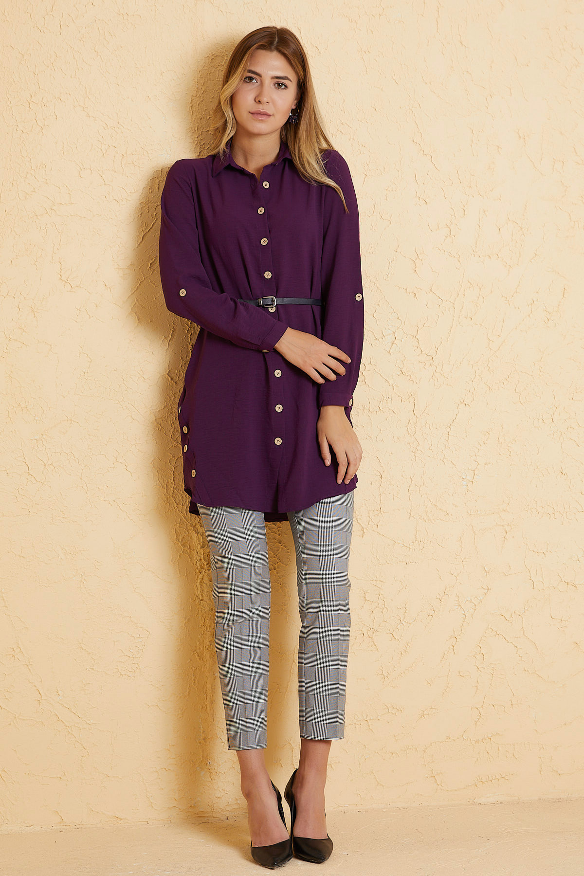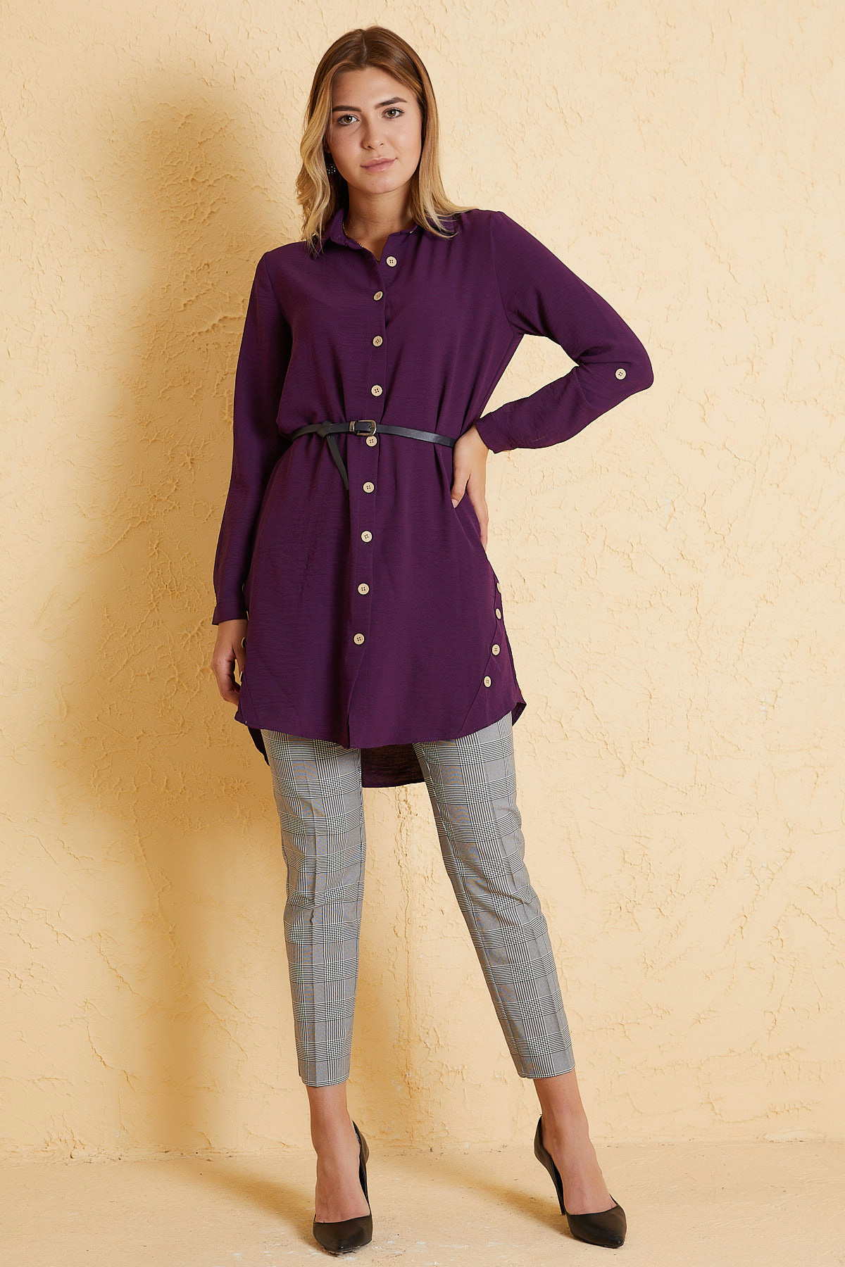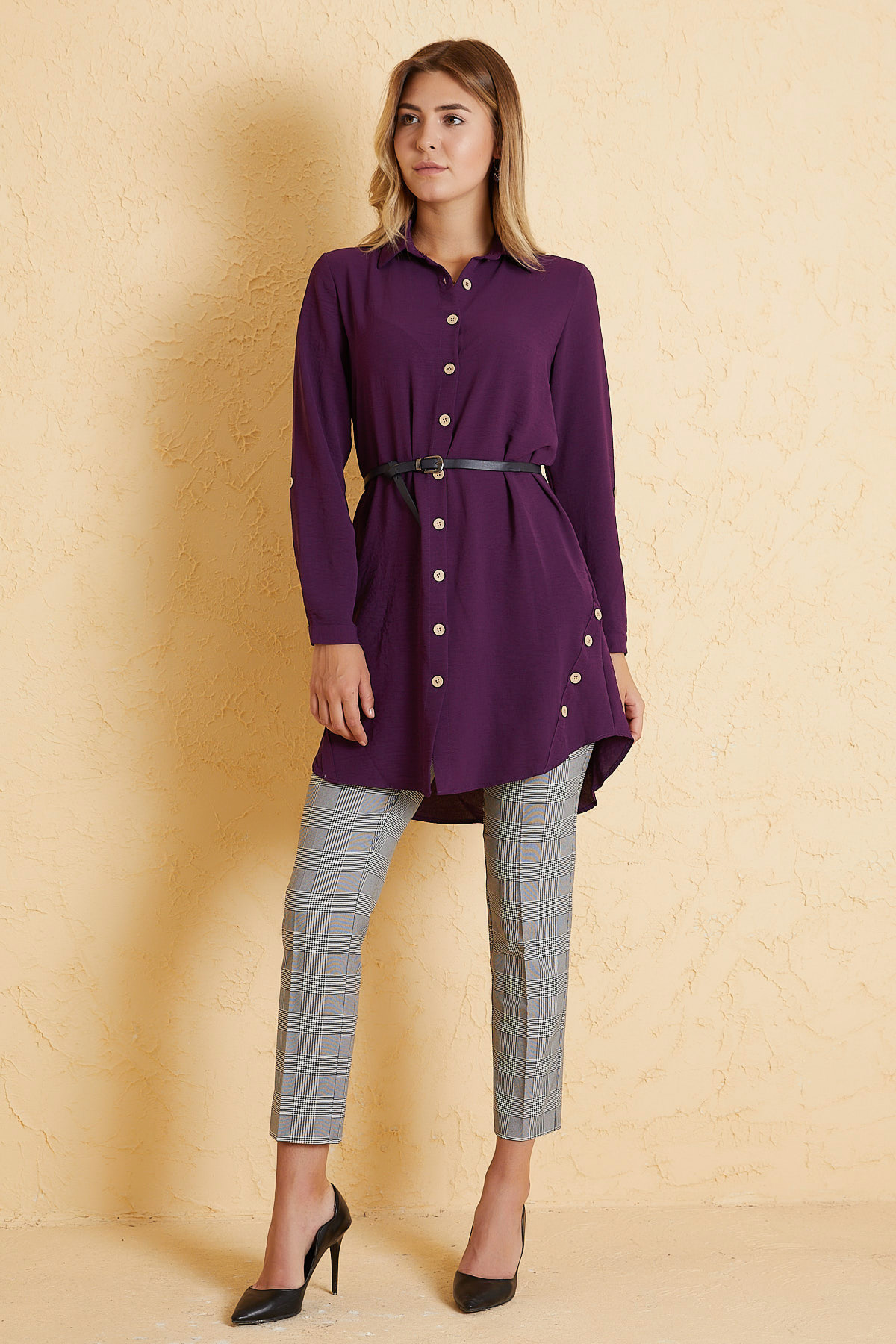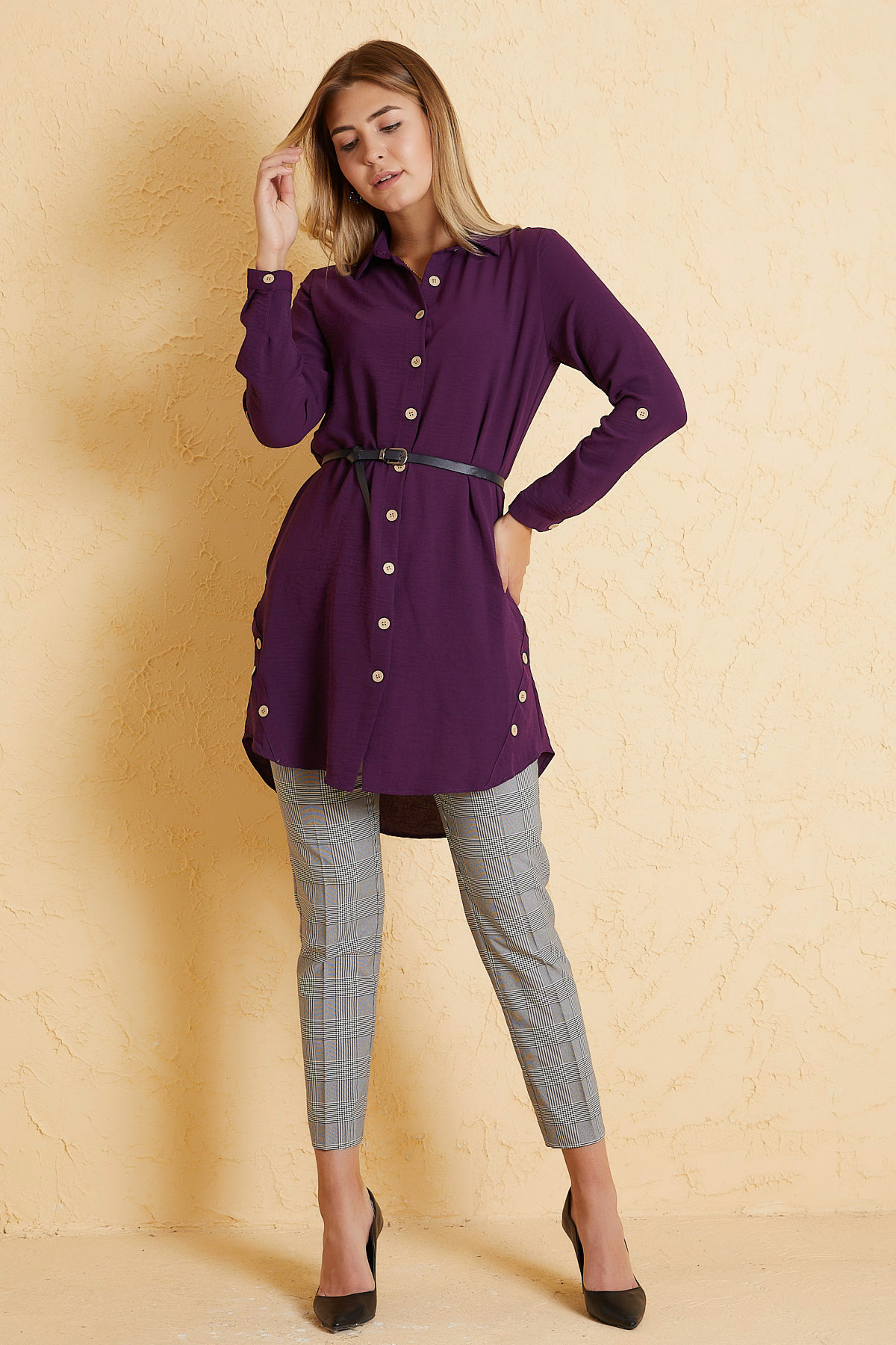 Yanı Tahta Düğmeli Mor Tunik Elbise