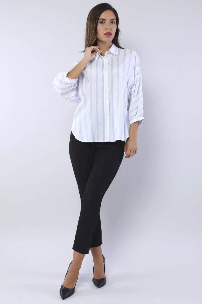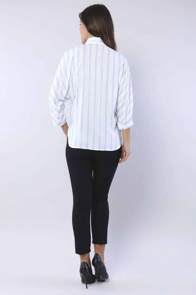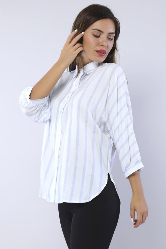 Ürün Özellikleri: Klasik yaka, beyaz düğmeli, bol kalıp, yanları yırtmaç detaylı, yarasa kol gömlek.