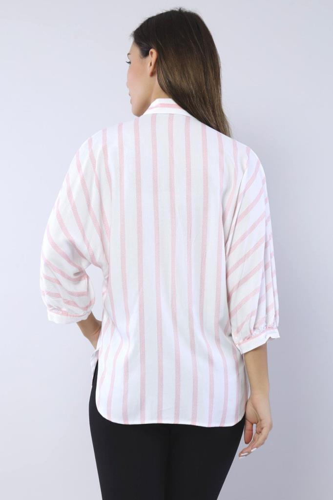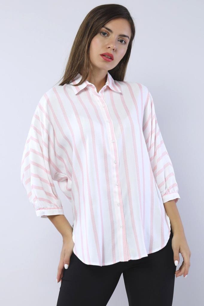 Ürün Özellikleri: Klasik yaka, beyaz düğmeli, bol kalıp, yanları yırtmaç detaylı, yarasa kol gömlek.