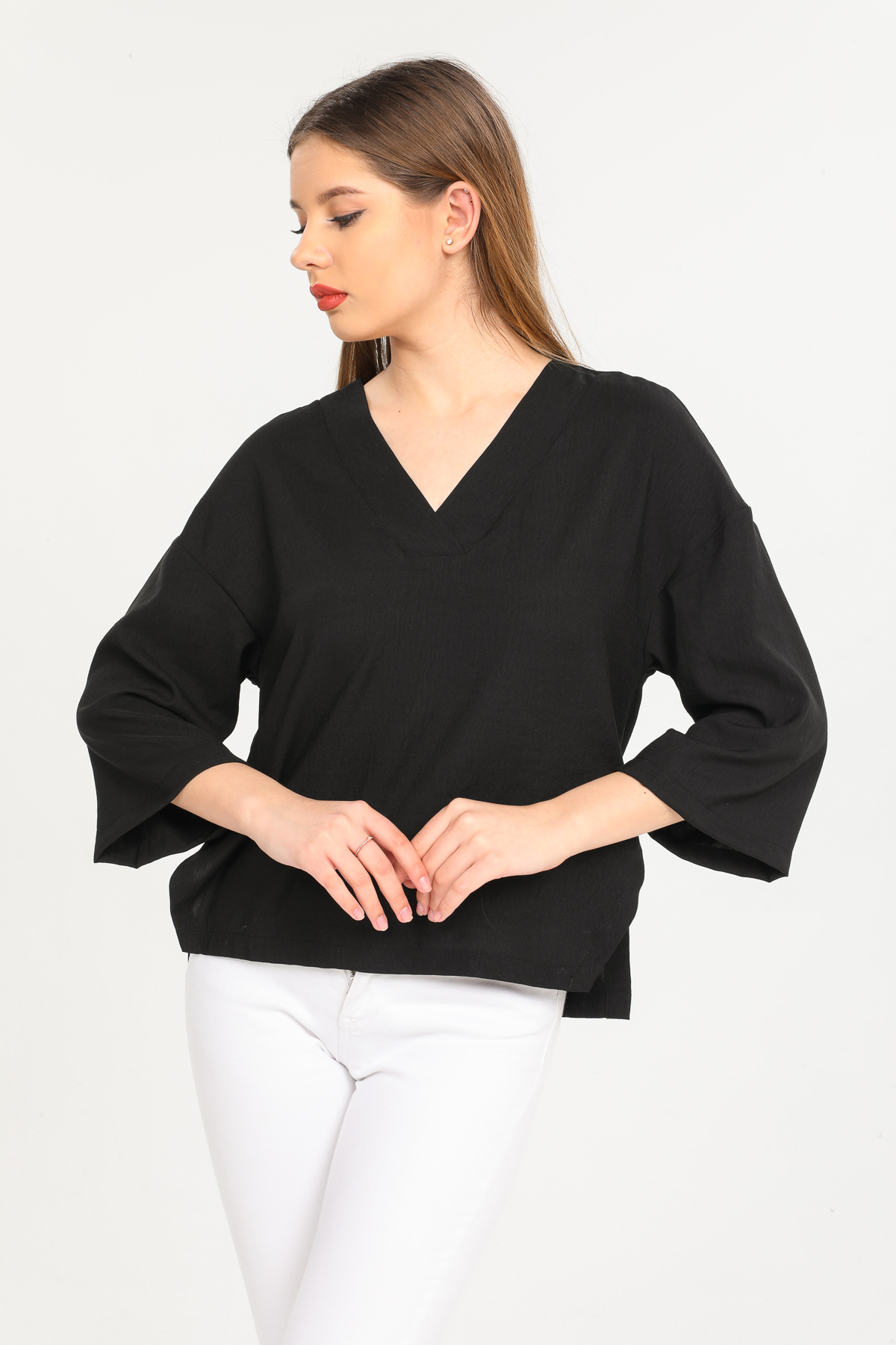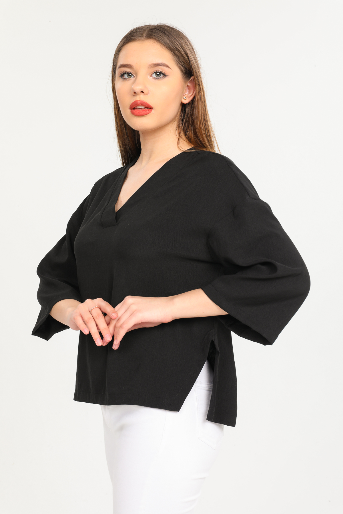 Yırtmaç Detaylı V Yaka Gömlek