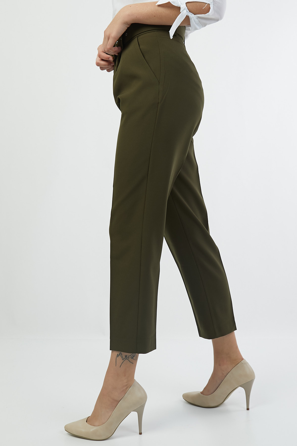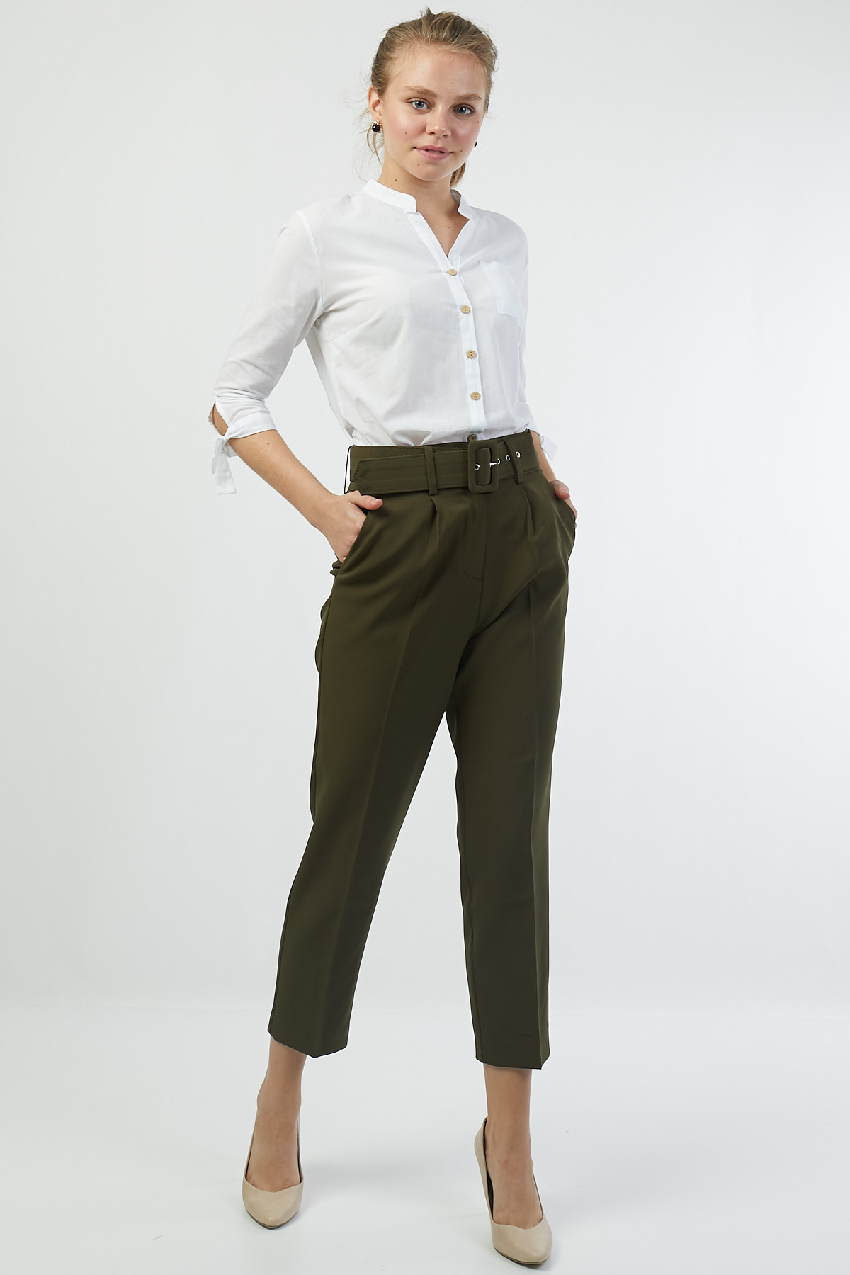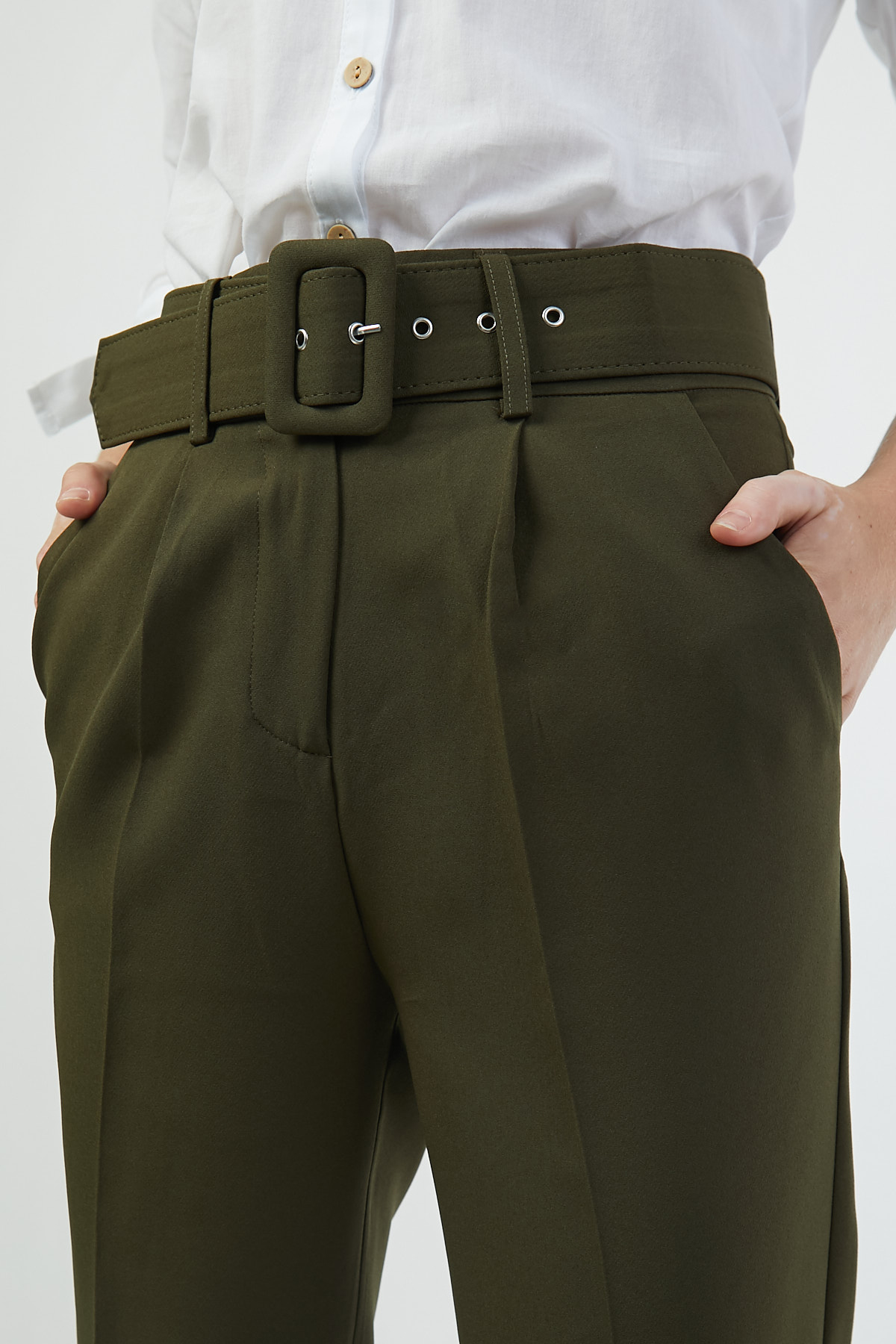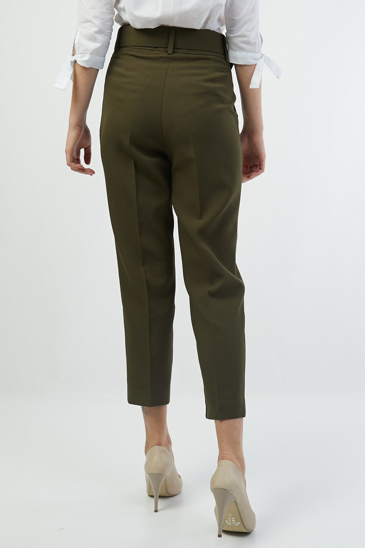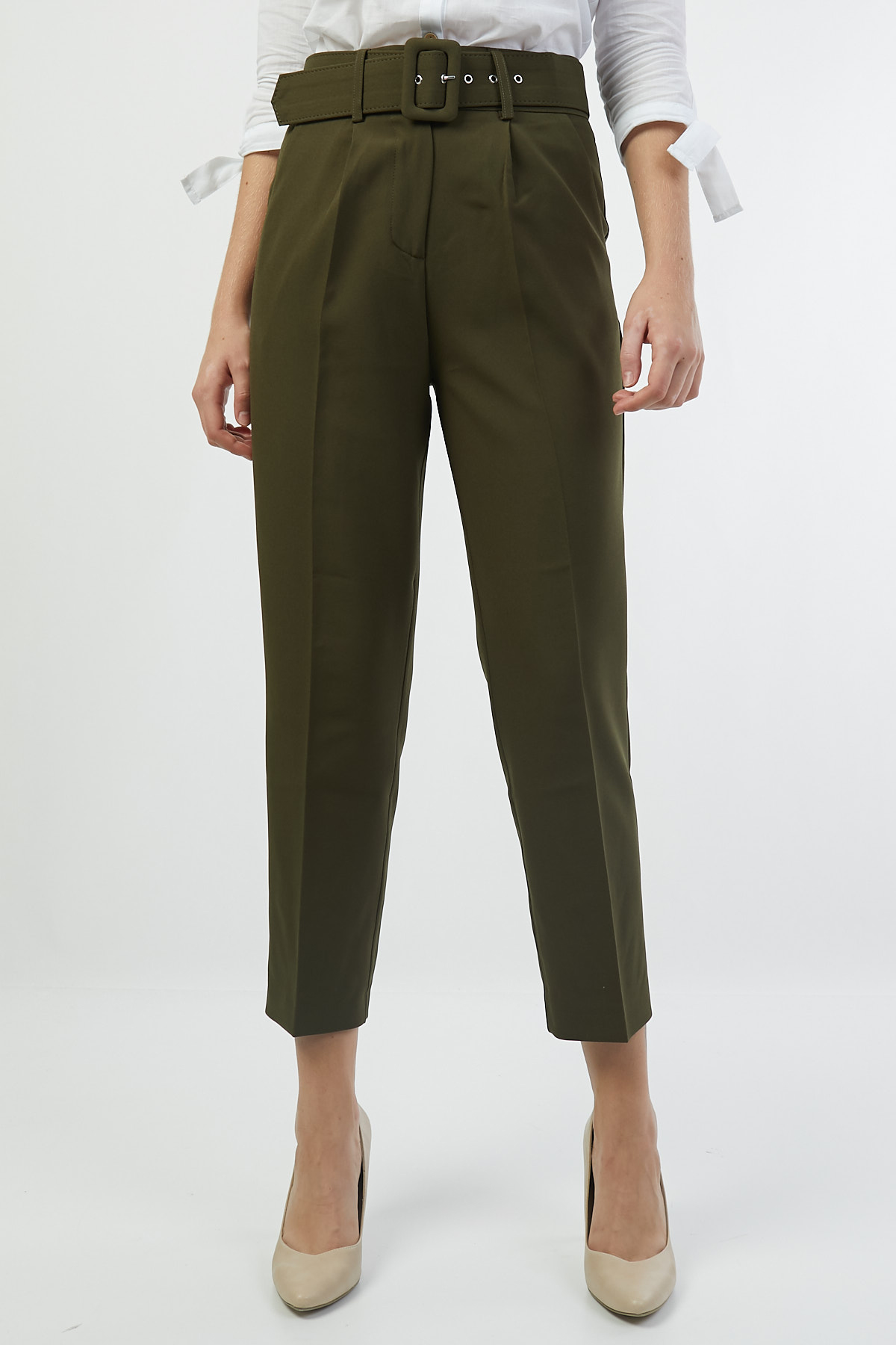 Ürün Özellikleri: Yüksek bel, kemer detaylı, ön cepli, düz paça, havuç kesim, düğme-fermuarlı kapama pantolon.