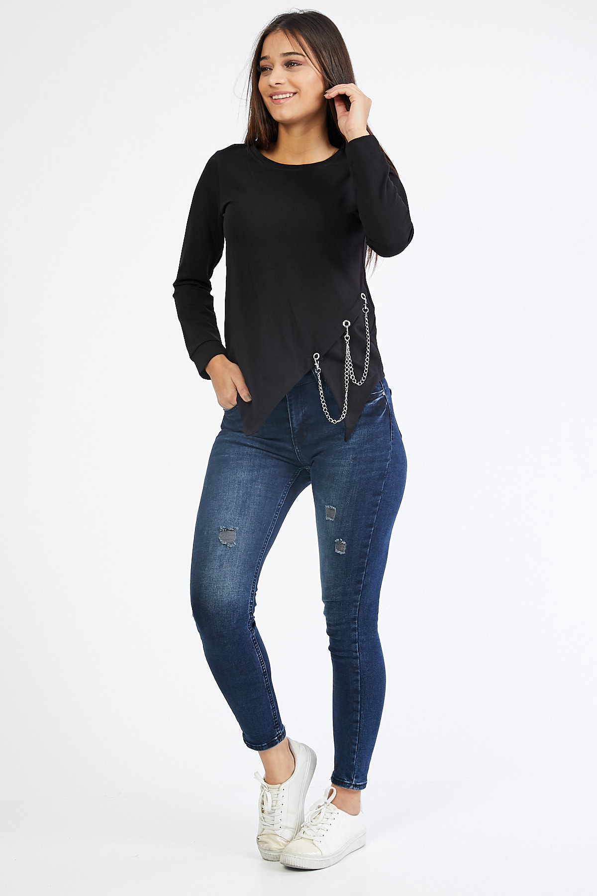 Ürün Özellikleri:Bisiklet yaka, tam kalıp, zincir detaylı, ince triko kazak.